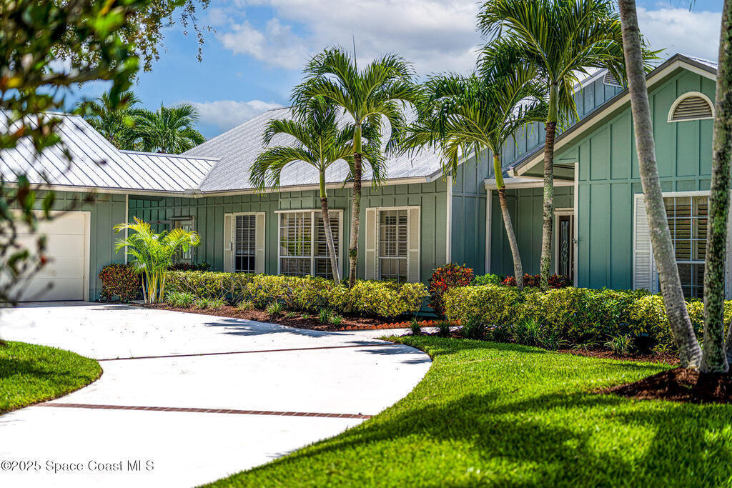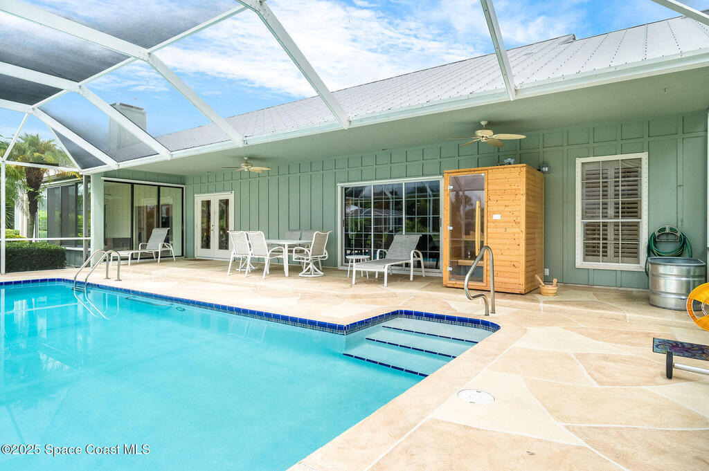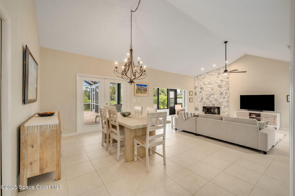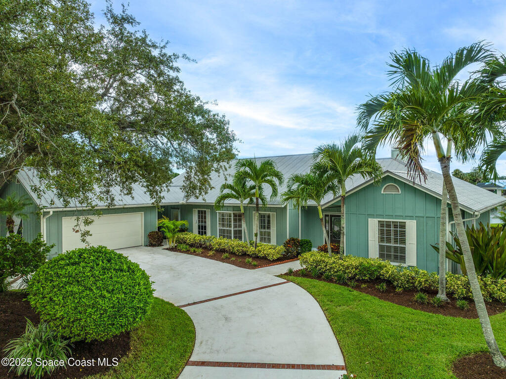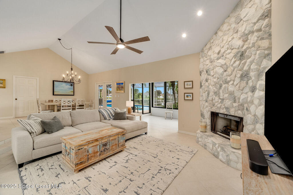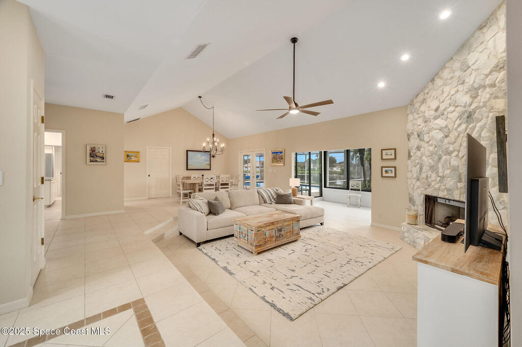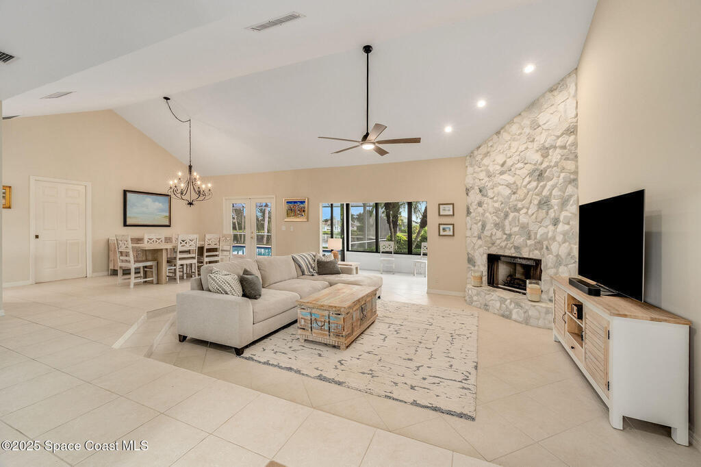 Nestled in the gated community of Cache Cay along the Indian River Lagoon, this meticulously maintained 3BR/2.5BA home blends elegance and comfort. The expansive kitchen offers granite counters, island cooktop, wall oven, and off-white cabinetry. French doors open to a screened pool, patio, & sauna. A sunroom/office, white stone fireplace, crown molding, recessed lighting, and wood & tile floors add charm. The split floor plan ensures privacy, with a two-car garage for convenience. Minutes from the Atlantic and Ocean Drive's dining and shops, this residence captures the best of coastal living.