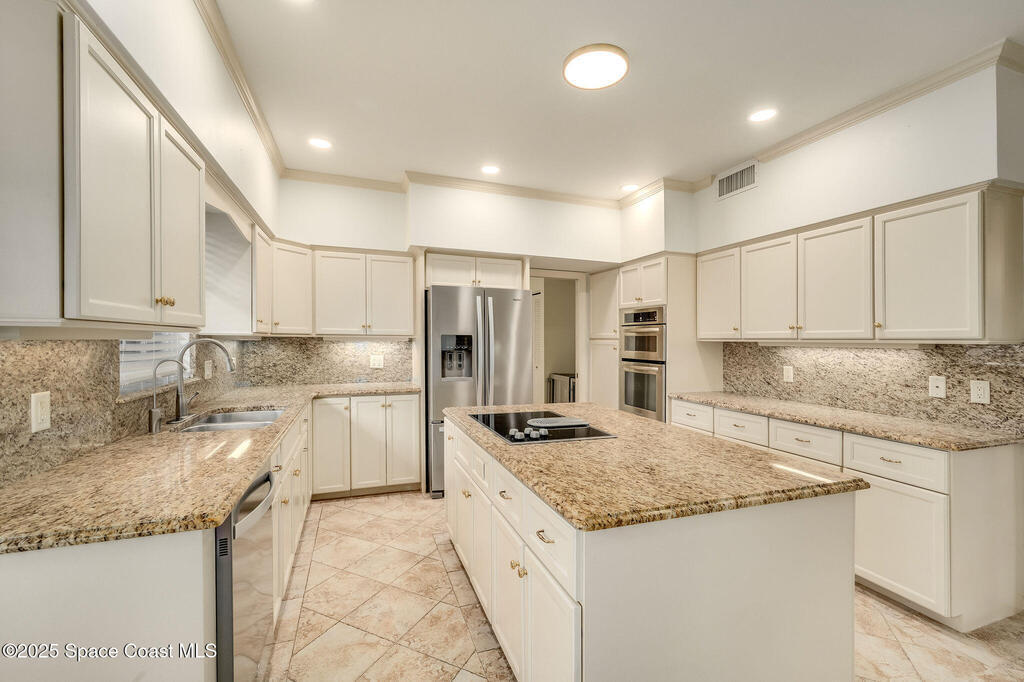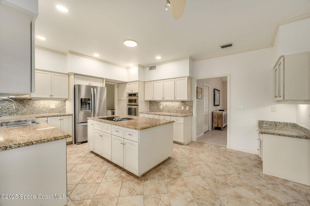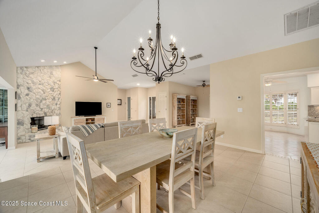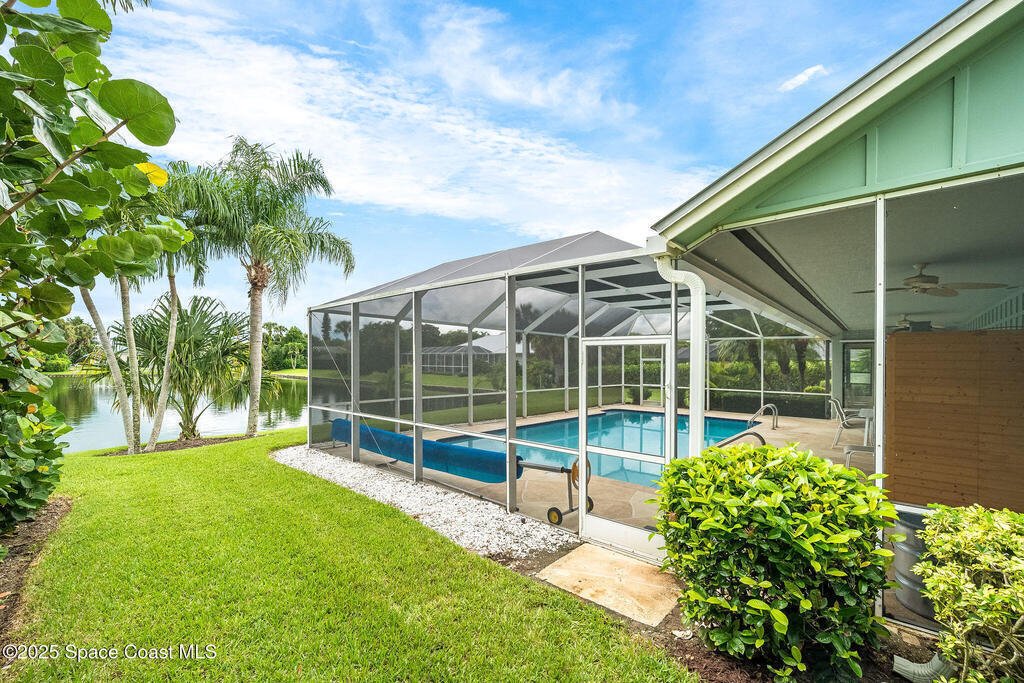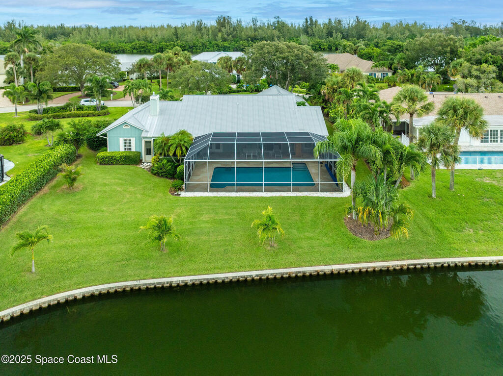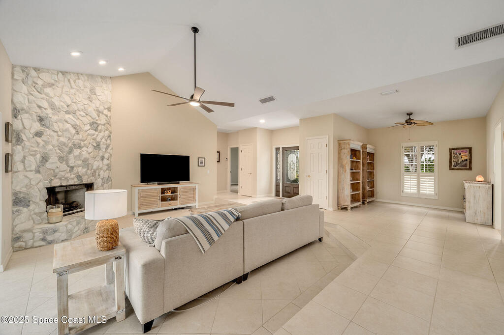 Nestled in the gated community of Cache Cay along the Indian River Lagoon, this meticulously maintained 3BR/2.5BA home blends elegance and comfort. The expansive kitchen offers granite counters, island cooktop, wall oven, and off-white cabinetry. French doors open to a screened pool, patio, & sauna. A sunroom/office, white stone fireplace, crown molding, recessed lighting, and wood & tile floors add charm. The split floor plan ensures privacy, with a two-car garage for convenience. Minutes from the Atlantic and Ocean Drive's dining and shops, this residence captures the best of coastal living.