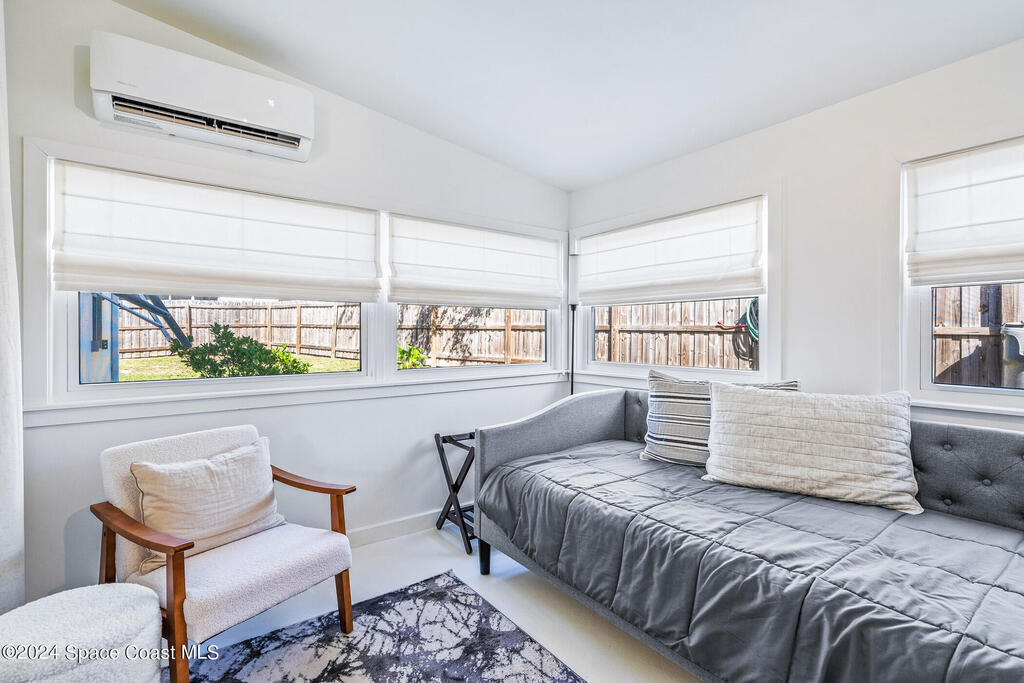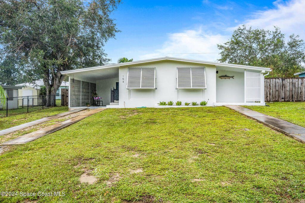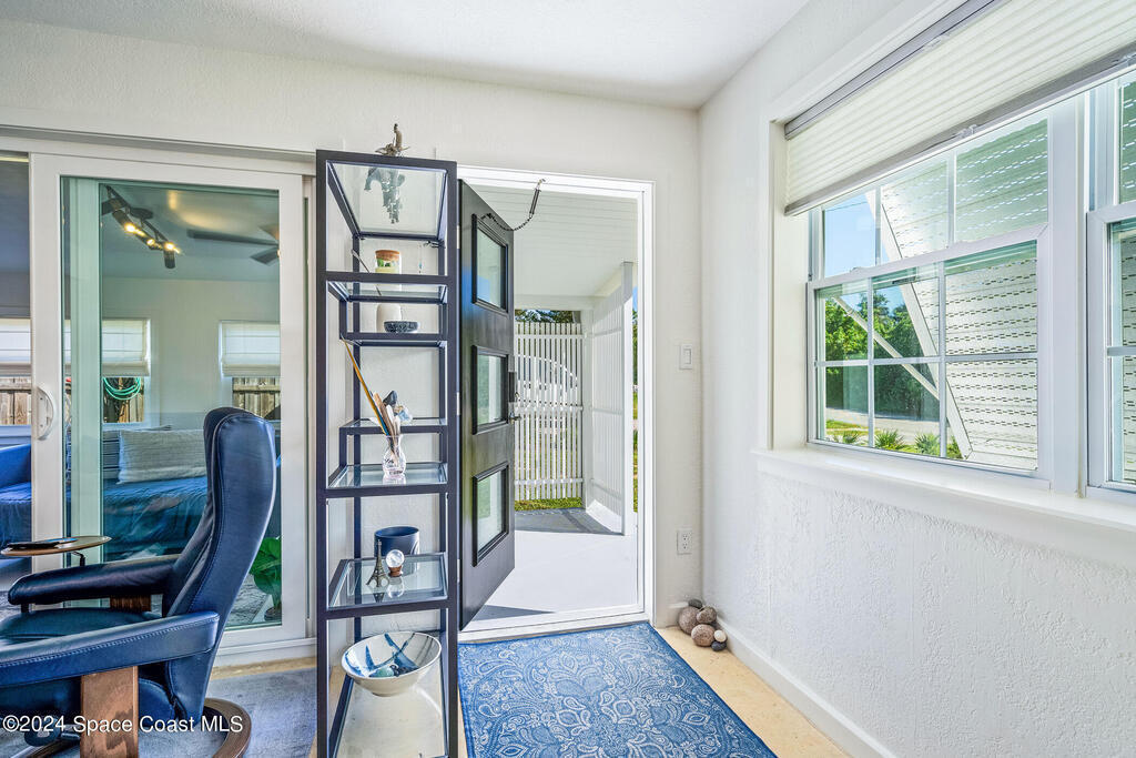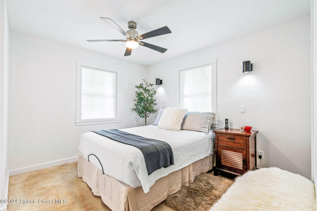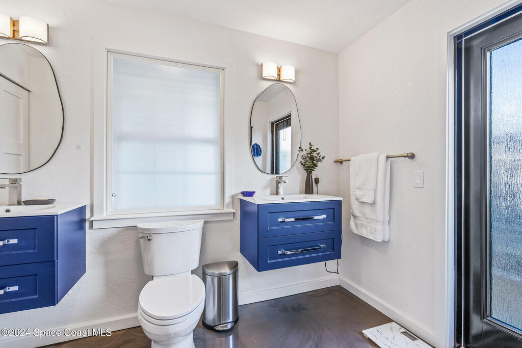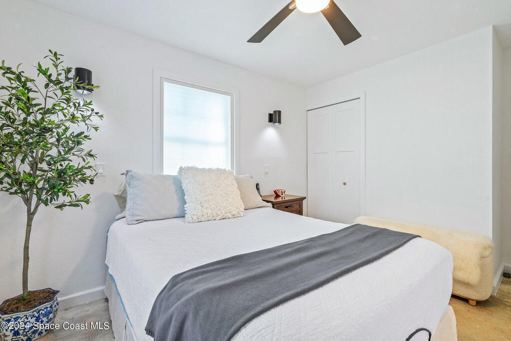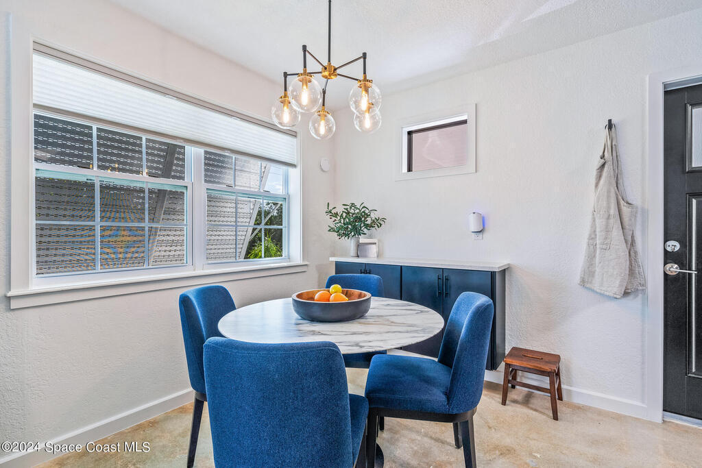 Artfully restored mid-century modern home blending timeless design with modern updates, perfect for downsizers, snowbirds, or STR investors. A newer standing seam white metal roof, impact windows/doors, & rare A-1 insurance rating provide peace of mind & lower insurance costs. Inside, polished concrete floors, vintage-inspired lighting, and custom trim showcase the professional remodel. The chef's kitchen features quartz counters, high-end appliances, Thomasville cabinetry, and a wine cooler drawer. The extended primary suite offers four closets, Indow window inserts for privacy/noise reduction, and a luxurious new bath with double vanities and oversized linen storage. The AC'd guest room adds flexible space for guests or office. Outdoors, enjoy a fenced backyard with a spa-style double shower. With updated systems, full storm protection, and stylish finishes throughout, this home offers low-maintenance living in a prime Vero Beach location.