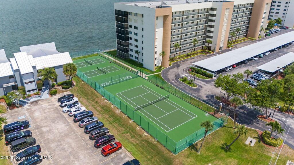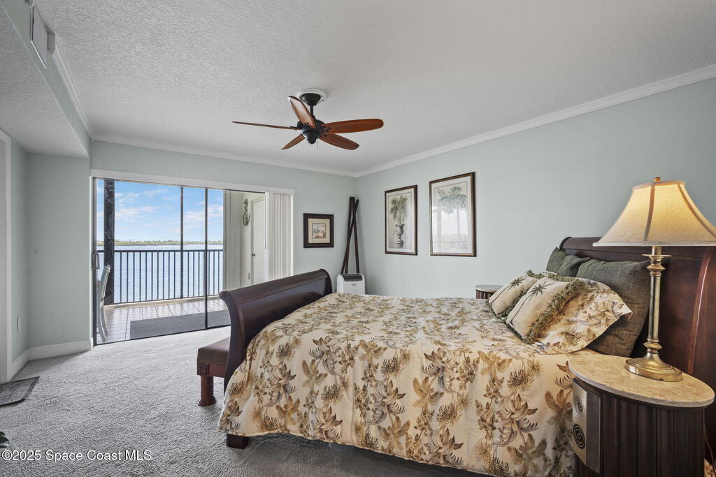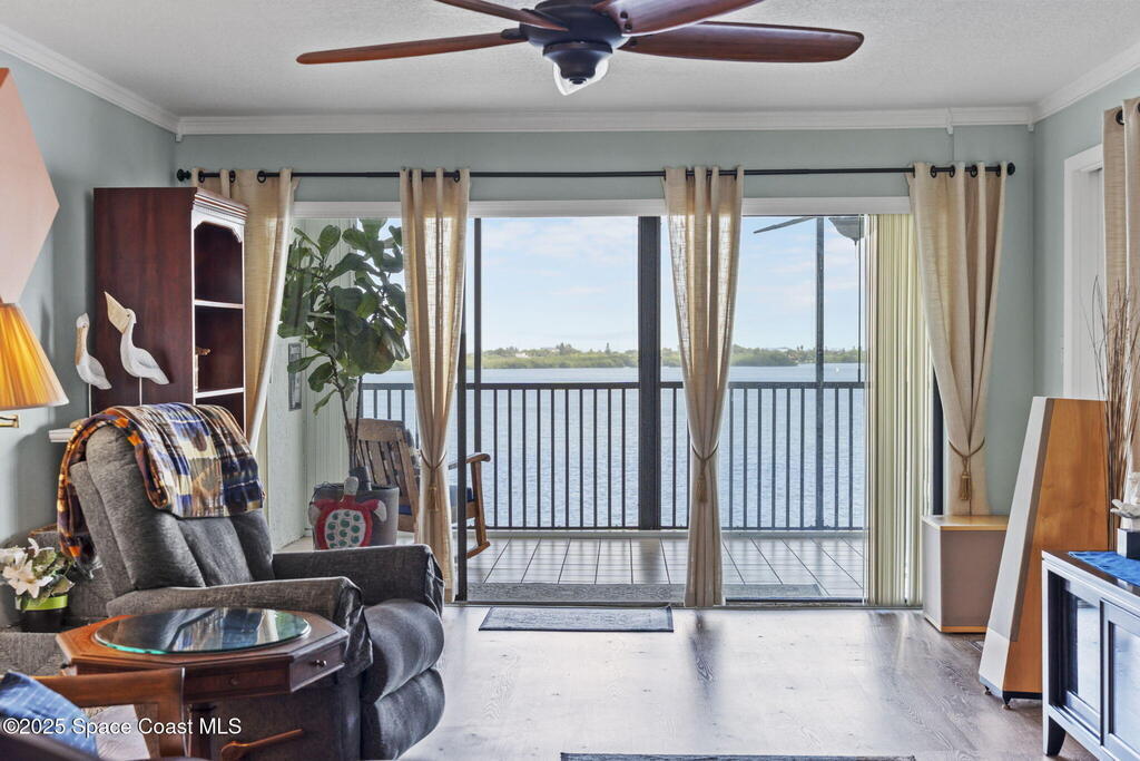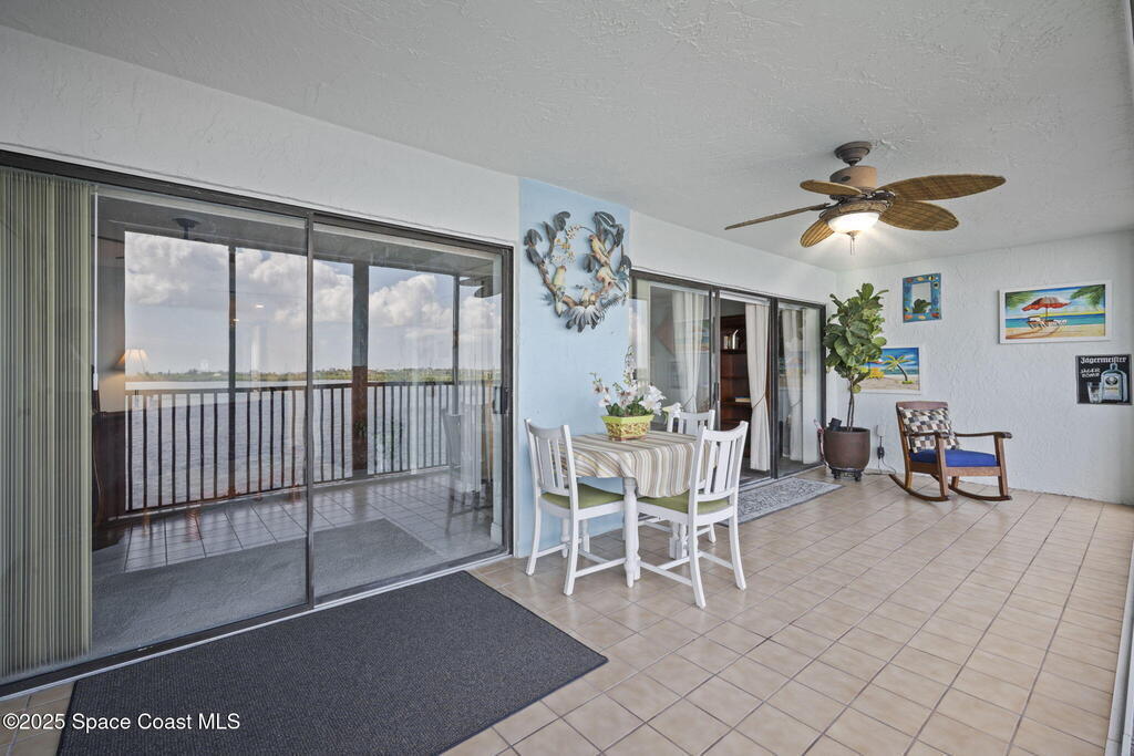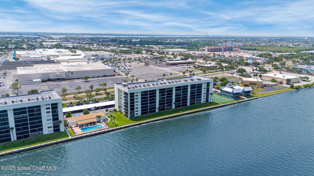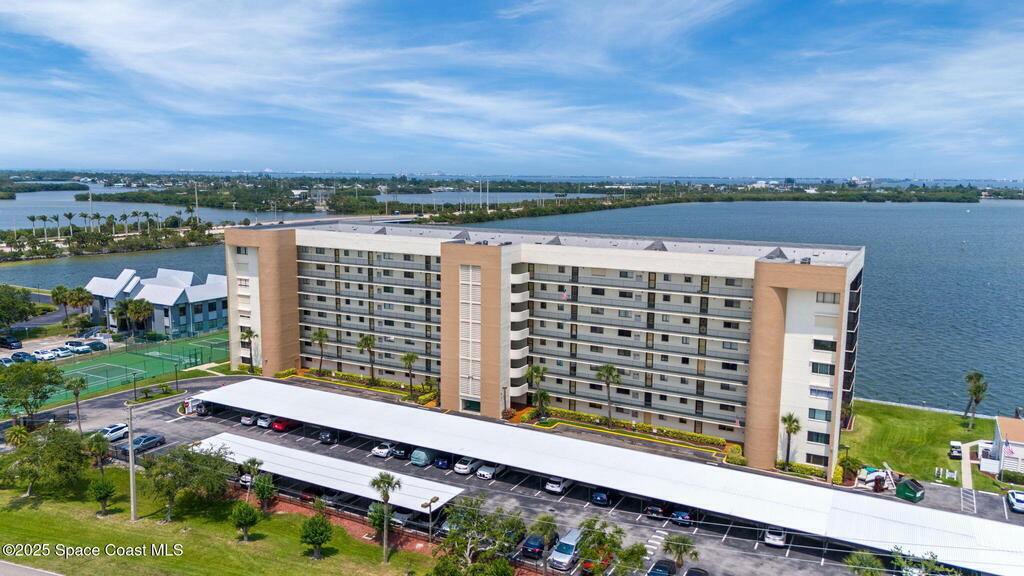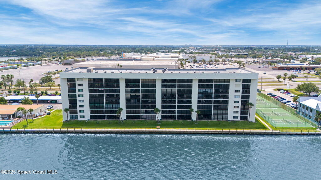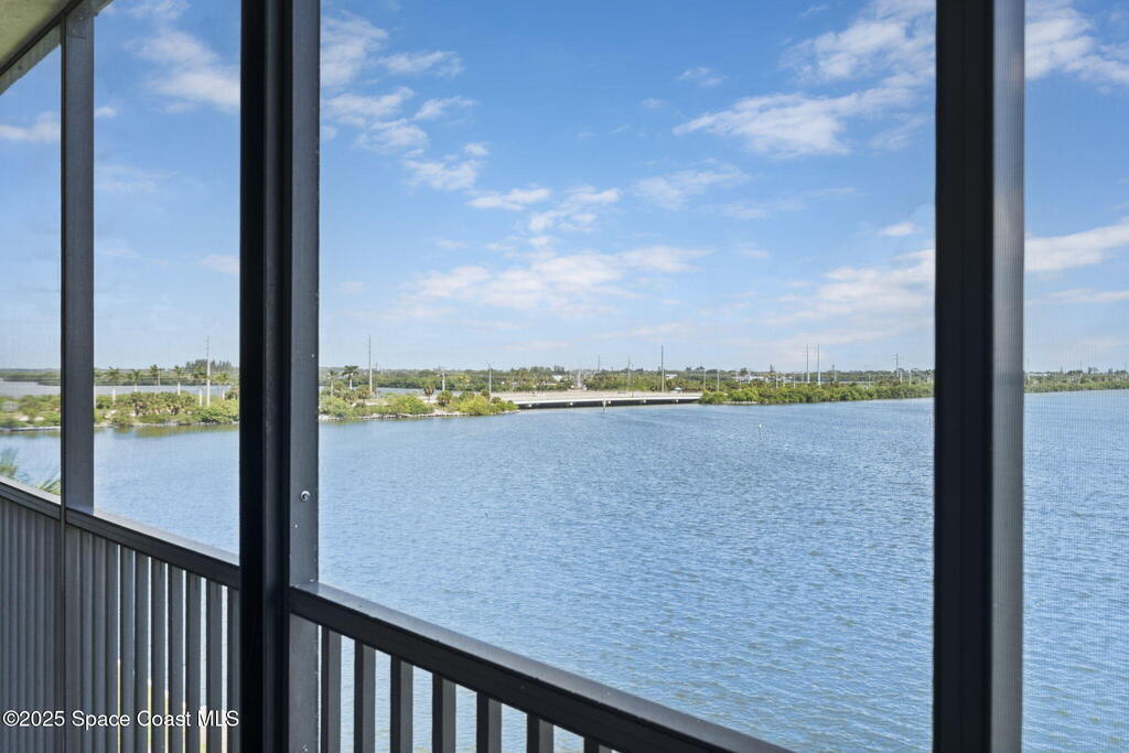 Updated 5th floor condo at Merritt Towers with direct panoramic views of Sykes Creek. Enjoy coastal breezes and watch rocket launches from your own balcony! Inside you'll find a thoughtfully updated kitchen with modern finishes, an open layout, designer pocket door at the laundry room and custom lighting. Additional design features include crown molding, elegant tiled showers, luxury vinyl plank flooring and built-in bar area. For your convenience and safety the front windows have hurricane panels and the balcony has accordion style hurricane shutters. This well-managed community offers great amenities including two waterside pools, tennis and pickleball courts, shuffleboard, riverfront boardwalk, sauna, clubhouse and more! Condo fees cover all utilities except electric. Recent building updates include new elevators, concrete and balcony restoration. All assessments have been paid in full.