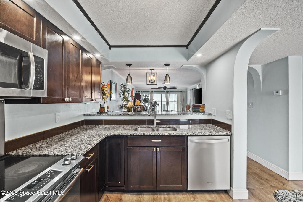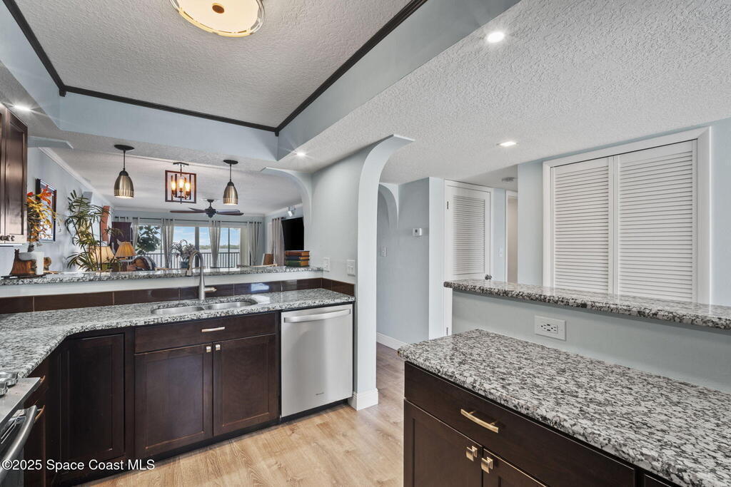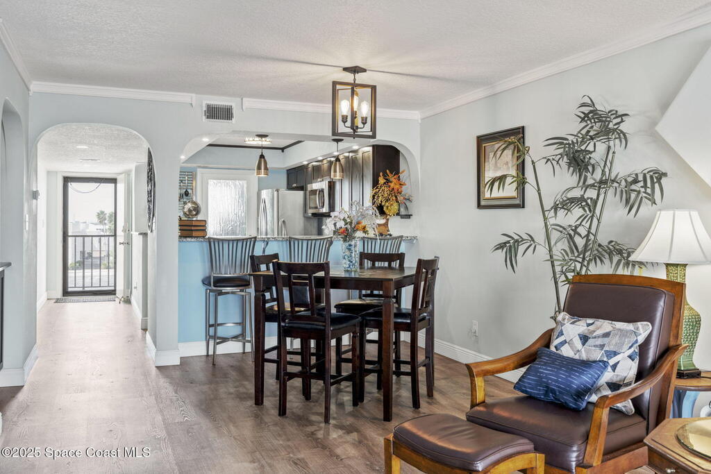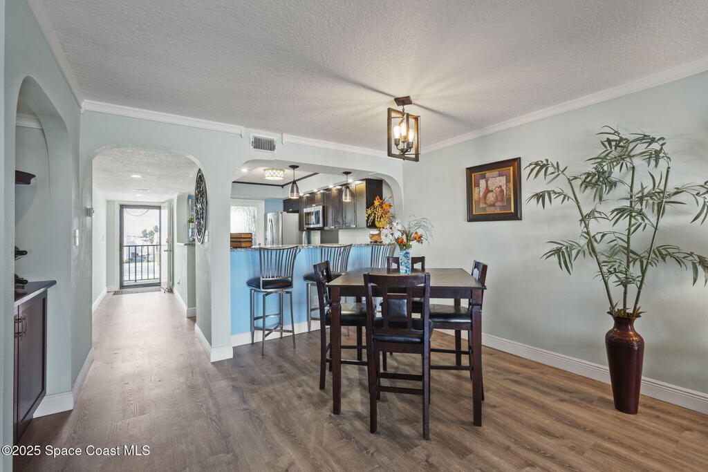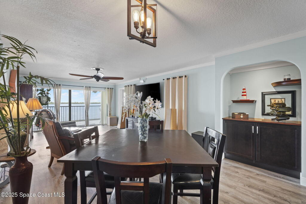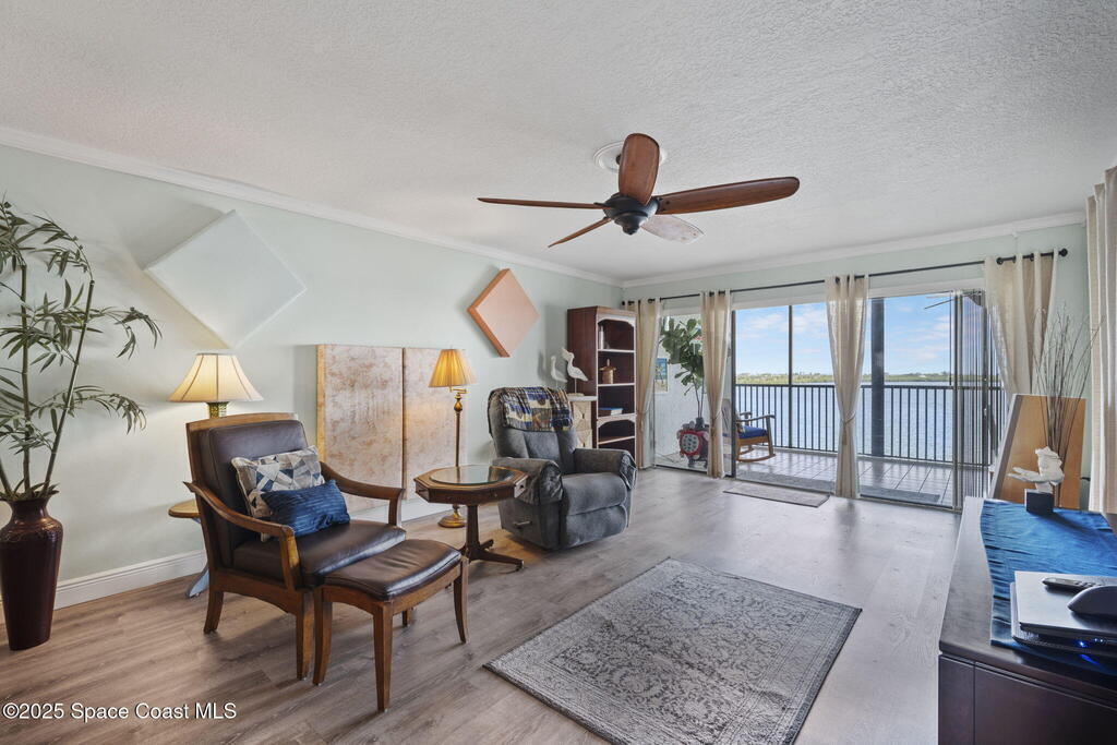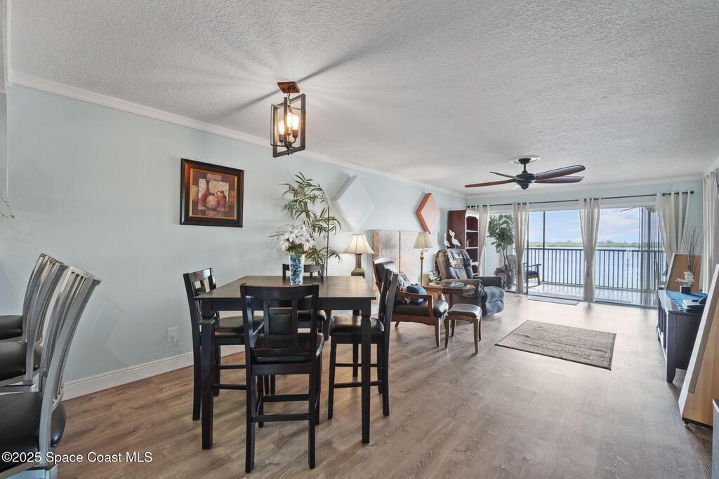 Updated 5th floor condo at Merritt Towers with direct panoramic views of Sykes Creek. Enjoy coastal breezes and watch rocket launches from your own balcony! Inside you'll find a thoughtfully updated kitchen with modern finishes, an open layout, designer pocket door at the laundry room and custom lighting. Additional design features include crown molding, elegant tiled showers, luxury vinyl plank flooring and built-in bar area. For your convenience and safety the front windows have hurricane panels and the balcony has accordion style hurricane shutters. This well-managed community offers great amenities including two waterside pools, tennis and pickleball courts, shuffleboard, riverfront boardwalk, sauna, clubhouse and more! Condo fees cover all utilities except electric. Recent building updates include new elevators, concrete and balcony restoration. All assessments have been paid in full.