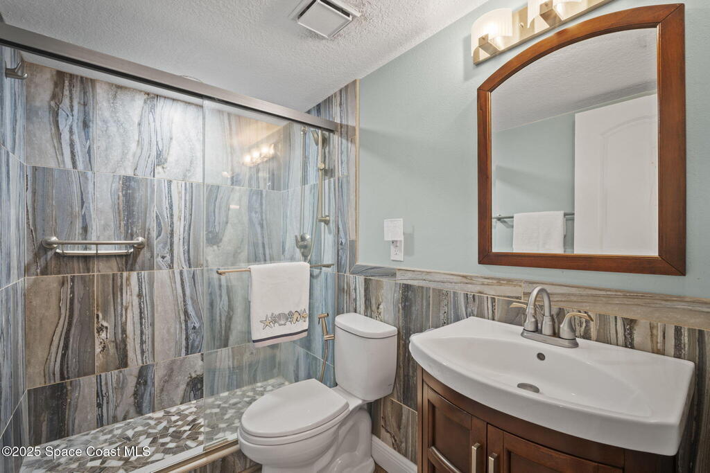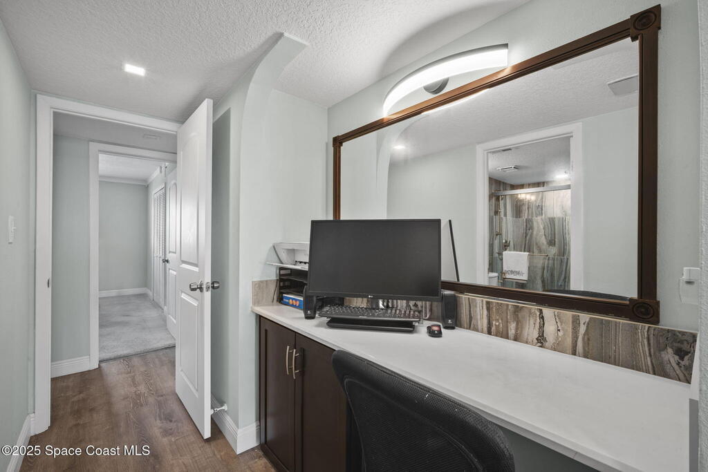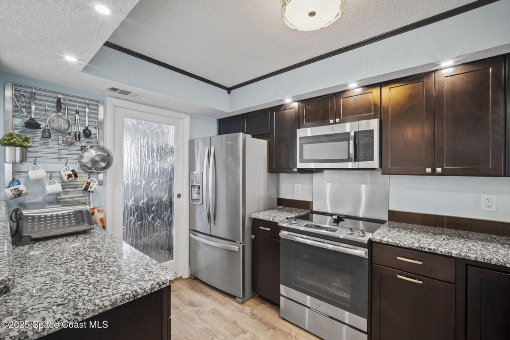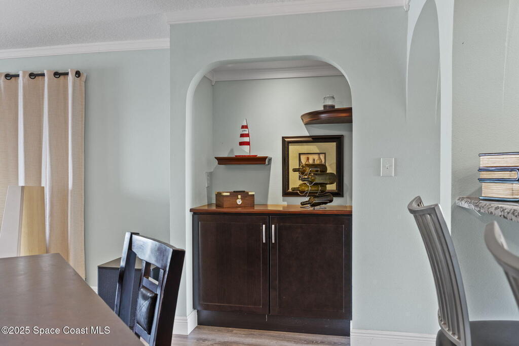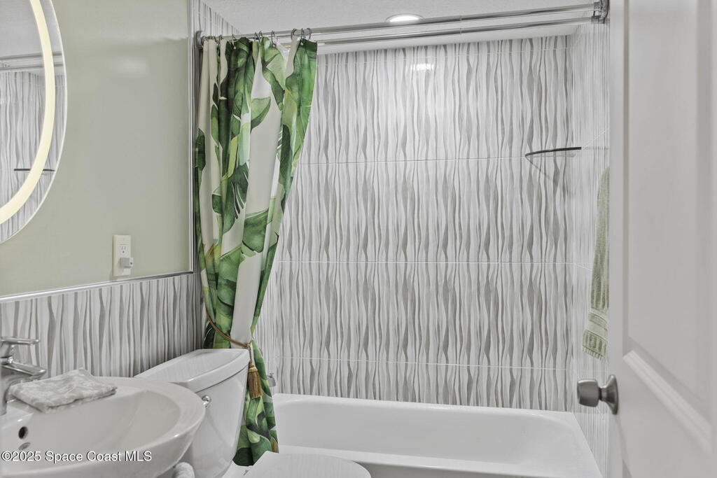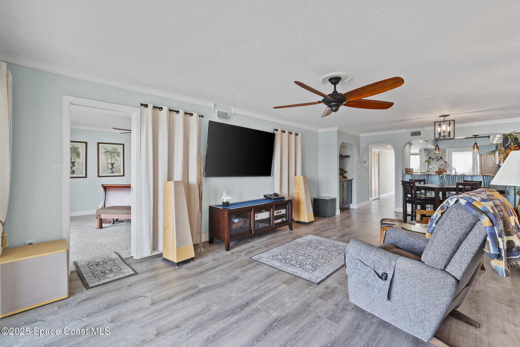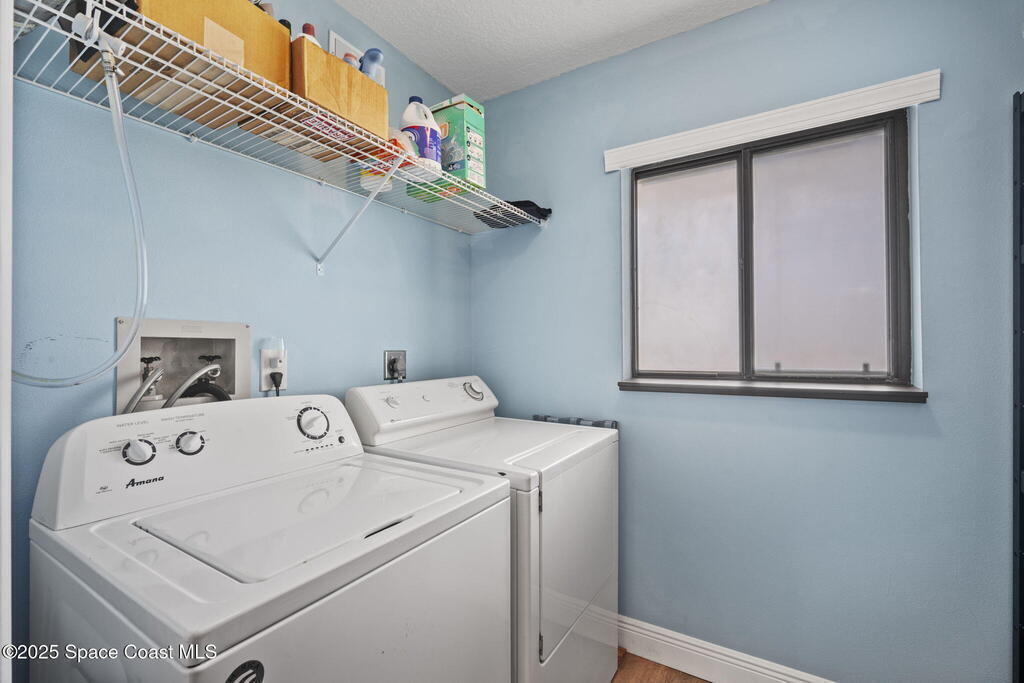 Updated 5th floor condo at Merritt Towers with direct panoramic views of Sykes Creek. Enjoy coastal breezes and watch rocket launches from your own balcony! Inside you'll find a thoughtfully updated kitchen with modern finishes, an open layout, designer pocket door at the laundry room and custom lighting. Additional design features include crown molding, elegant tiled showers, luxury vinyl plank flooring and built-in bar area. For your convenience and safety the front windows have hurricane panels and the balcony has accordion style hurricane shutters. This well-managed community offers great amenities including two waterside pools, tennis and pickleball courts, shuffleboard, riverfront boardwalk, sauna, clubhouse and more! Condo fees cover all utilities except electric. Recent building updates include new elevators, concrete and balcony restoration. All assessments have been paid in full.