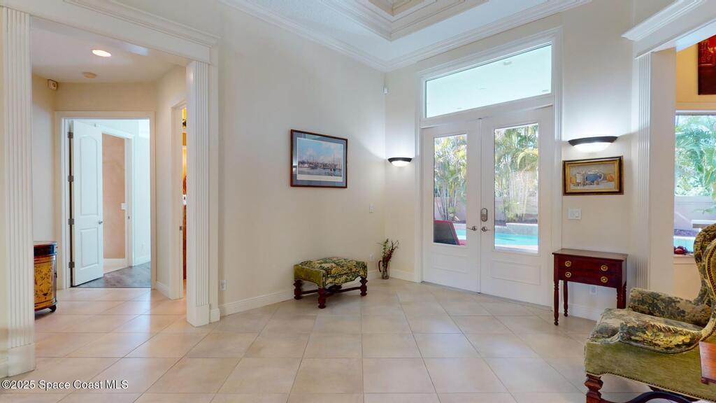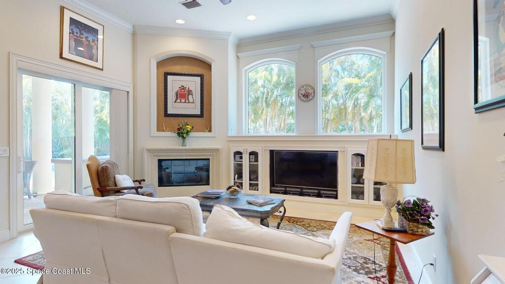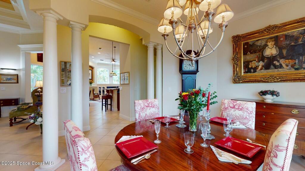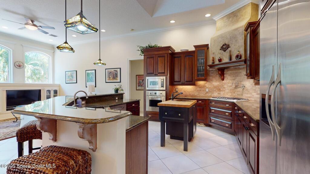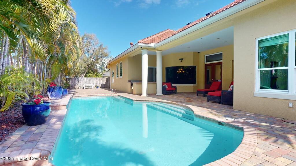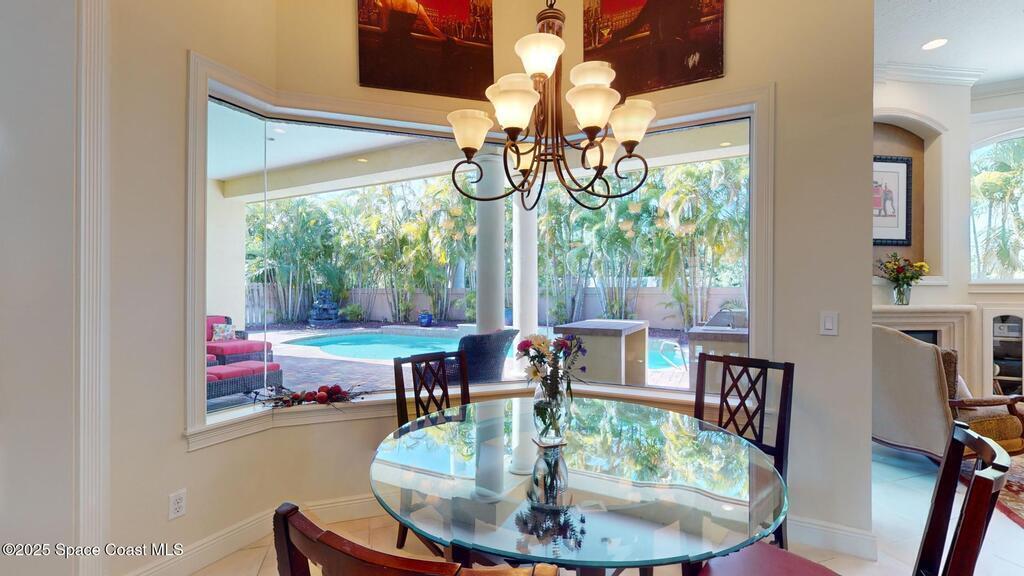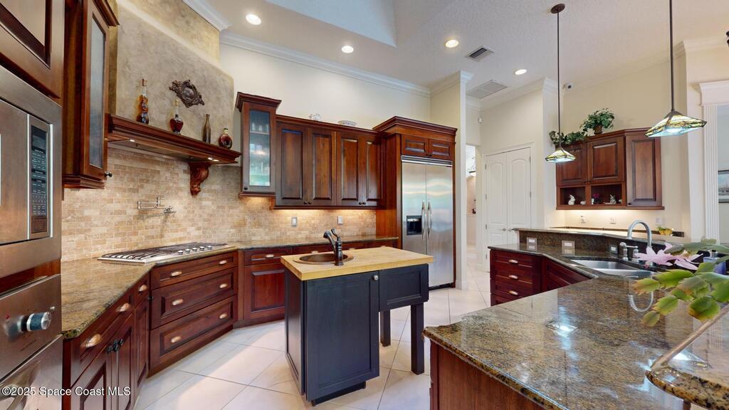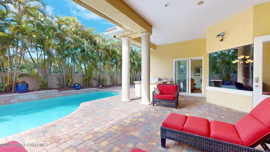 Experience the epitome of luxury. Custom built by a renowned builder. Triple tray ceilings, 10 ft. doors & exquisite finishes. Spanning an impressive 3437 sq. ft. of living space. 5 bedrooms, 4 full baths. Bonus suite for Au pair/in-law. Ideally located between the ocean and river in a sought-after guard gated community. New tile roof 2024. New gutters 2022 & impact resistant windows in 2023. One of a kind kitchen w/professional-grade Viking SS appliances. Gas range, pot filler, butcher block island w/copper sink, lustrous granite & large pantry. Cozy breakfast nook w/ sweeping pool views. Family room w/gas fireplace. Convenient central vac, new wireless security system w/30 sensors. Luxury principal suite w/two custom walk-in closets, wrap around shower & soaking tub. Elegant baths w/ custom tile & granite. Large lanai & summer kitchen. Solaire gas grill. Expertly resurfaced salt water lap pool. Diamond level energy efficient residence. For the discriminating buyer.