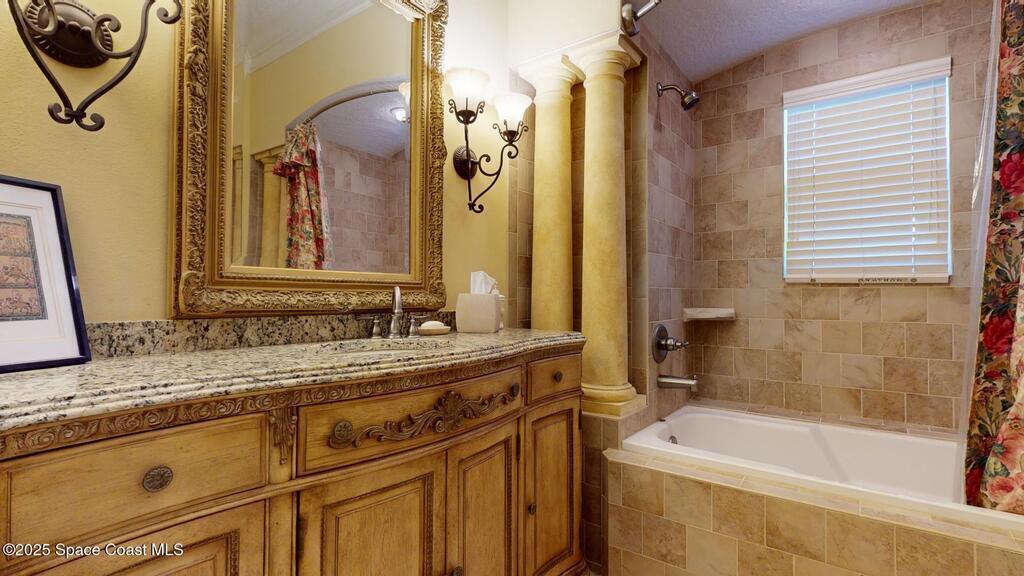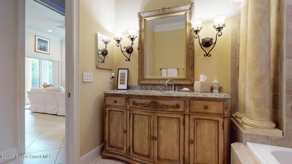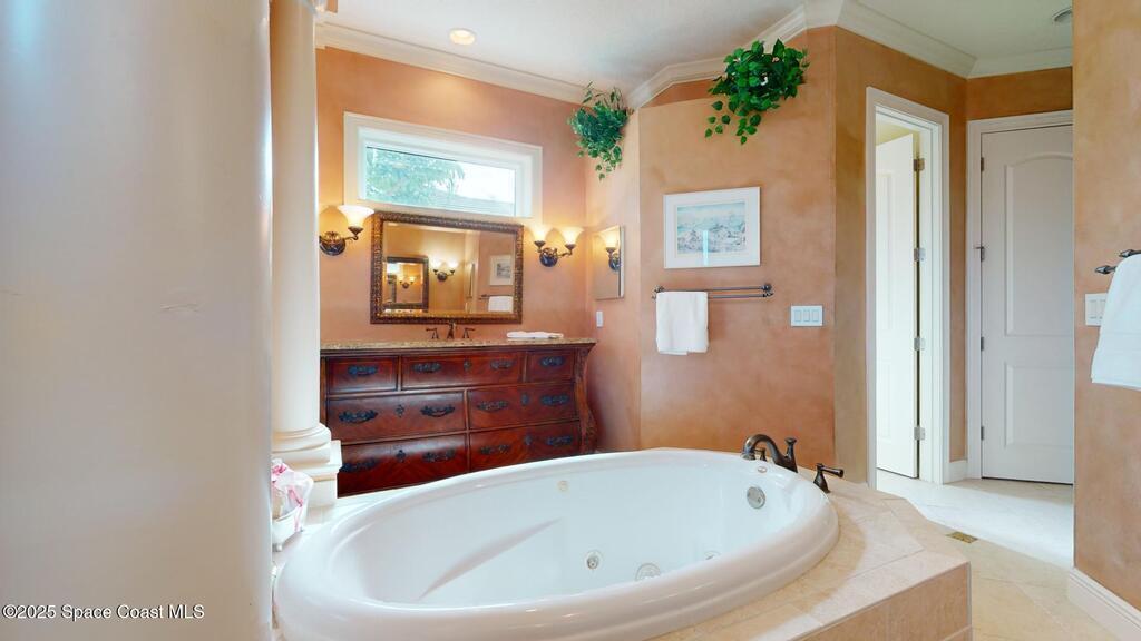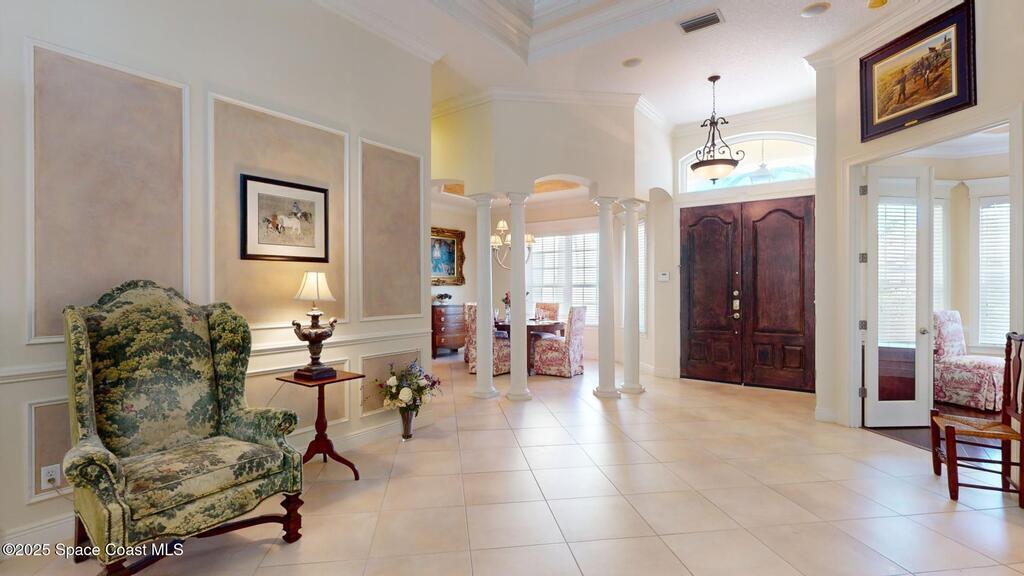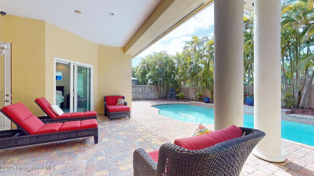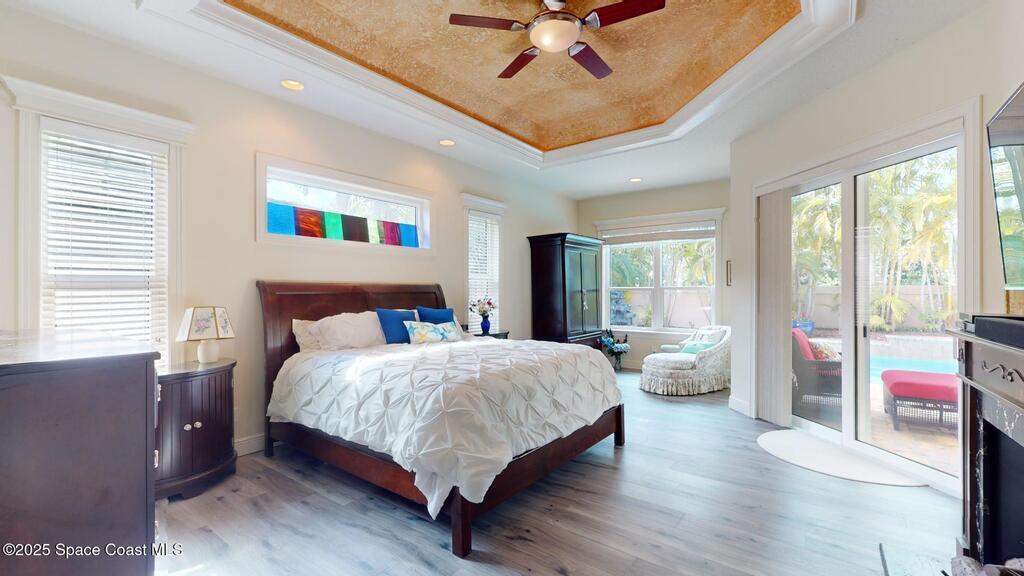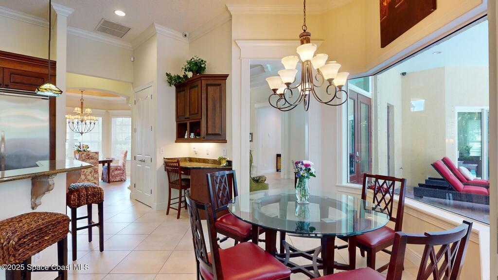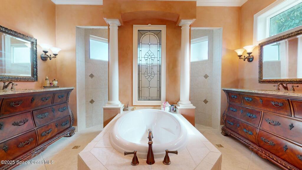 Experience the epitome of luxury. Custom built by a renowned builder. Triple tray ceilings, 10 ft. doors & exquisite finishes. Spanning an impressive 3437 sq. ft. of living space. 5 bedrooms, 4 full baths. Bonus suite for Au pair/in-law. Ideally located between the ocean and river in a sought-after guard gated community. New tile roof 2024. New gutters 2022 & impact resistant windows in 2023. One of a kind kitchen w/professional-grade Viking SS appliances. Gas range, pot filler, butcher block island w/copper sink, lustrous granite & large pantry. Cozy breakfast nook w/ sweeping pool views. Family room w/gas fireplace. Convenient central vac, new wireless security system w/30 sensors. Luxury principal suite w/two custom walk-in closets, wrap around shower & soaking tub. Elegant baths w/ custom tile & granite. Large lanai & summer kitchen. Solaire gas grill. Expertly resurfaced salt water lap pool. Diamond level energy efficient residence. For the discriminating buyer.