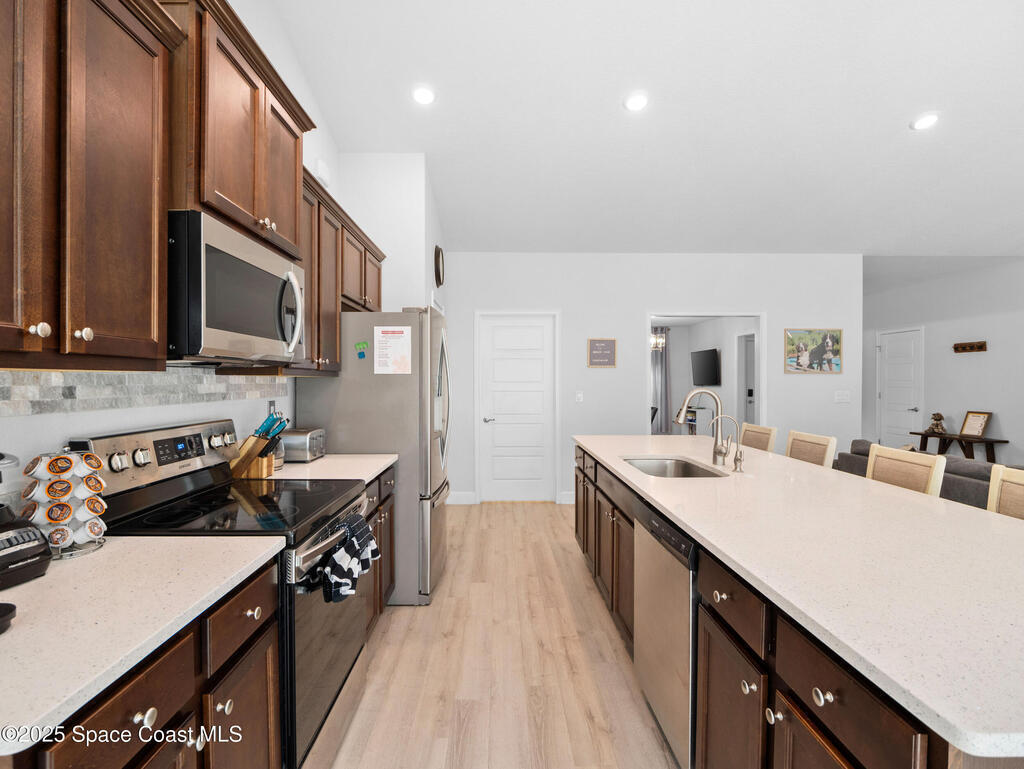 Welcome to your very own slice of paradise in Palm Bay! Step inside and you're greeted by a bright, airy floor plan featuring high ceilings, neutral tones, and luxury vinyl floors that flow seamlessly throughout. The kitchen is the heart of the home complete with rich wood cabinetry, stainless steel appliances, and a massive island perfect for hosting family gatherings or enjoying your morning coffee.The primary suite feels like a spa retreat, featuring a dual-sink vanity, soaking tub, and walk-in shower the perfect place to unwind after a long day.But the real showstopper? Your private fully fenced backyard oasis. A sparkling custom pool sits surrounded by lush greenery and total privacy ideal for barbecues, pool parties, or relaxing under the covered patio. Located just minutes from shopping, dining, and I-95, this home gives you the best of both worlds peaceful living with easy access to everything the Space Coast has to offer.Check it out before it's gone!