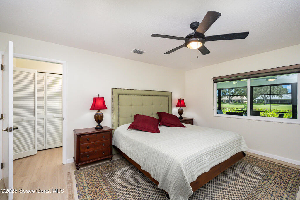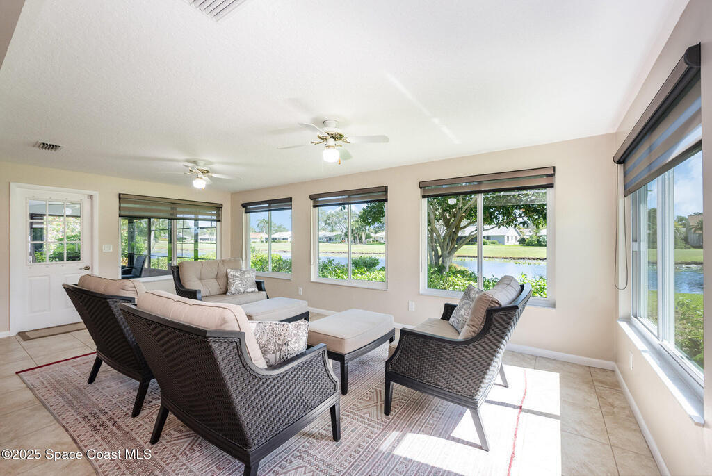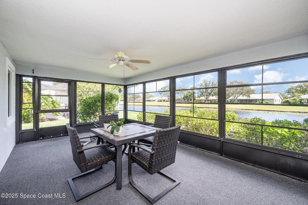 Popular Bangor model featuring stunning water and golf course views, located in a resort-style country club community offering top-notch amenities! This beautifully maintained 2-bedroom, 2-bath home with a 2-car garage offers an expanded Florida room and a large covered lanai--perfect for enjoying the expansive views and Florida lifestyle. Interior highlights include cathedral ceilings, fresh paint, and an indoor laundry room. Recent updates make this home truly move-in ready: 2023 impact-rated windows, remodeled primary bathroom with quartz countertop, roll-in shower with frameless glass door, porcelain tile, LVP flooring, new toilet, and fixtures. The primary bedroom features new glass-pane French doors and LVP flooring (2023), while the guest bedroom was also updated in 2023 with matching French doors and LVP flooring. Additional improvements include a 2025 impact-rated garage door, 2023 custom zebra shades on all windows, a 2025 front screen enclosure,