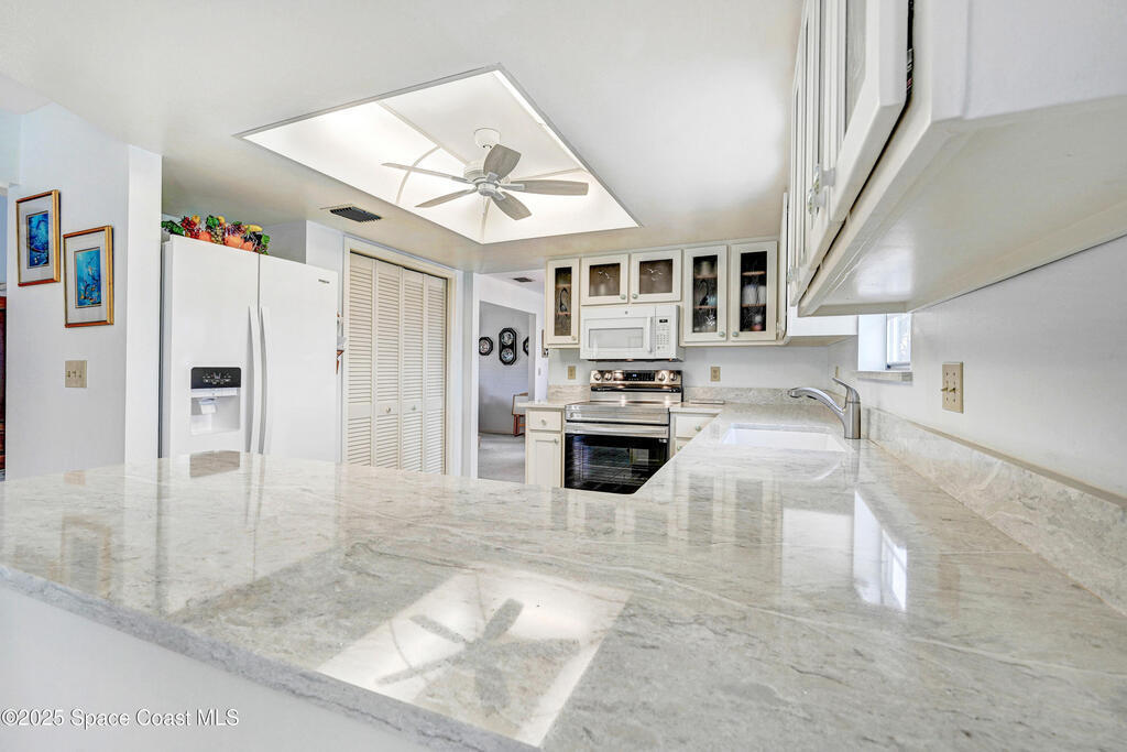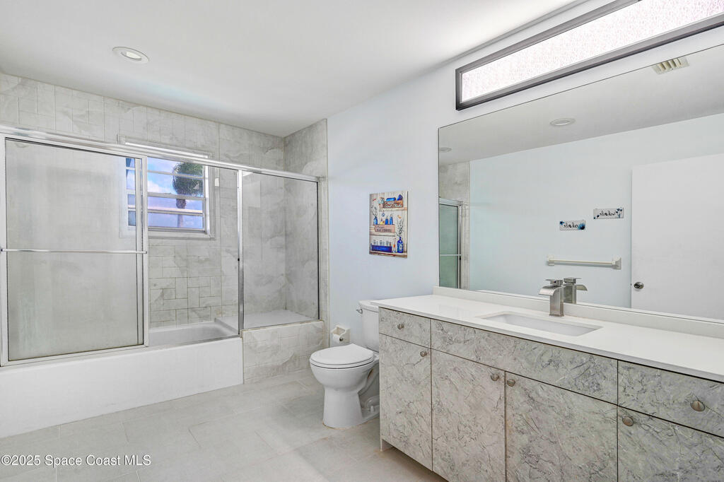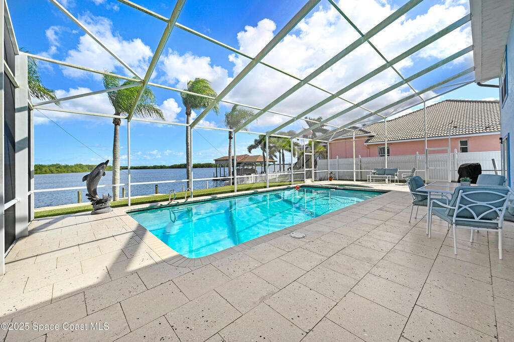 Endless water & nature vistas! Spacious home is perfectly positioned on premium navigable Sykes Creek frontage w/access to the Banana River, Indian River, Intracoastal Waterway, & ocean via nearby Port Canaveral Locks -- a true boater's paradise. Oversized screened-in pool w/elegant paver deck is perfect for entertaining or relaxing. Huge family room offers warmth & charm w/wood-burning fireplace, wet bar, & sliders to patio. Updated eat-in kitchen w/beautiful countertops, convenient pass-through window to patio, & newer appliances. Meticulously maintained w/many recent updates: roof (2020), water heater (2022), RainSoft water filtration (2018), screen enclosure (2018), dock (2019), new pool pump, RhinoShield exterior coating, Massey termite bond, & two HVAC systems serviced annually. Classy vinyl fencing w/double gate for boat/trailer storage. Large bedrooms provide comfort & space, w/luxurious primary suite featuring his-&-hers closets, soaking tub, roomy shower, & dual sink vanity