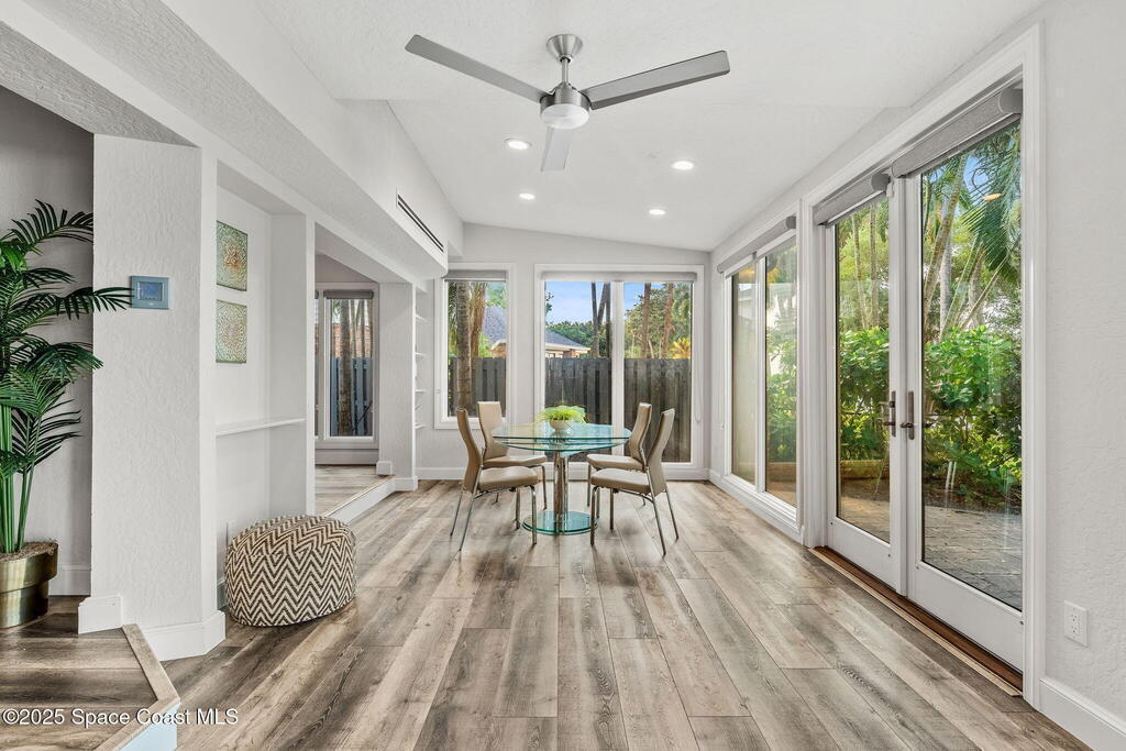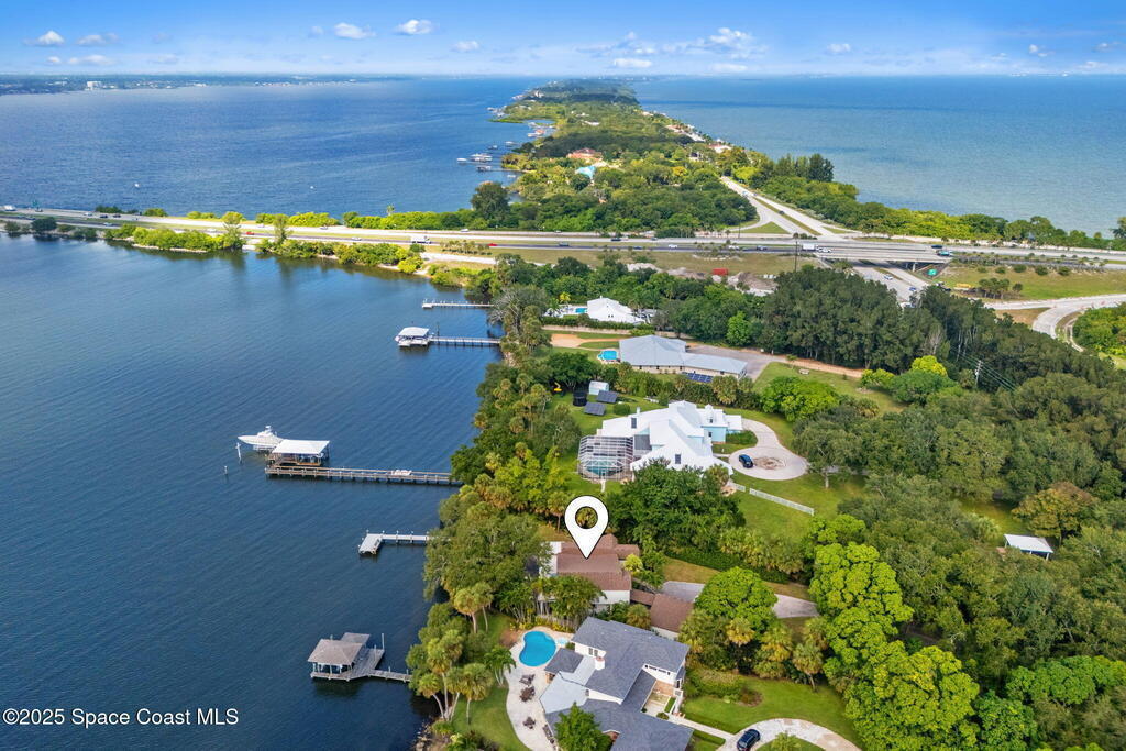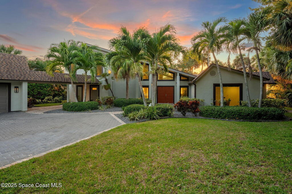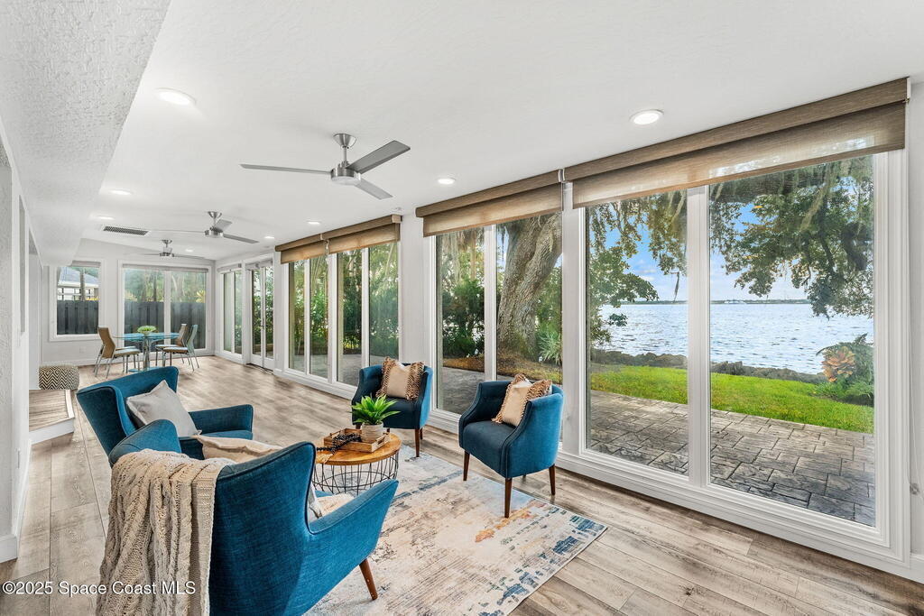 Spectacular direct Indian Riverfront home featuring 3 bedrooms plus an office, completely renovated in 2017 to combine modern design with subtle historic charm. The open layout emphasizes light and connection, with soaring glass, minimal walls, and seamless flow between indoor living spaces and lush outdoor gardens. Vaulted ceilings, LVP and tile flooring, and thoughtfully curated finishes create a warm, modern aesthetic that balances comfort with style. The first-floor primary bedroom offers privacy and river views, while the private dock with state-of-the-art Sure Step decking provides direct access to boating, kayaking, and fishing on the Indian River. Additional features include a newer paver driveway, professional landscaping, hurricane-rated windows, and dual air conditioners. Perfectly suited for those seeking Florida waterfront living, this home adapts effortlessly between contemporary and coastal-chic with just a change in furnishings.