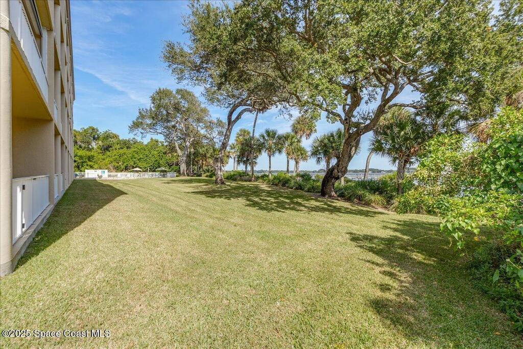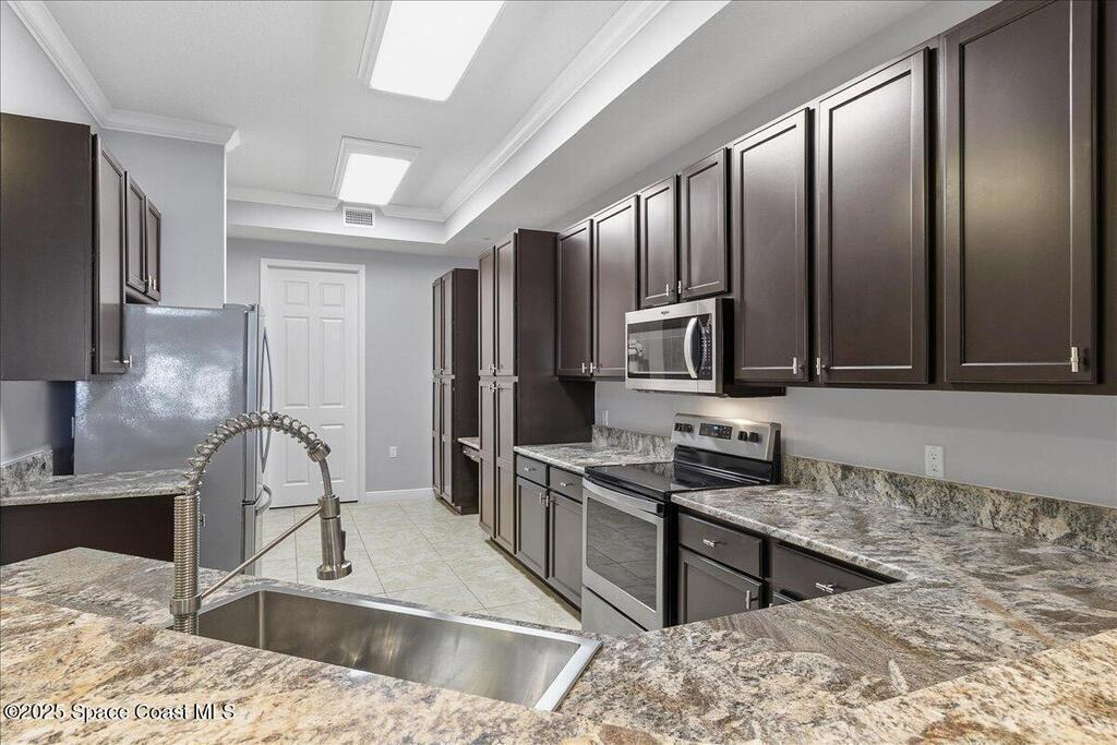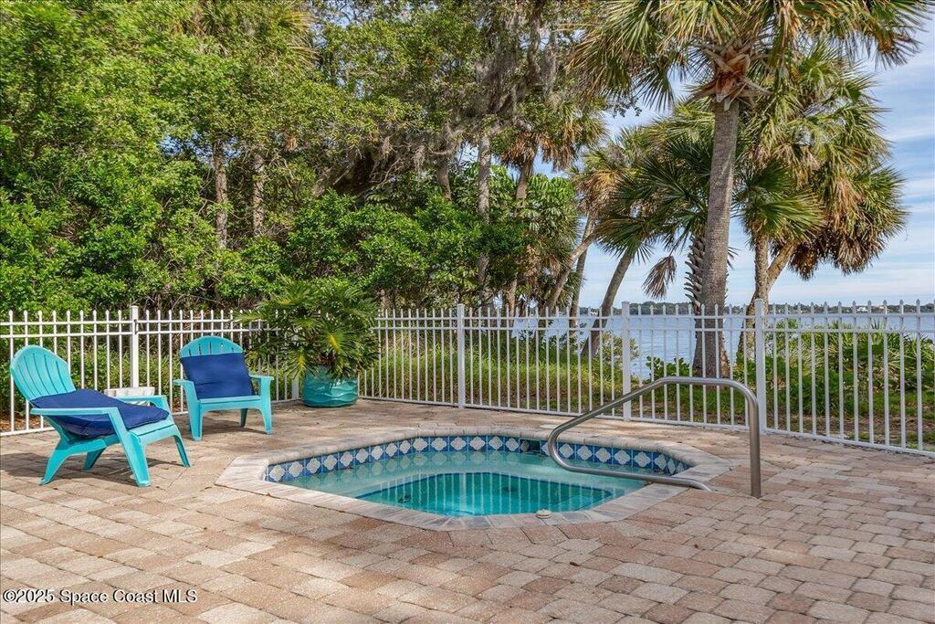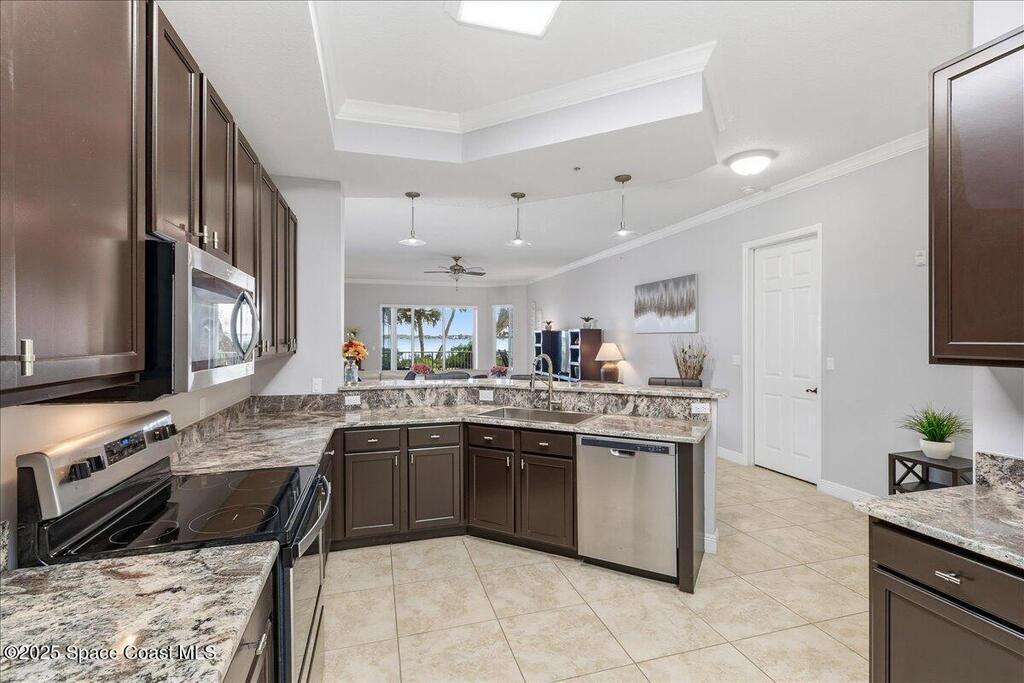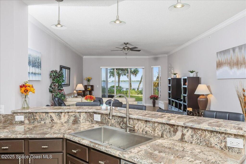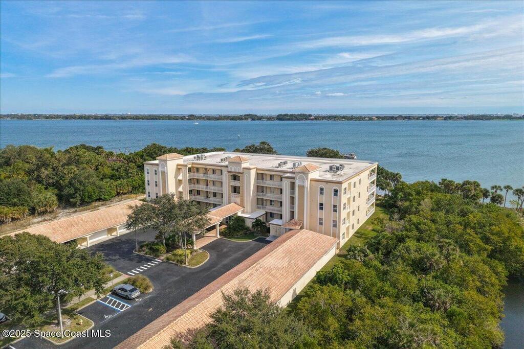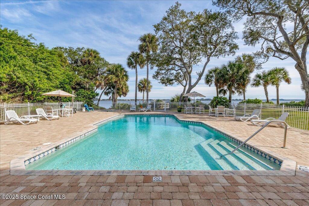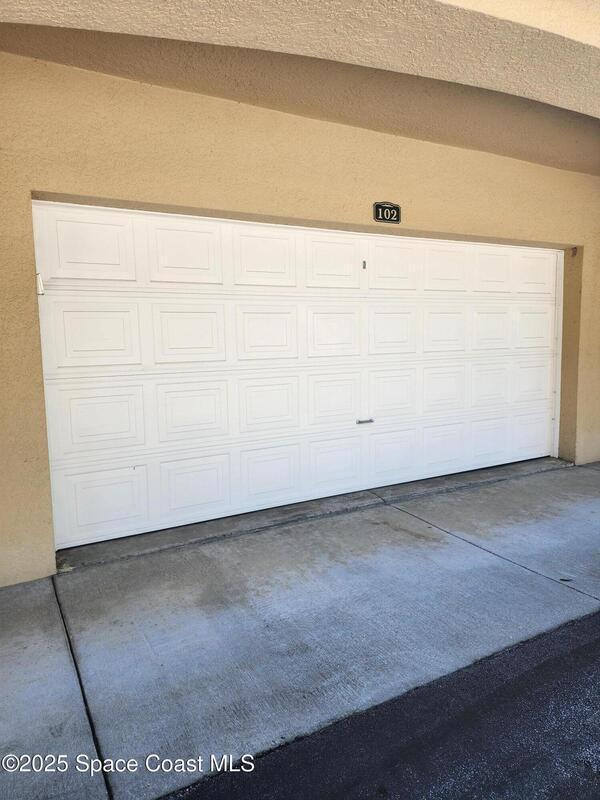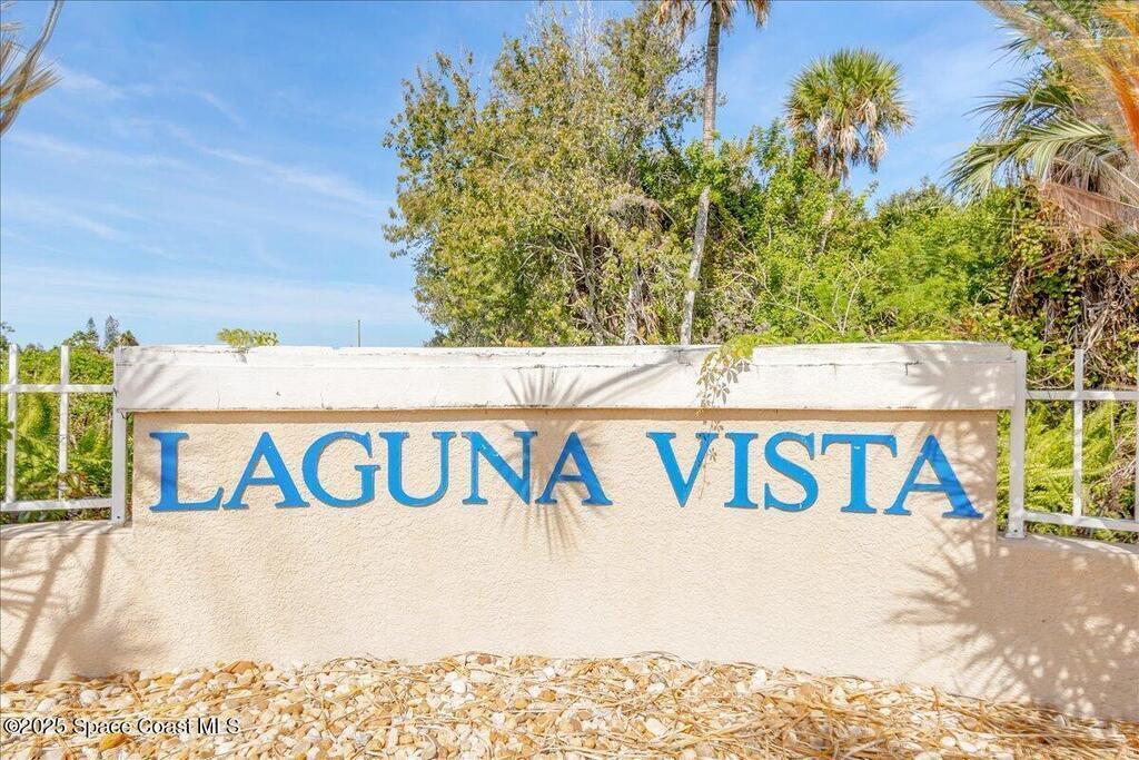 Be sure to include this updated Laguna Vista condo on your ''Must See List'! Move-in ready and beautifully maintained, convenient first-floor riverfront unit is located on the South side of the building and includes a private oversized two-car garage on the same side for easy access. This spacious condo features 3 bedrooms, 2.5 bathrooms, and an open floor plan with high ceilings. Tile flooring runs throughout the main living areas, with carpet in the bedrooms for added comfort. The utility room includes a washer, dryer, and utility sink for convenience. Step out to the tiled, covered back porch - complete with a gate that provides direct access to the pool, spa, and dock area, perfect for swimming, relaxing, or fishing, etc. Take in the stunning sunrise views over the Intracoastal River and enjoy watching rocket launches to the North right from your own backyard! The updated kitchen is truly impressive, featuring abundant cabinetry, stainless steel appliances, and modern finishes.