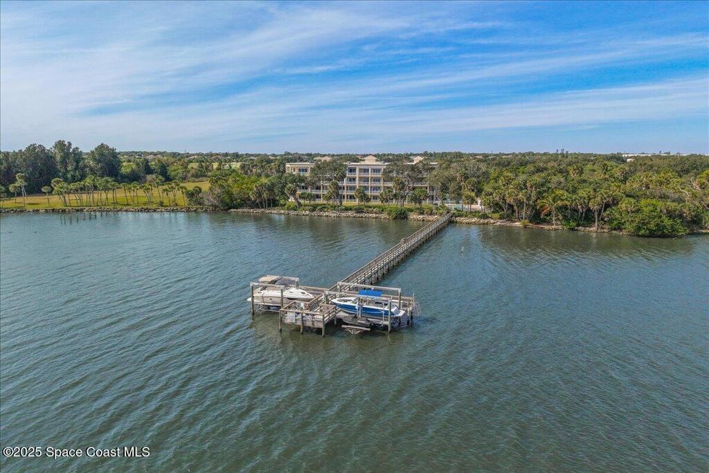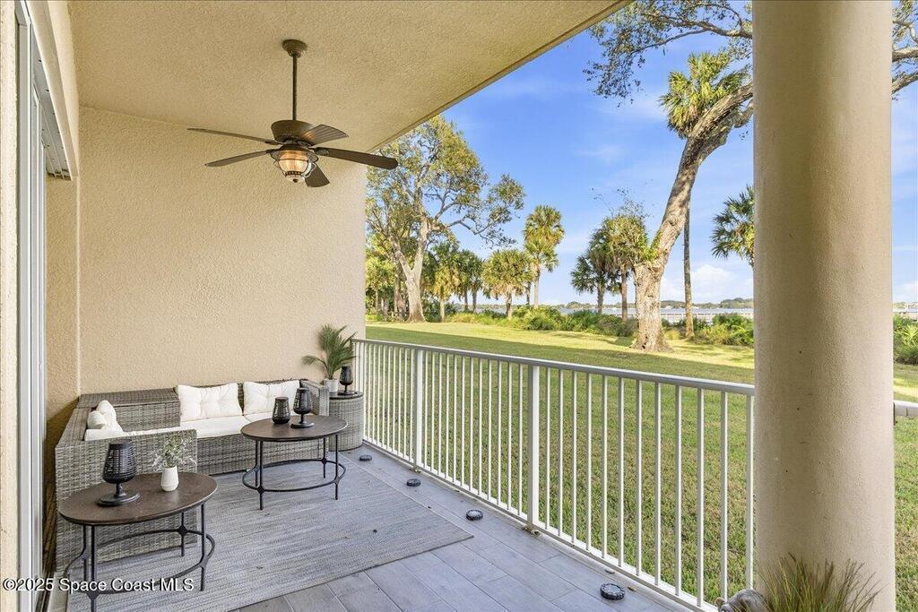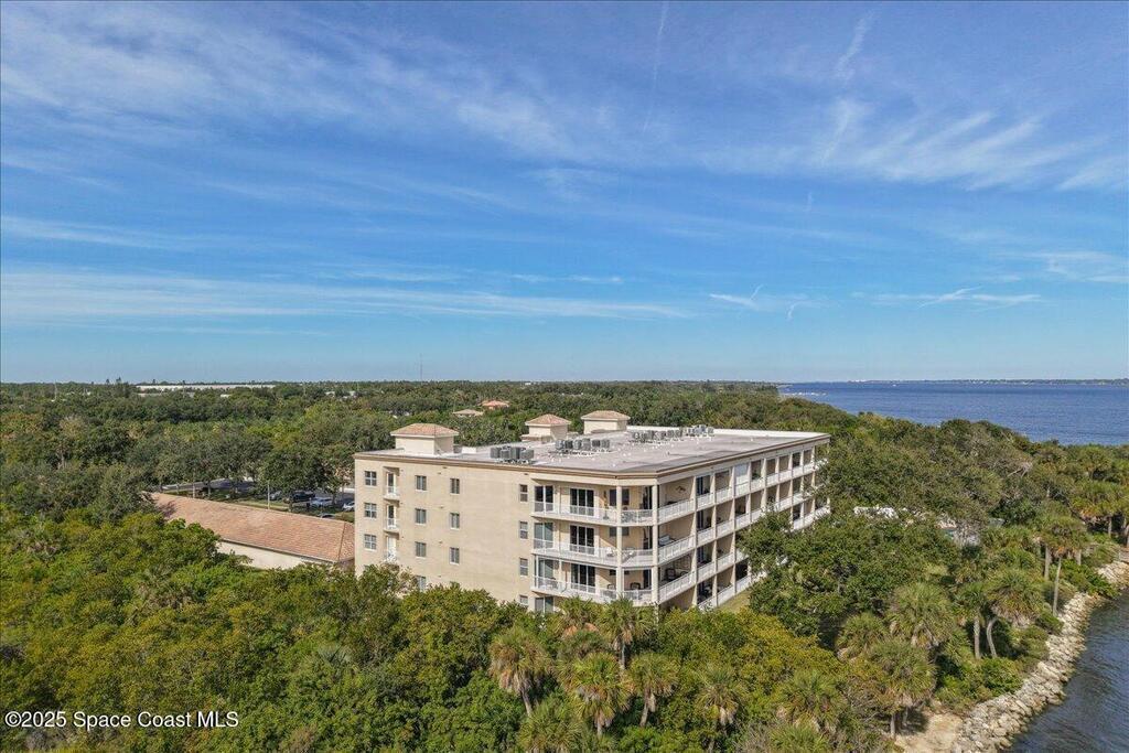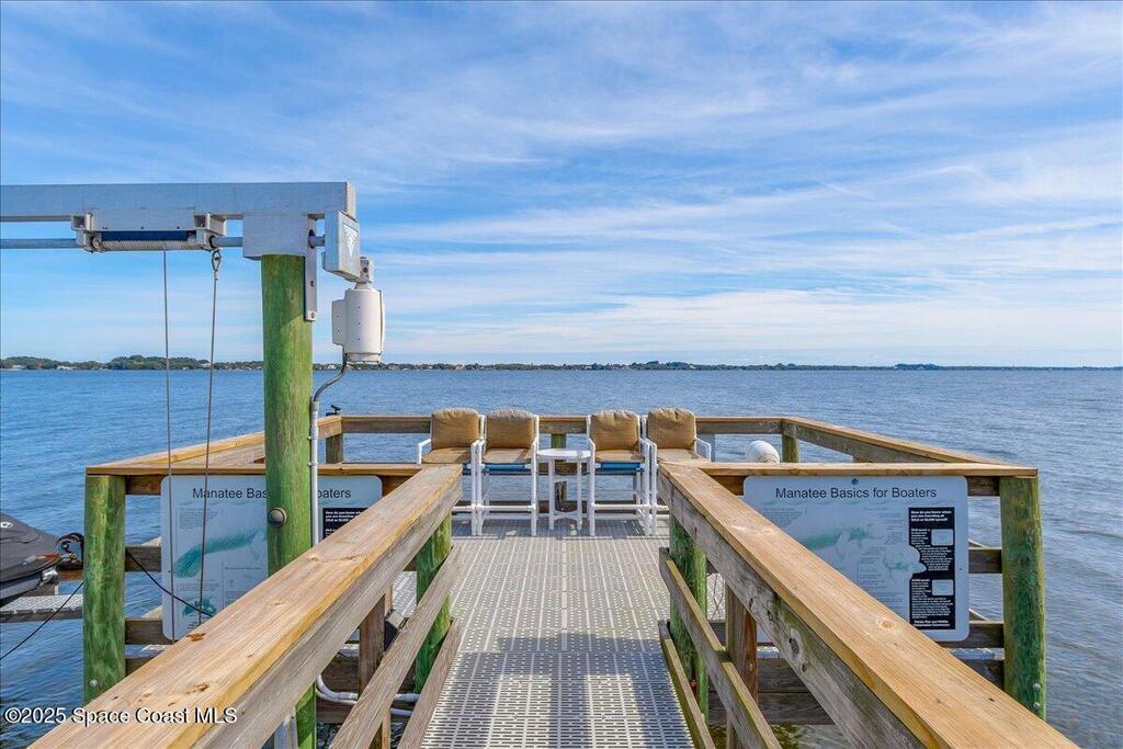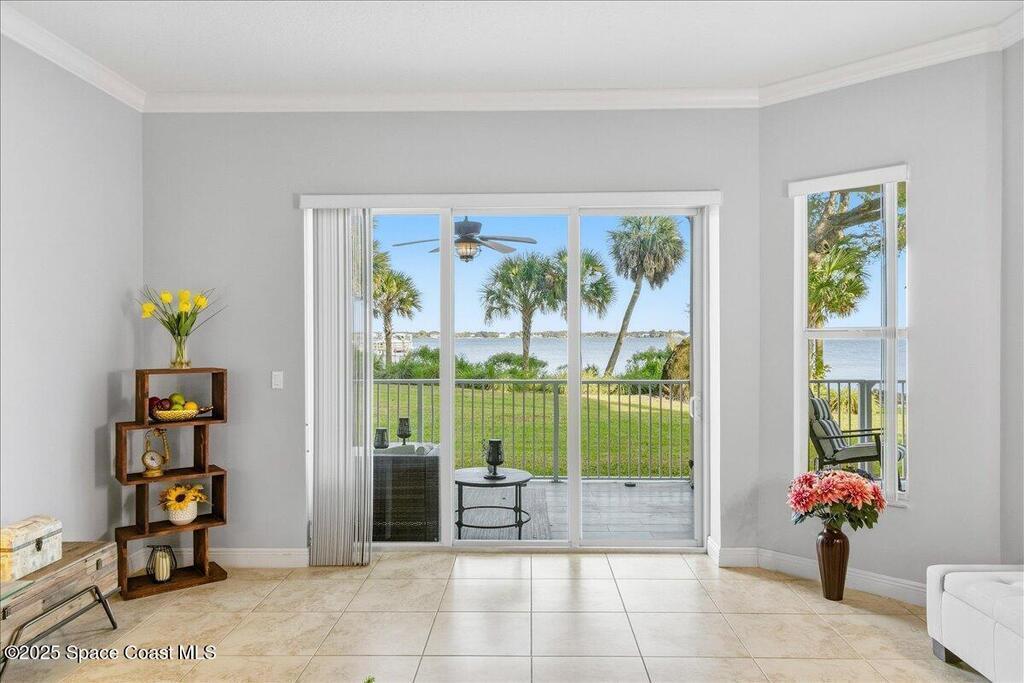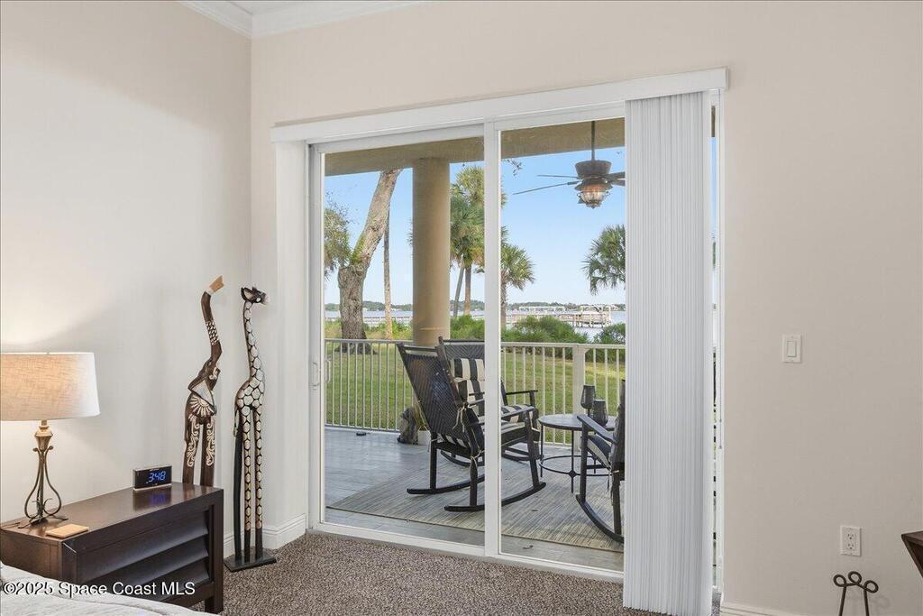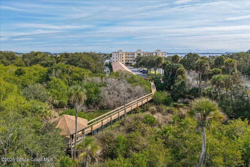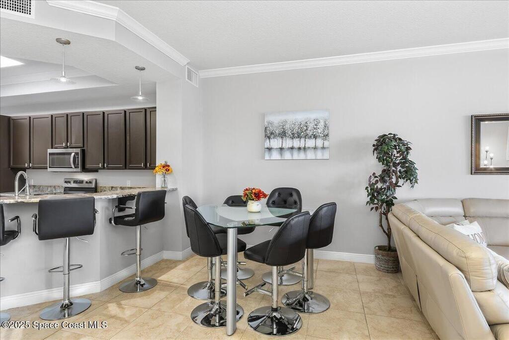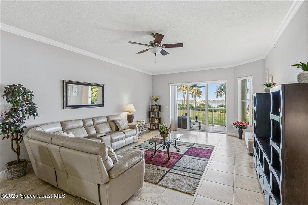 Be sure to include this updated Laguna Vista condo on your ''Must See List'! Move-in ready and beautifully maintained, convenient first-floor riverfront unit is located on the South side of the building and includes a private oversized two-car garage on the same side for easy access. This spacious condo features 3 bedrooms, 2.5 bathrooms, and an open floor plan with high ceilings. Tile flooring runs throughout the main living areas, with carpet in the bedrooms for added comfort. The utility room includes a washer, dryer, and utility sink for convenience. Step out to the tiled, covered back porch - complete with a gate that provides direct access to the pool, spa, and dock area, perfect for swimming, relaxing, or fishing, etc. Take in the stunning sunrise views over the Intracoastal River and enjoy watching rocket launches to the North right from your own backyard! The updated kitchen is truly impressive, featuring abundant cabinetry, stainless steel appliances, and modern finishes.