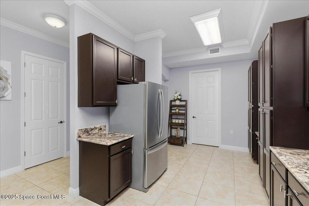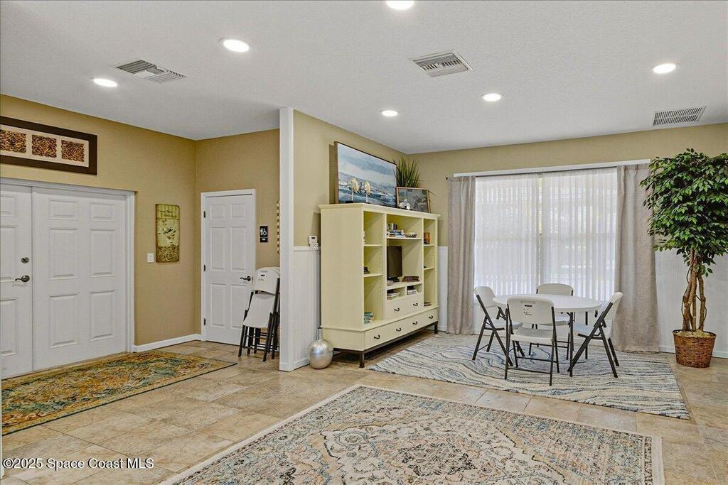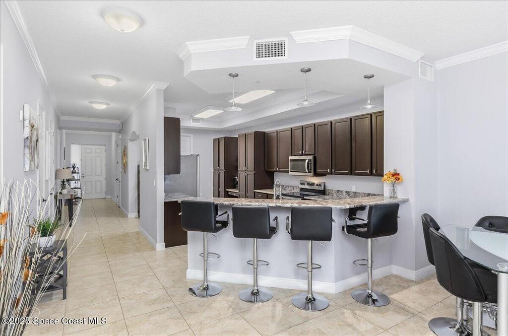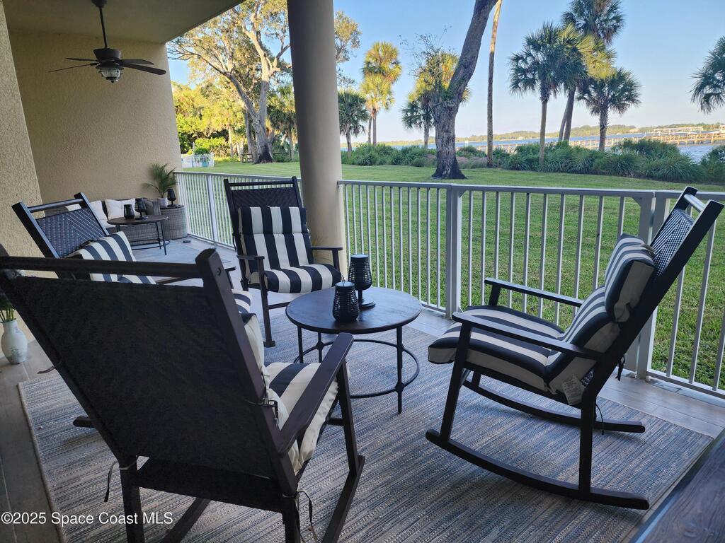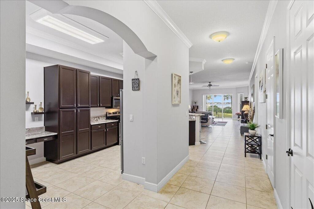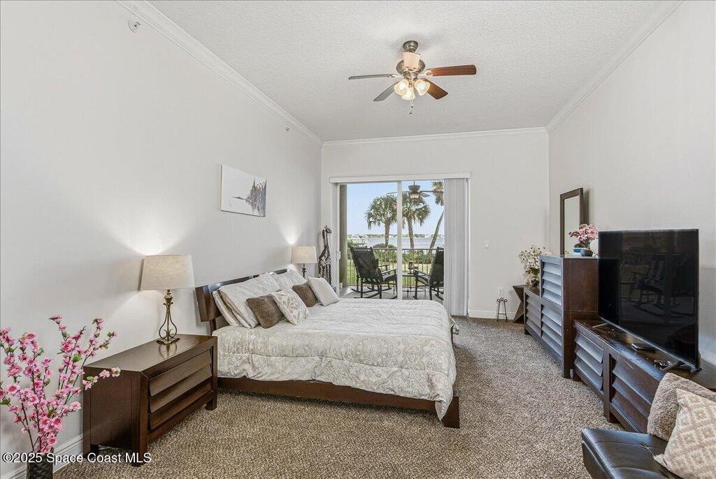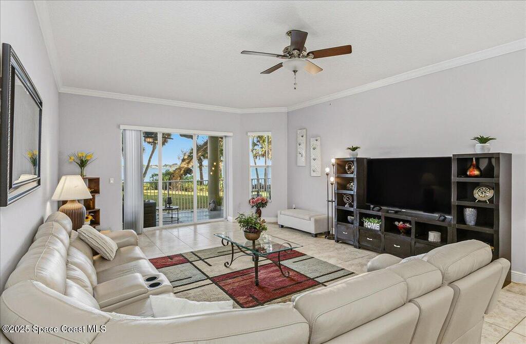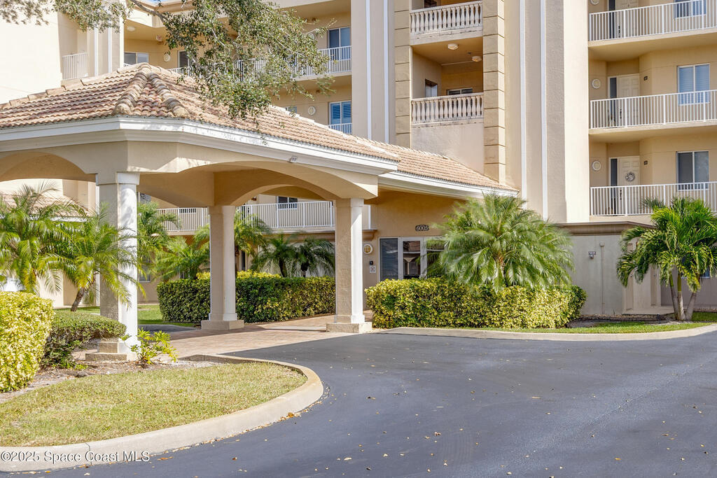 Be sure to include this updated Laguna Vista condo on your ''Must See List'! Move-in ready and beautifully maintained, convenient first-floor riverfront unit is located on the South side of the building and includes a private oversized two-car garage on the same side for easy access. This spacious condo features 3 bedrooms, 2.5 bathrooms, and an open floor plan with high ceilings. Tile flooring runs throughout the main living areas, with carpet in the bedrooms for added comfort. The utility room includes a washer, dryer, and utility sink for convenience. Step out to the tiled, covered back porch - complete with a gate that provides direct access to the pool, spa, and dock area, perfect for swimming, relaxing, or fishing, etc. Take in the stunning sunrise views over the Intracoastal River and enjoy watching rocket launches to the North right from your own backyard! The updated kitchen is truly impressive, featuring abundant cabinetry, stainless steel appliances, and modern finishes.
