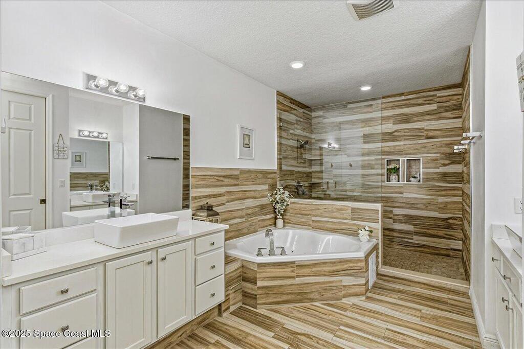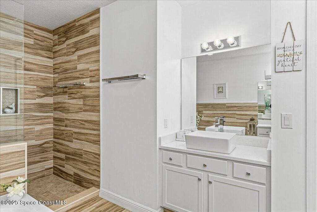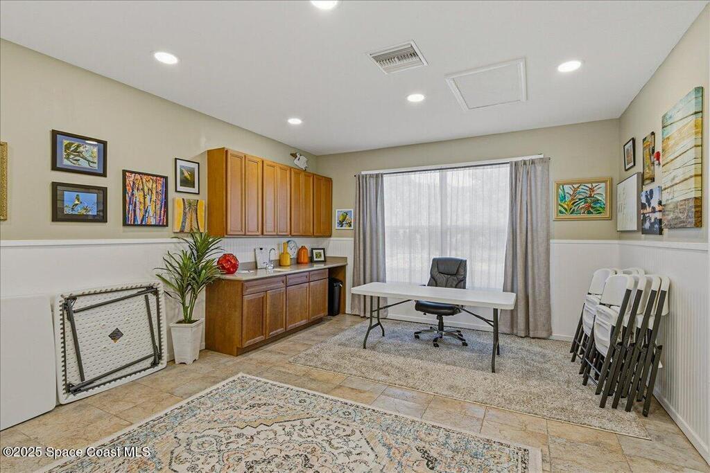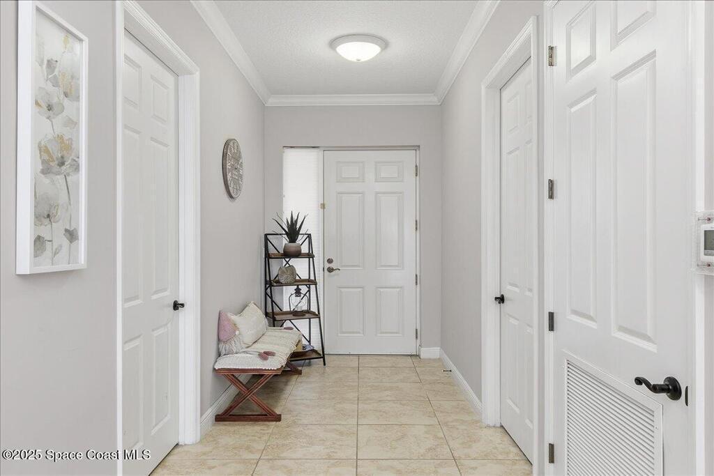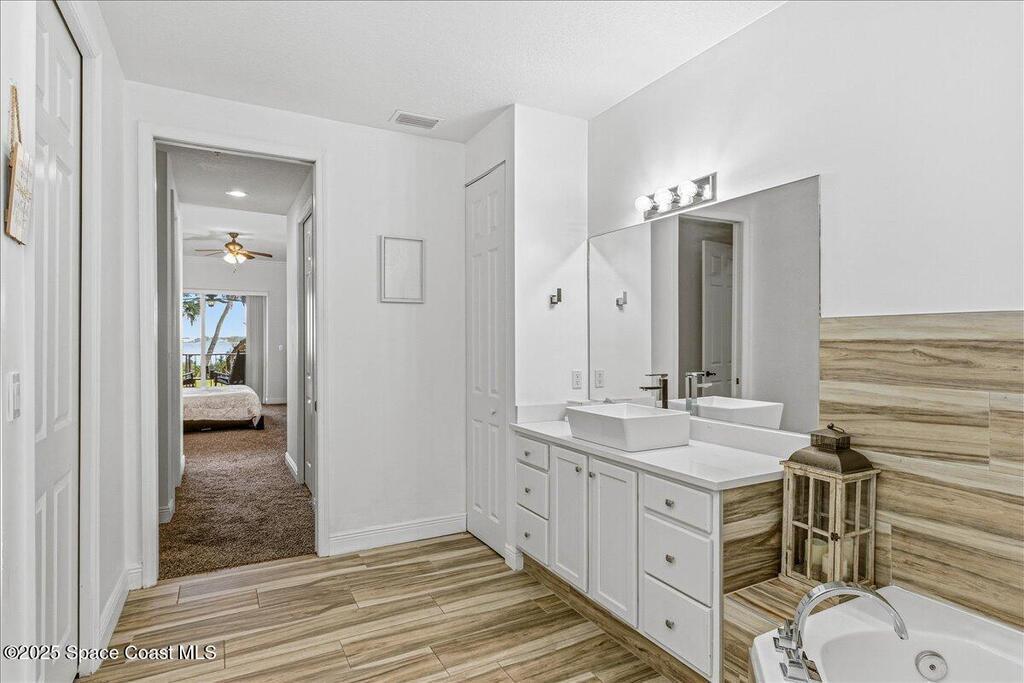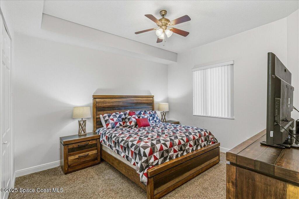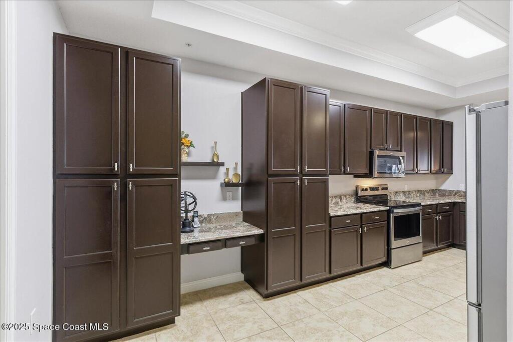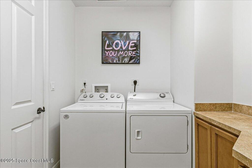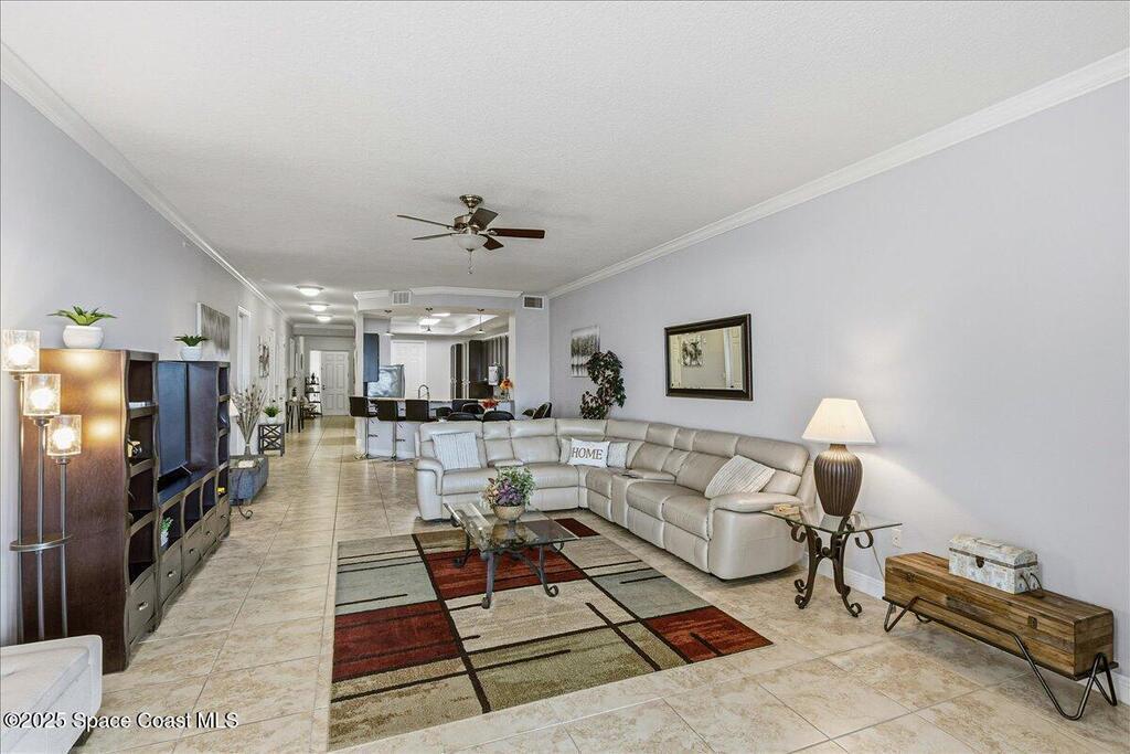 Be sure to include this updated Laguna Vista condo on your ''Must See List'! Move-in ready and beautifully maintained, convenient first-floor riverfront unit is located on the South side of the building and includes a private oversized two-car garage on the same side for easy access. This spacious condo features 3 bedrooms, 2.5 bathrooms, and an open floor plan with high ceilings. Tile flooring runs throughout the main living areas, with carpet in the bedrooms for added comfort. The utility room includes a washer, dryer, and utility sink for convenience. Step out to the tiled, covered back porch - complete with a gate that provides direct access to the pool, spa, and dock area, perfect for swimming, relaxing, or fishing, etc. Take in the stunning sunrise views over the Intracoastal River and enjoy watching rocket launches to the North right from your own backyard! The updated kitchen is truly impressive, featuring abundant cabinetry, stainless steel appliances, and modern finishes.