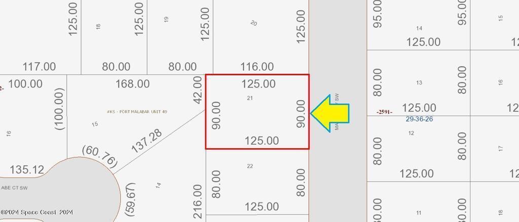 It's a .26 acre buildable residential lot with powerlines at the street available in Port Malabar Unit 49 of Palm Bay. Located in the southwest section, this lot is just 1.6 miles - 4 minutes to Westside Elementary School, 3.4 miles - 8 minutes to the Publix Supermarket, 14.6 miles - 31 minutes to Melbourne Airport, and 17.6 miles - 38 minutes to the beaches of Indialantic. From exit #176 of I-95 go west on Palm Bay Road for .7 miles, left on Minton Road for 3.3 miles, right on Jupiter Boulevard, quick left on DeGroodt Road for 2.5 miles, right on JA Bombardier Boulevard for .9 miles, and left on Madden Avenue. The lot will be on your right in 1.0 mile. Owner will only consider (a) a full price offer, and (b) a closing AFTER 01/02/2026 (this is for tax purposes).