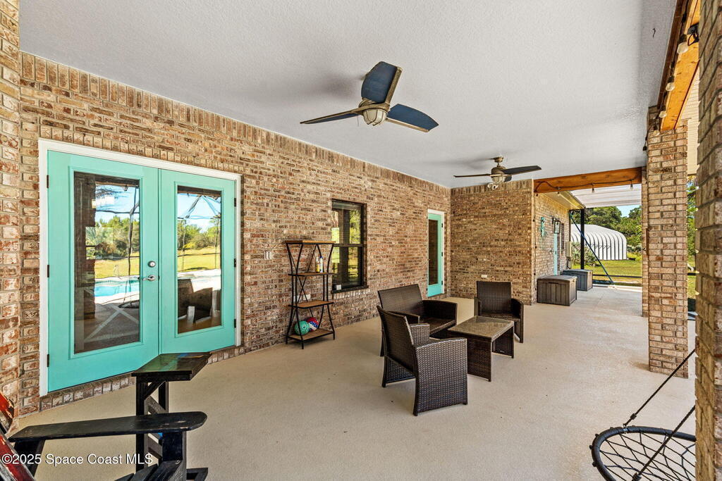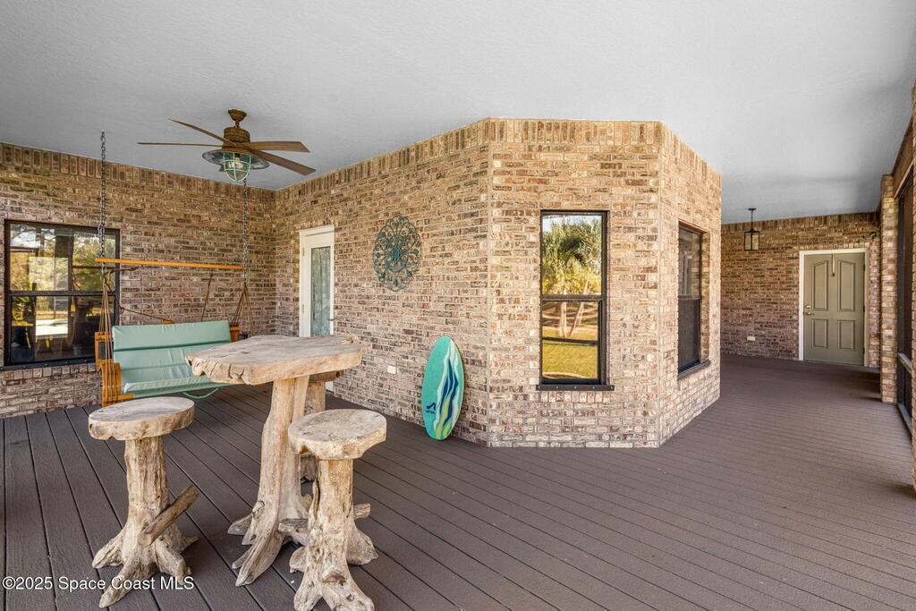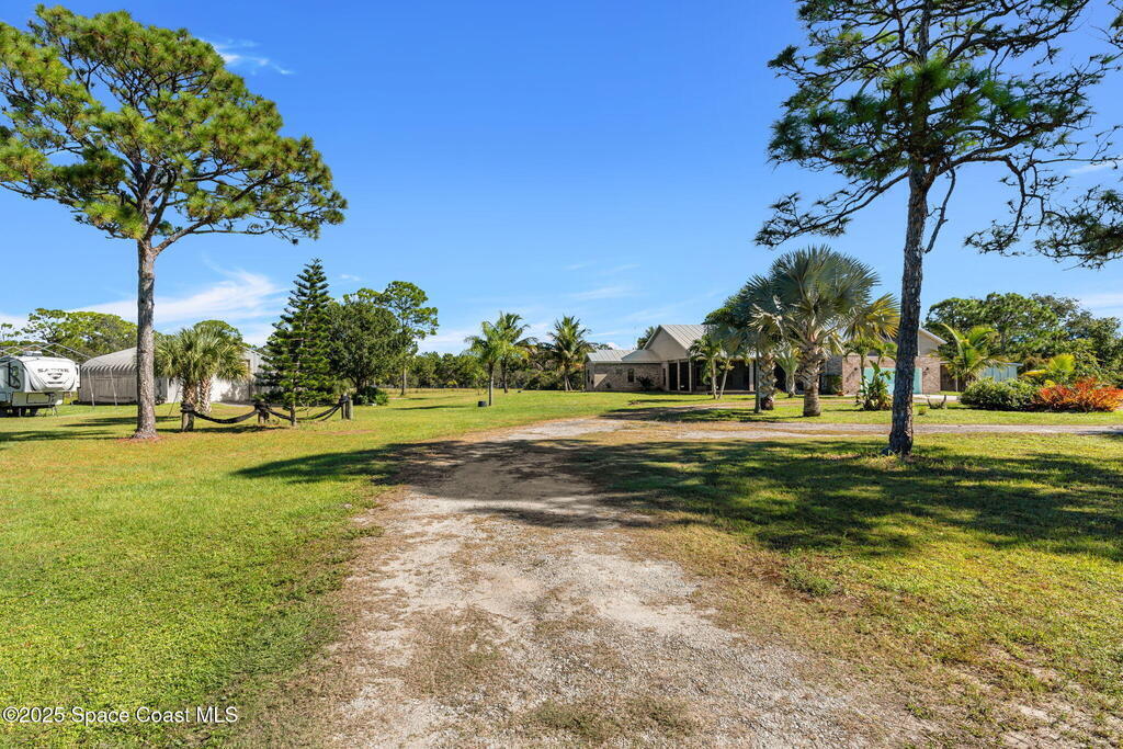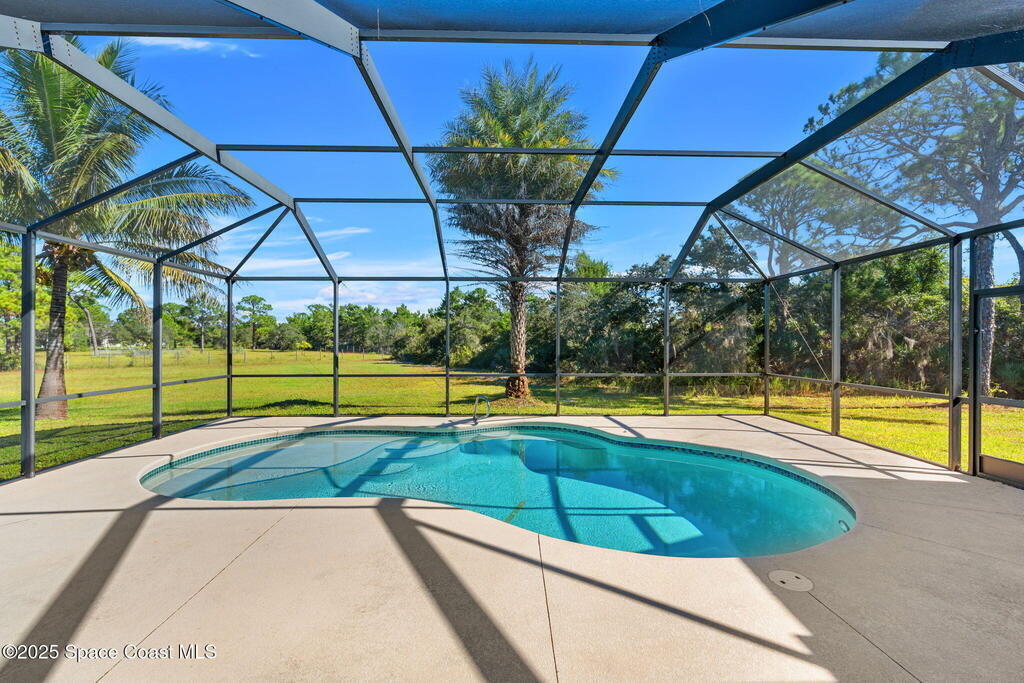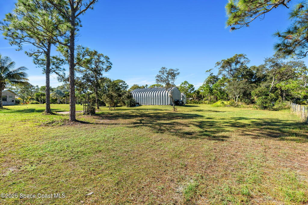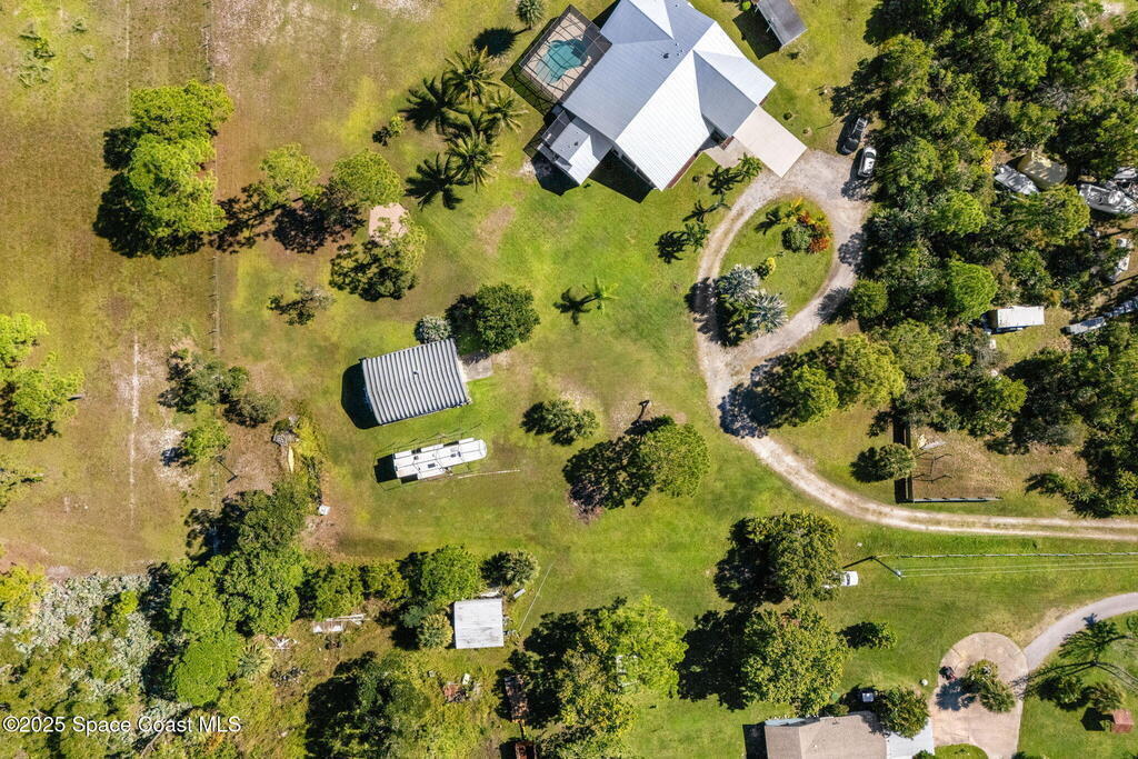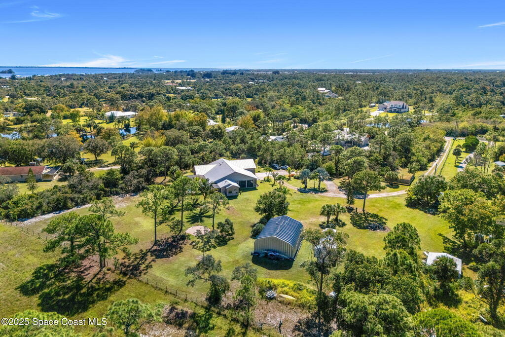 Private 2.5-Acre Estate in Grant-Valkaria! This charming 4-bed, 3-bath home offers the perfect blend of privacy, space, and quality. Built with reinforced concrete and featuring a new metal roof and hurricane shutters, this home is built to last. At its heart is a stunning kitchen with Viking appliances, custom wood cabinetry, granite counters, and a central island that opens to the living area. The spacious primary suite includes dual walk-in closets, double vanities, a soaking tub, and a glass-block walk-in shower. Upstairs, a private guest suite features a balcony and full bath. Enjoy the screened saltwater pool and oversized covered porch, perfect for entertaining or relaxing in total privacy. The 1,160 sq. ft. metal outbuilding with roll-up door is ideal for a workshop, gym, or RV/boat storage. An upgraded hydrogen water system, dedicated office with scenic views, charming screened front porch, and attached 2-car garage complete this exceptional property!