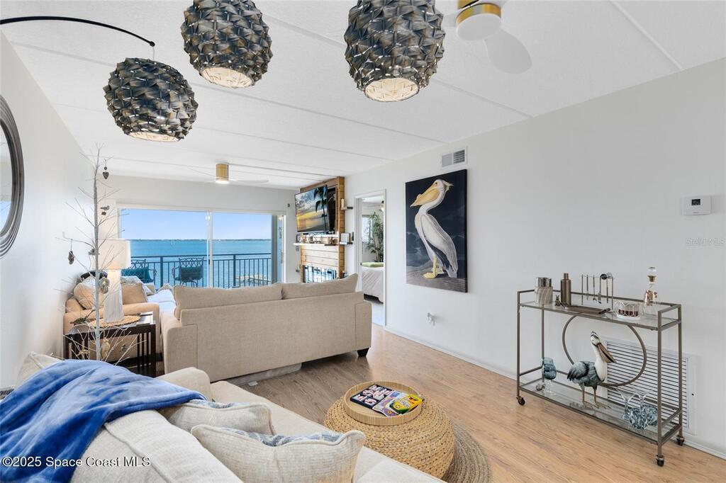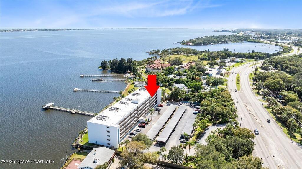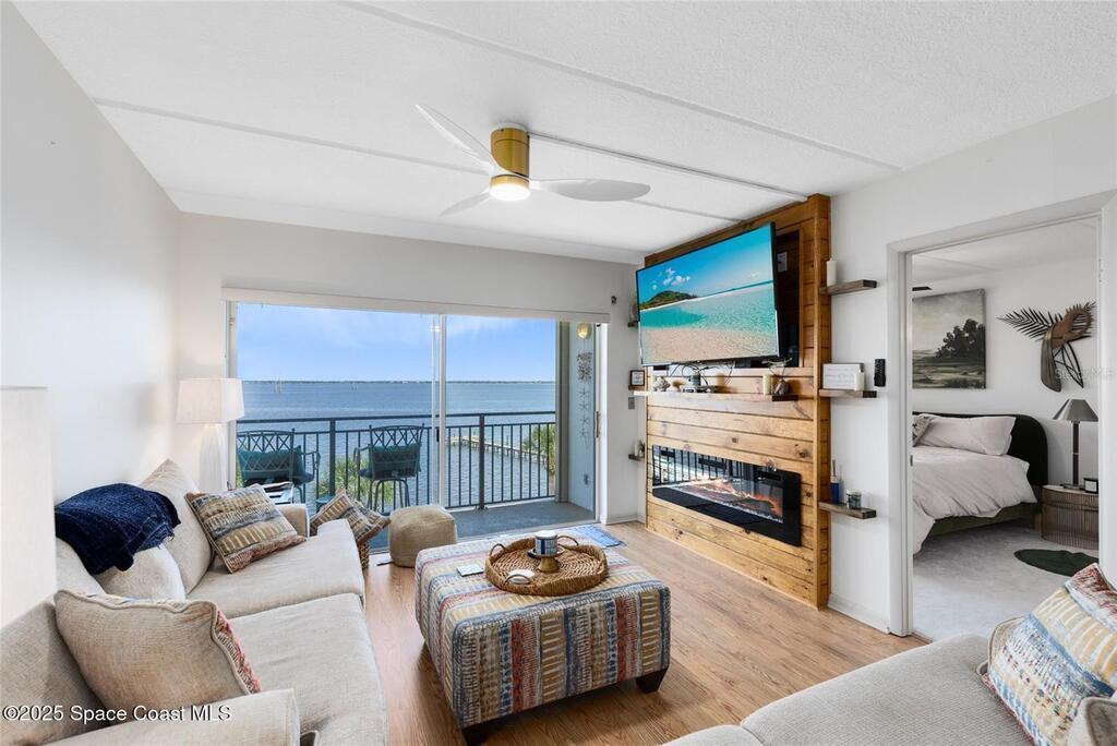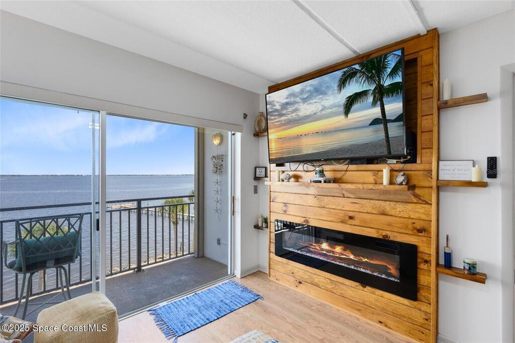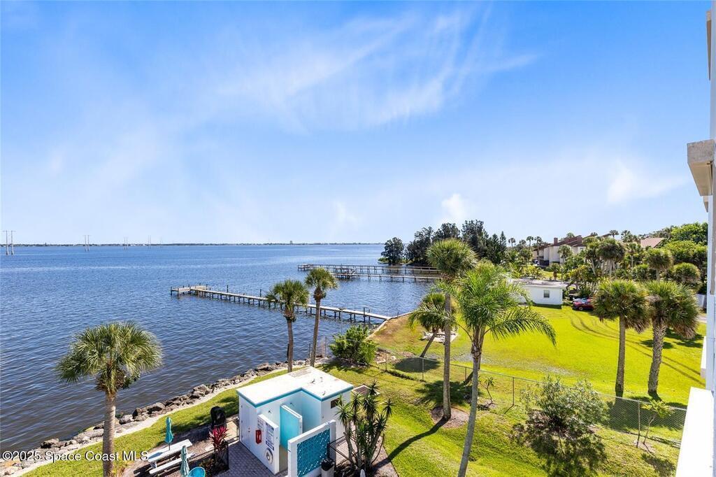 Welcome to your dream retreat on the Indian River in Palm Bay! This COMPLETELY renovated condo showcases elegant coastal style with gold fixtures throughout, custom wood features, a wine cooler, brand-new kitchen, and new carpet in the bedrooms. Situated on the 4th floor of Castaway Cove, you'll enjoy stunning sunrises, refreshing breezes, and the serenity of watching dolphins and manatees play from your private balcony. In the evenings, relax and watch rocket launches illuminate the sky--all from the comfort of home. The community offers riverside pool access, a dock, covered parking, and a secure lobby for peace of mind. The HOA covers exterior maintenance, cable, water, sewer, garbage, pest control, groundskeeping, and insurance, ensuring a true maintenance-free lifestyle. Luxury, comfort, and nature come together seamlessly in this beautiful waterfront condo. (Note: No short-term rentals permitted.)