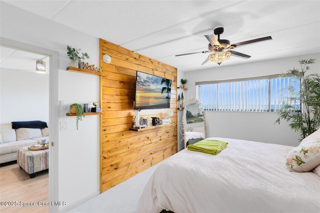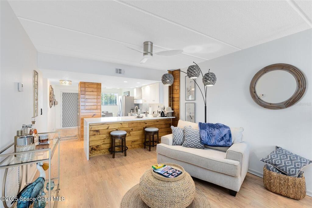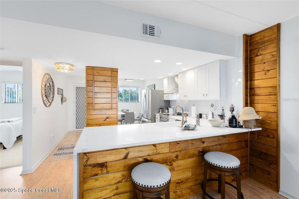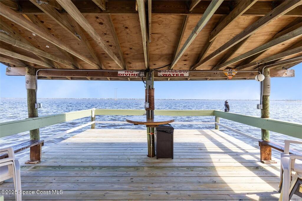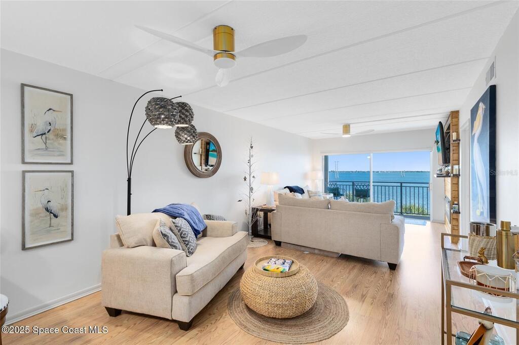 Welcome to your dream retreat on the Indian River in Palm Bay! This COMPLETELY renovated condo showcases elegant coastal style with gold fixtures throughout, custom wood features, a wine cooler, brand-new kitchen, and new carpet in the bedrooms. Situated on the 4th floor of Castaway Cove, you'll enjoy stunning sunrises, refreshing breezes, and the serenity of watching dolphins and manatees play from your private balcony. In the evenings, relax and watch rocket launches illuminate the sky--all from the comfort of home. The community offers riverside pool access, a dock, covered parking, and a secure lobby for peace of mind. The HOA covers exterior maintenance, cable, water, sewer, garbage, pest control, groundskeeping, and insurance, ensuring a true maintenance-free lifestyle. Luxury, comfort, and nature come together seamlessly in this beautiful waterfront condo. (Note: No short-term rentals permitted.)