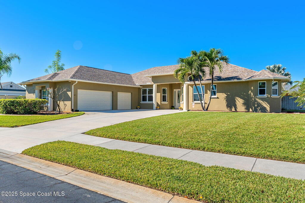Surrounded by swaying palms on a .34-acre corner lot, this South Merritt Island home offers an inviting blend of tropical charm and modern comfort. Featuring 3 bedrooms, a dedicated office, 2.5 baths, and versatile formal living and dining areas, this home is as functional as it is relaxing. The open kitchen shines with solid maple cabinetry, granite counters, and stainless appliances. The spacious primary suite includes two walk-in closets, a shower, and a garden tub. Step onto the large screened porch and enjoy a private backyard oasis filled with fruit trees. Over $120K in upgrades include a 2021 roof, impact-rated windows and doors, 2023 AC, and energy-efficient systems that help deliver a surprisingly low insurance premium. The oversized 1,200 sq ft 3-car garage with epoxy floors and attic storage adds flexibility and value. In a quiet, desirable neighborhood near top-rated schools, shopping, and Rotary Park, this home is priced below a recent $720K appraisal.