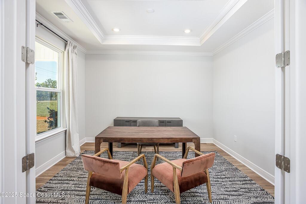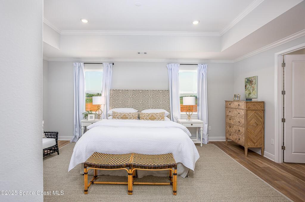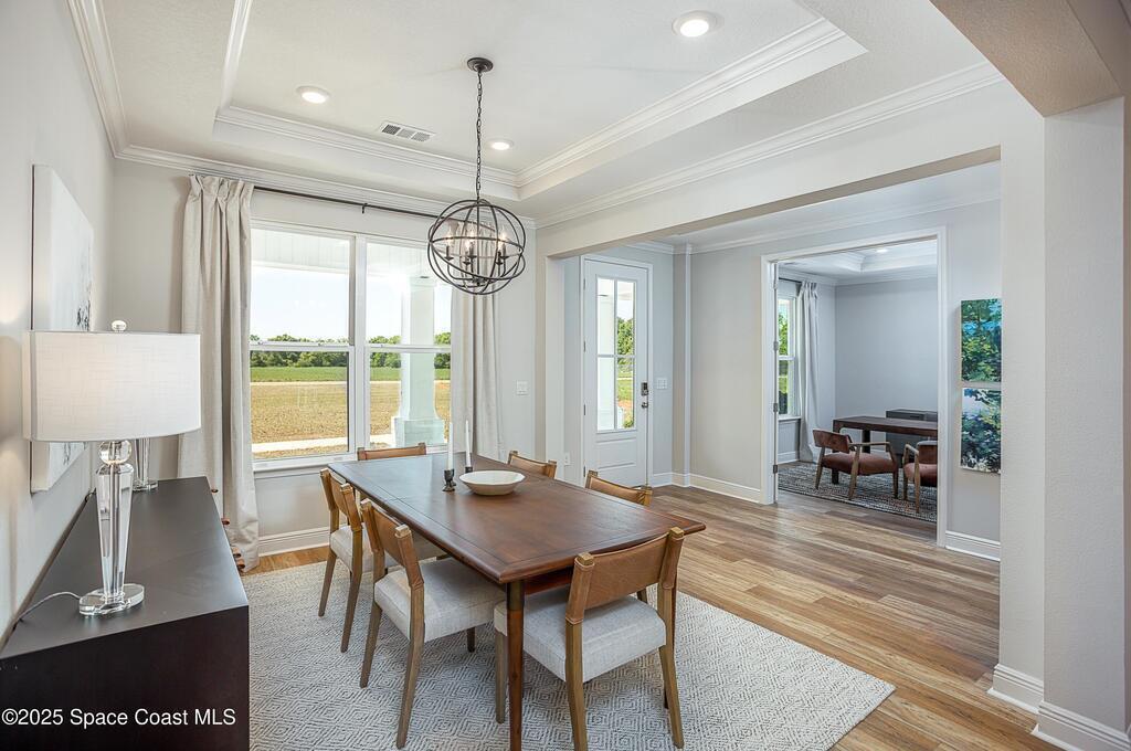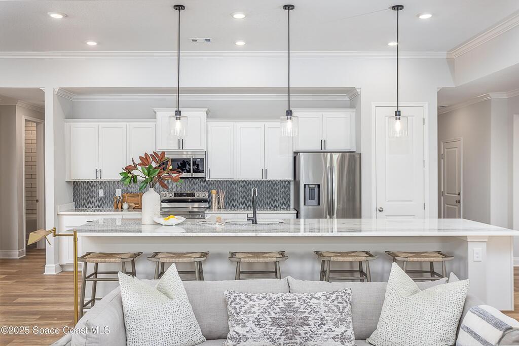 Under Construction. Eagle Crest in Grant-Valkaria sets a new standard for luxury living, offering a gated enclave of privacy, elegance, and exquisite craftsmanship on oversized, landscaped lots. This stunning home immediately commands attention with its brick-paved entry and driveway, three-car garage, and exceptional street appeal.Step through the covered entry into a grand foyer that impresses with 10-foot ceilings, crown molding, and a seamless flow into the formal dining room with tray ceiling--perfect for hosting unforgettable gatherings. A den with double French glass doors provides a private retreat ideal for work or leisure.The gourmet kitchen is a chef's dream, featuring Quartz countertops, a large island, soft-close cabinets, tile backsplash, and a full line of stainless steel appliances, including an ENERGY STAR counter-depth French door refrigerator and double wall oven. The open layout connects the kitchen to the great room,