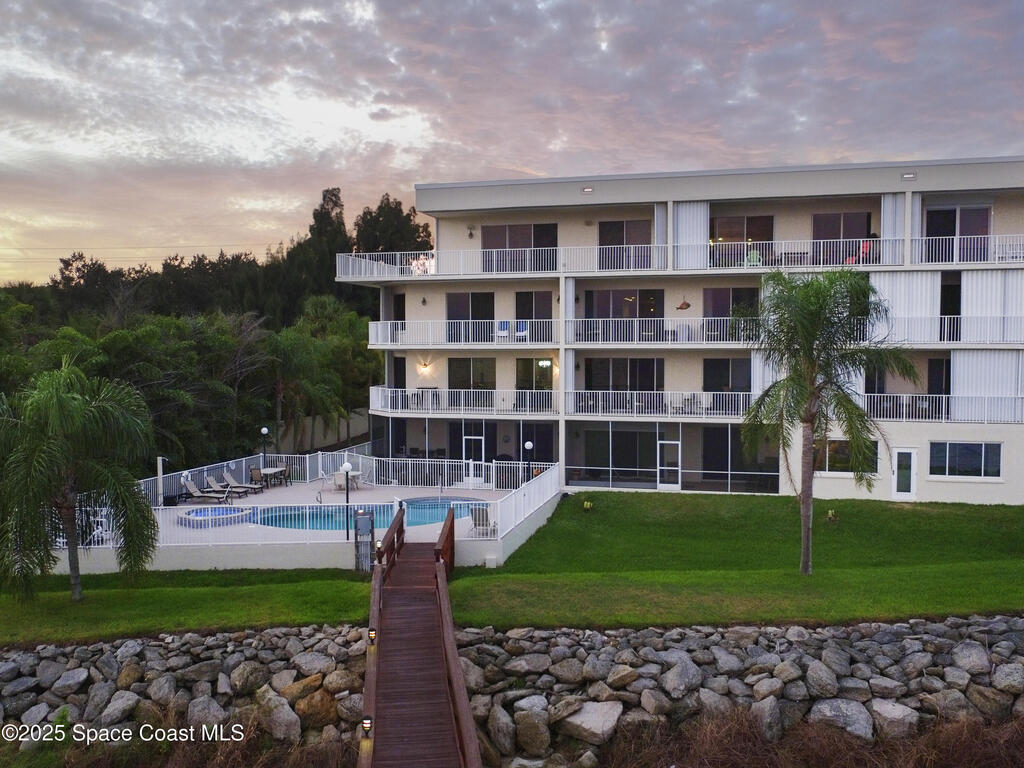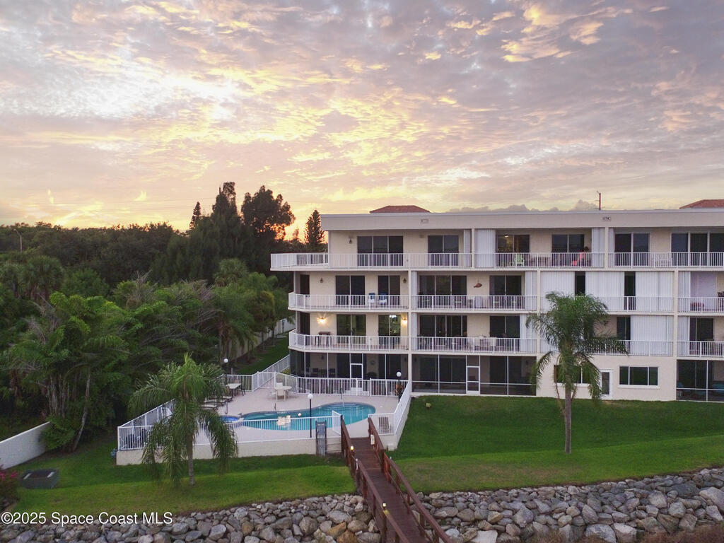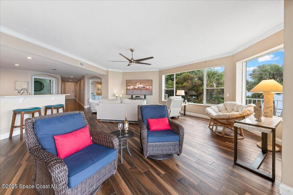 Spacious & Luxurious Riverfront Condo. Fully Furnished North East Corner Residence offers Stunning, Panoramic views of the Indian River from its expansive wrap-around balcony.The property provides 2,321 sq. ft. of Grand living space & boasts a tranquil & elegant atmosphere. Featuring 3 bedrooms, 3 bath, & a versatile den/4th bedroom. It includes designer touches and 9ft. ceilings throughout.The gourmet kitchen is equipped w/an island, breakfast bar, and Quartzite countertops w/a leather finish. It features SS appliances & an abundance of quality cabinetry. Wood plank tile flooring runs throughout the main living areas.The master suite is a true retreat, featuring sliders that open to a private balcony, plantation shutters, & two walk-in closets. The spacious master bath includes a Jacuzzi tub, separate shower, & dual vanities.Enjoy Spectacular Sunrises & watch playful dolphins from the comfort of your home,kitchen, living dining areas, & master suite all offer gorgeous river views.