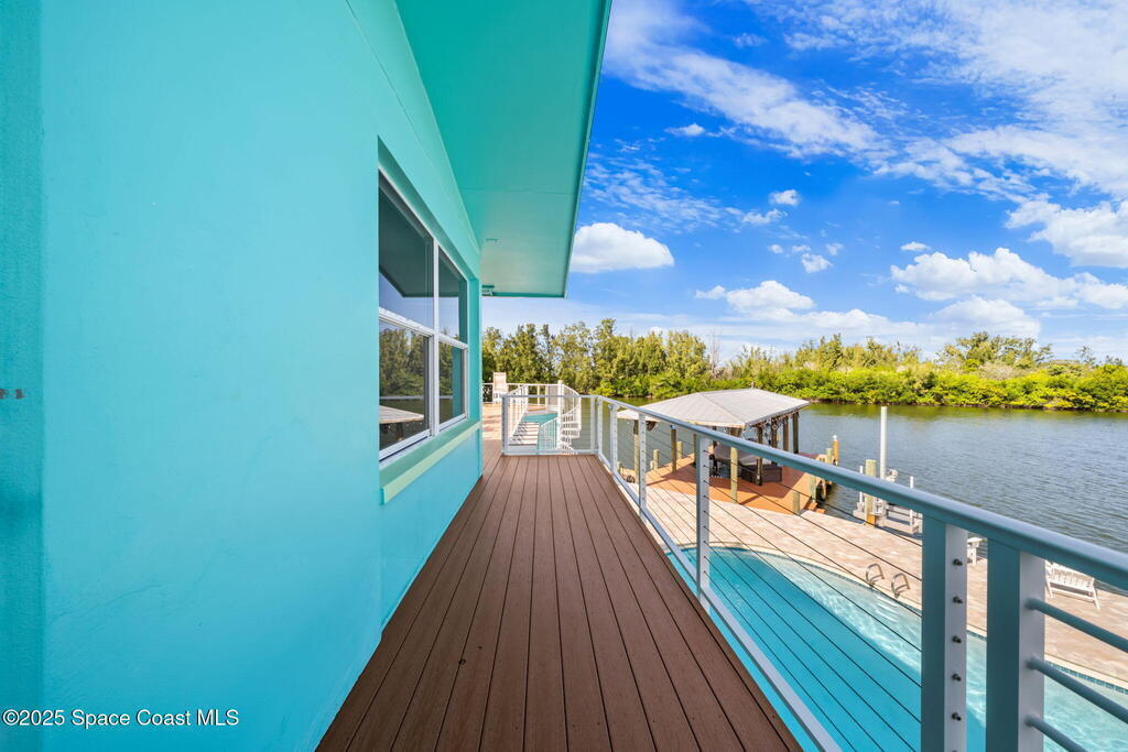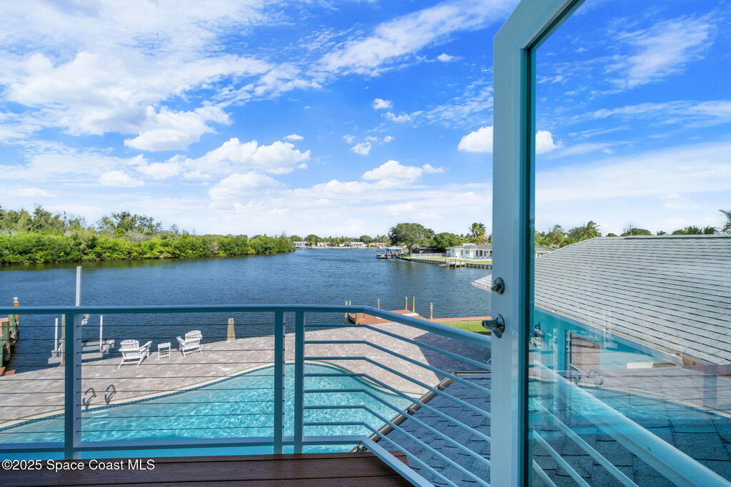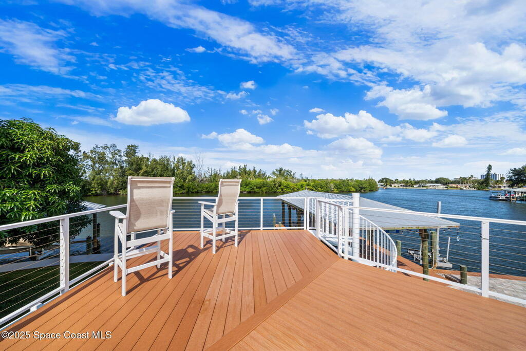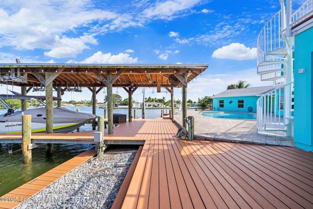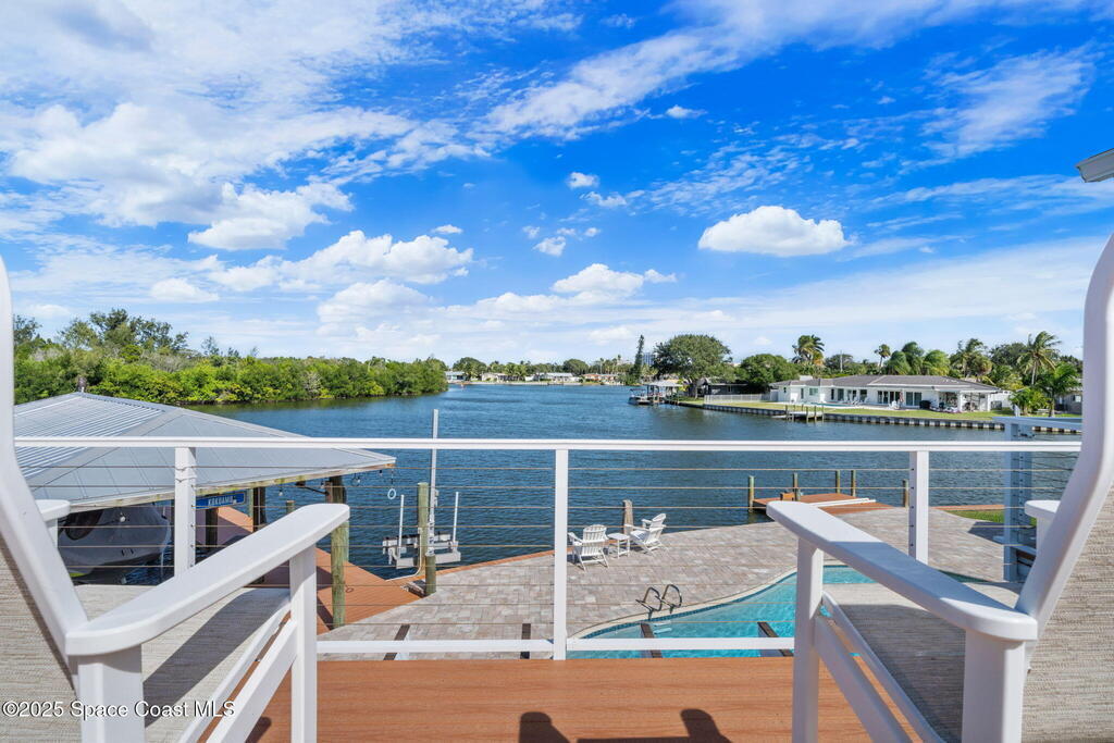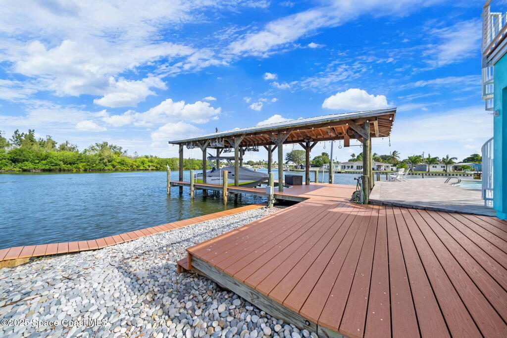 Your waterfront playground awaits! Enjoy 140 feet of direct waterfront with a heated pool, outdoor wet bar, and rooftop deck perfect for sunset views. Watch dolphins, manatees, and boats glide by or head out from your private dock with 10,000 lb boat and jet ski lifts. The thoughtful floor plan offers separate living areas for family and guests, while a fenced yard and quiet cul-de-sac setting provide privacy and peace. Recent updates include a new dock and lifts, custom garage for watercraft and gear, outdoor fitness area, and screened in porch and rooftop deck. With a two-car garage, ample storage, and endless ways to relax or entertain, this home is designed for everyday enjoyment accompanied by a waterfront lifestyle. Move in just in time to host the Cocoa Beach Holiday Boat Parade--front-row waterfront views from your own backyard!