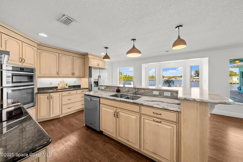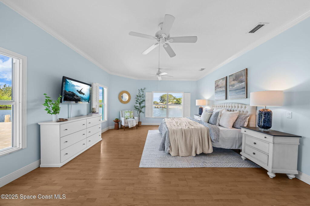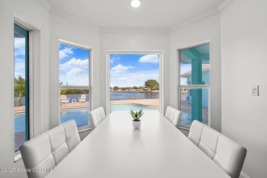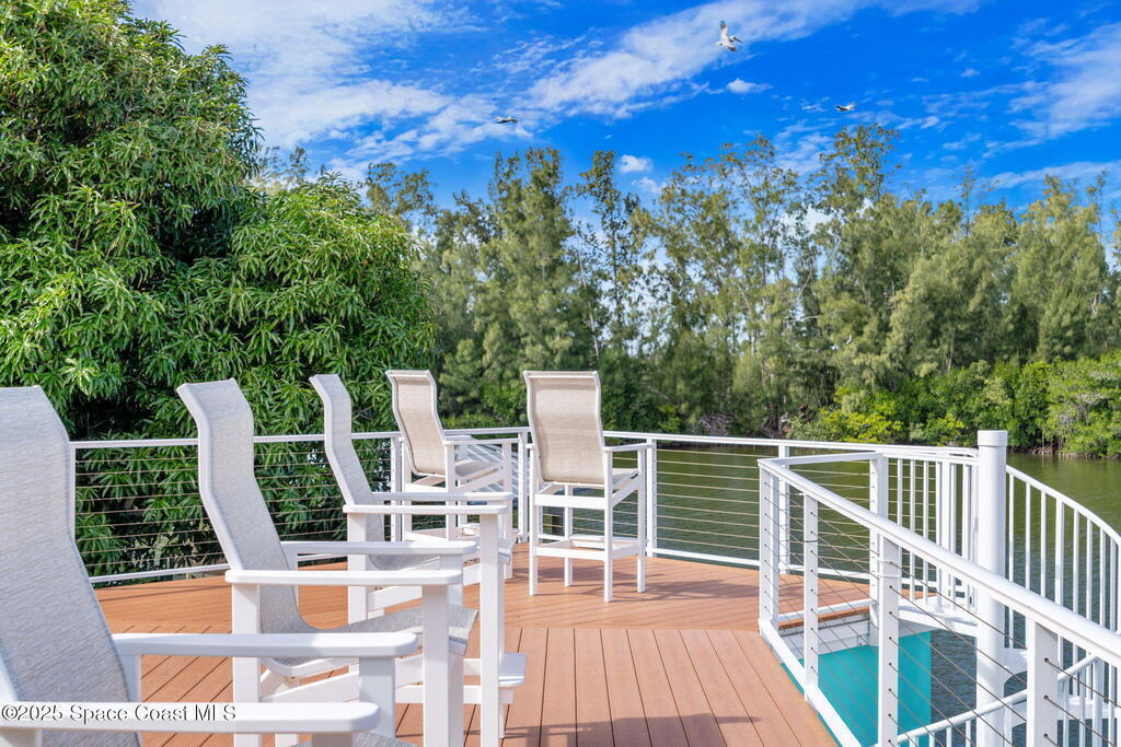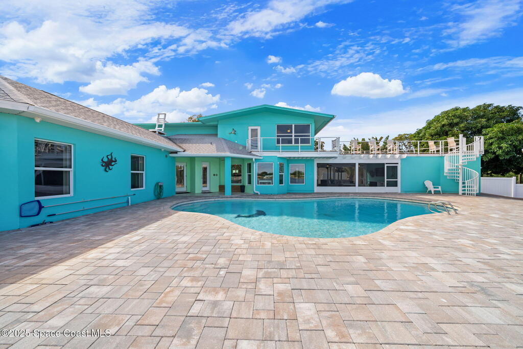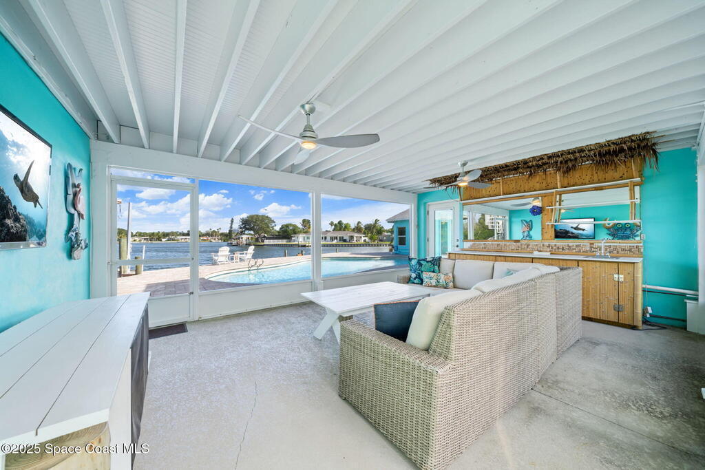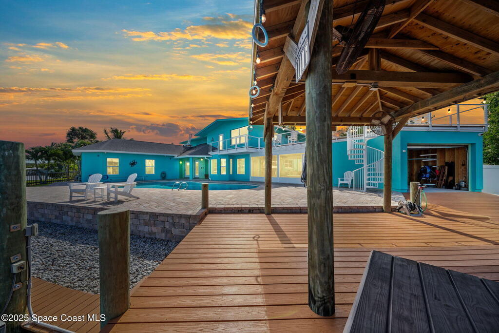 Your waterfront playground awaits! Enjoy 140 feet of direct waterfront with a heated pool, outdoor wet bar, and rooftop deck perfect for sunset views. Watch dolphins, manatees, and boats glide by or head out from your private dock with 10,000 lb boat and jet ski lifts. The thoughtful floor plan offers separate living areas for family and guests, while a fenced yard and quiet cul-de-sac setting provide privacy and peace. Recent updates include a new dock and lifts, custom garage for watercraft and gear, outdoor fitness area, and screened in porch and rooftop deck. With a two-car garage, ample storage, and endless ways to relax or entertain, this home is designed for everyday enjoyment accompanied by a waterfront lifestyle. Move in just in time to host the Cocoa Beach Holiday Boat Parade--front-row waterfront views from your own backyard!