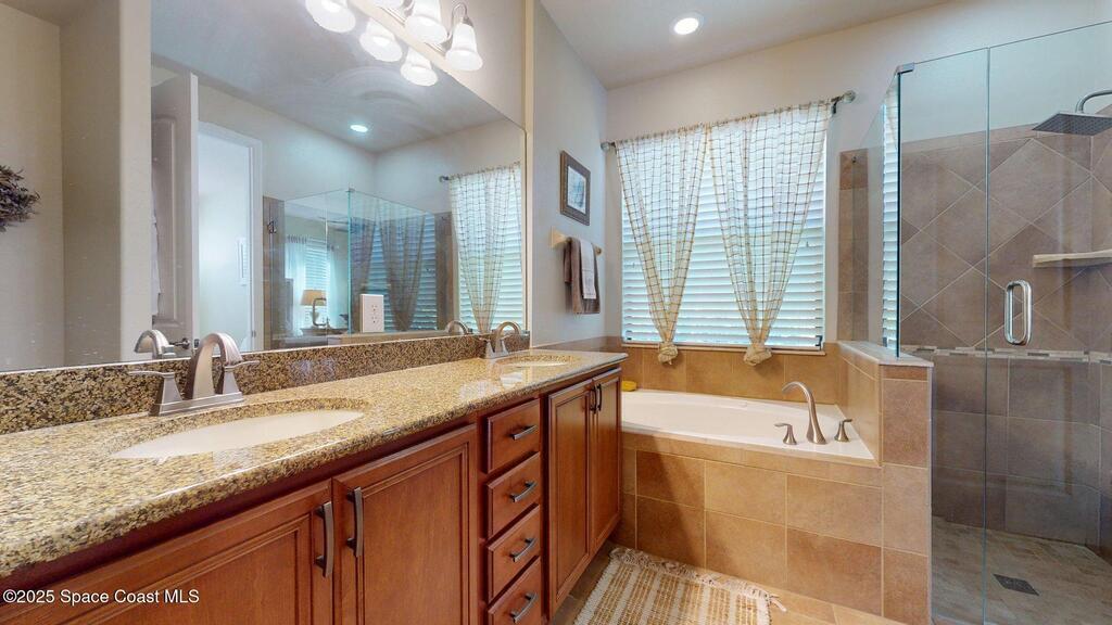 Interior Features: Breakfast Bar, Breakfast Nook, Ceiling Fan(s), Eat-in Kitchen, Entrance Foyer, Guest Suite, His and Hers Closets, In-Law Floorplan, Kitchen Island, Pantry, Primary Bathroom -Tub with Separate Shower, Primary Downstairs, Smart Thermostat, Split Bedrooms and Walk-In Closet(s)