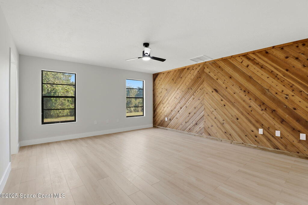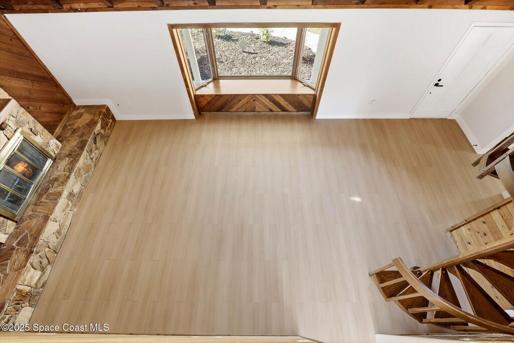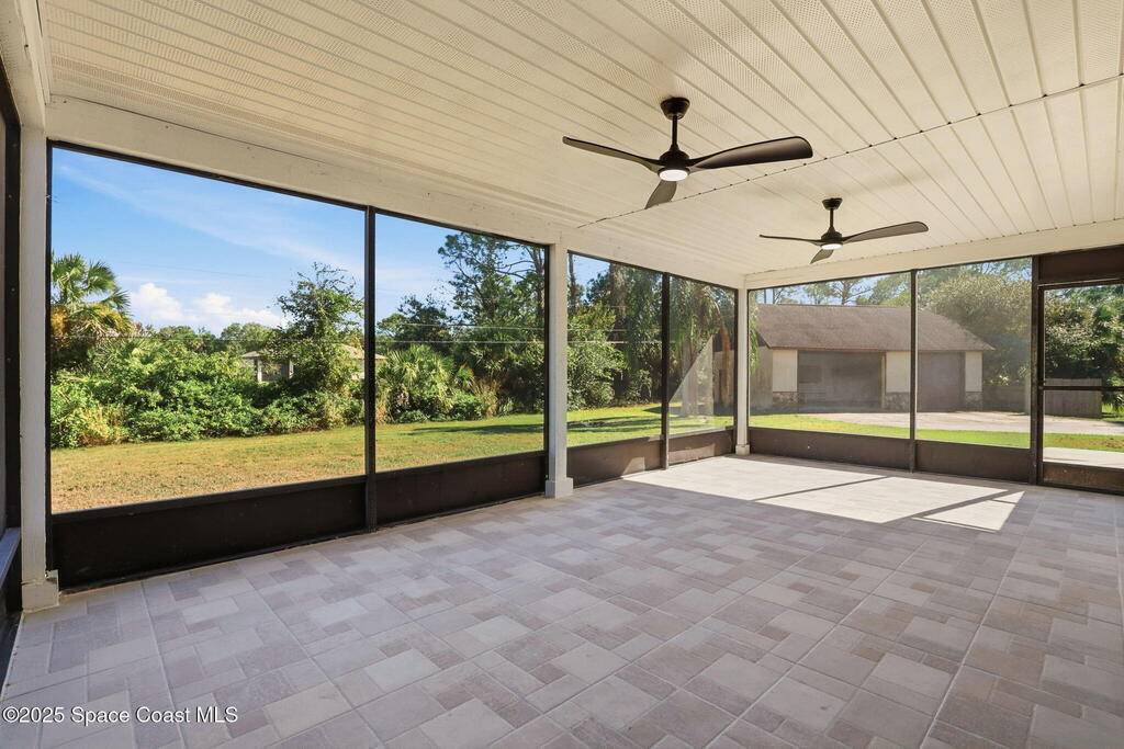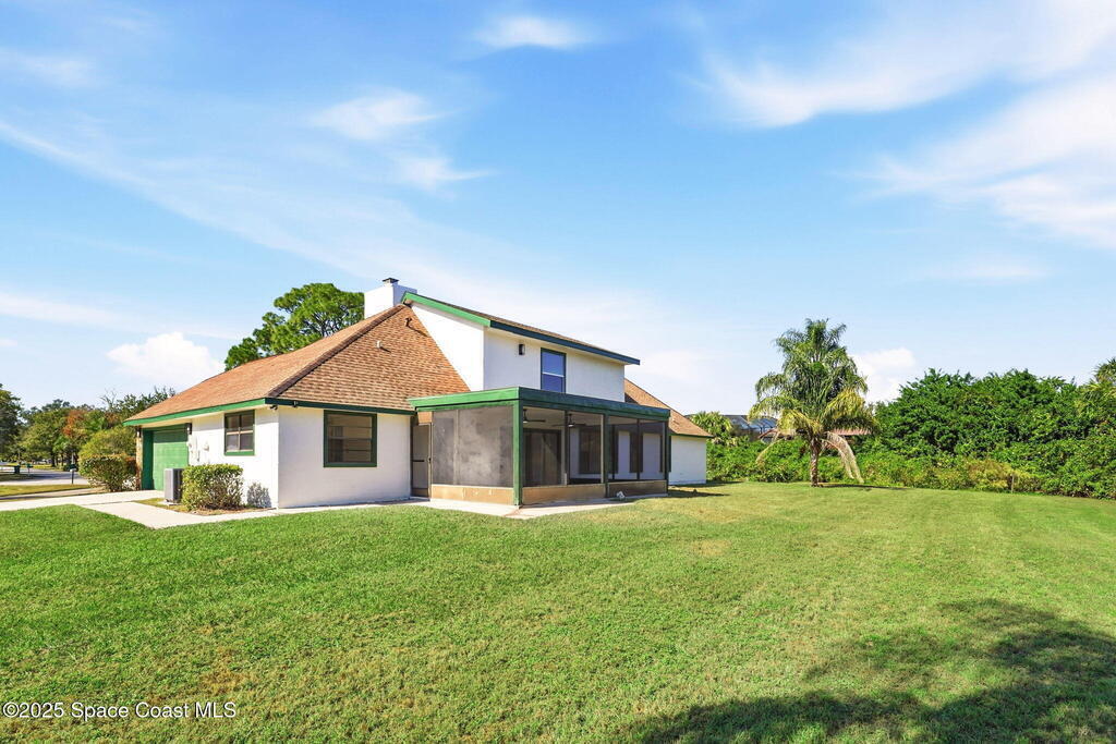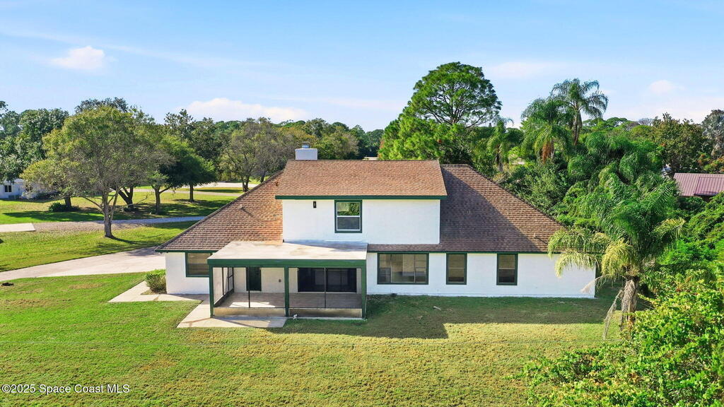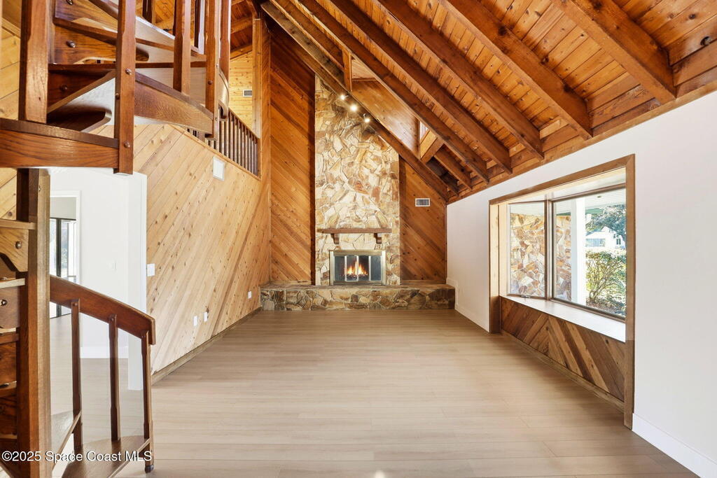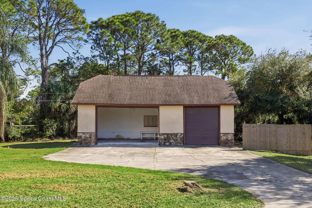 This fully renovated 4 bedroom, 3 bathroom home is located in a sought-after Cocoa neighborhood and sits on a spacious 1.05 acre lot. The property features beautiful curb appeal, manicured landscaping, a 2-car attached garage, and a detached garage perfect for extra parking, storage, or a workshop. Inside, you'll find brand new luxury vinyl flooring, modern light fixtures, and an open layout. The living room includes a stone-lined fireplace, and the updated kitchen offers stainless steel appliances and quartz countertops with a sliding glass door leading to the screened-in patio. The bedrooms have ceiling fans, large windows, and plenty of natural light. The primary bathroom features a renovated tile-lined shower and updated vanity. A bonus space upstairs is ideal for an office or extra living area. With no HOA and a large backyard perfect for gatherings, this home offers both space and convenience. Easy access to beaches, Port Canaveral, the Space Center, and Orlando nearby.