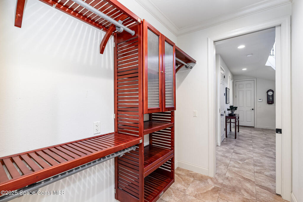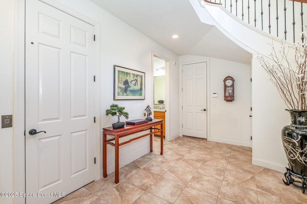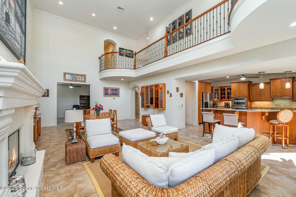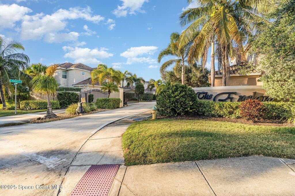 Located within the prestigious Enclave at Three Hundred, this luxury villa offers premier coastal living in a gated community of just 24 residences, situated three blocks from downtown Cocoa Beach and directly across from the ocean. With 3,463 SF under air (4,461 SF total), this home has 4 bedrooms (or 3 plus a media/office room), 3 baths, & a 3-car garage. A private courtyard entrance with an elegant fountain sets the tone as you step inside to soaring 20-foot vaulted ceilings in the main living areas (9'+ ceilings throughout) with abundant natural light, and elegant details including crown molding, recessed lighting, and a dramatic curved banister staircase. The heart of the home is the designer kitchen, beautifully appointed with tall all-wood cabinetry, granite countertops, stainless steel appliances, under-cabinet lighting, and a breakfast bar overlooking two generous living areas. A gas fireplace enhances the warm coastal ambiance, creating an inviting setting for both everyday