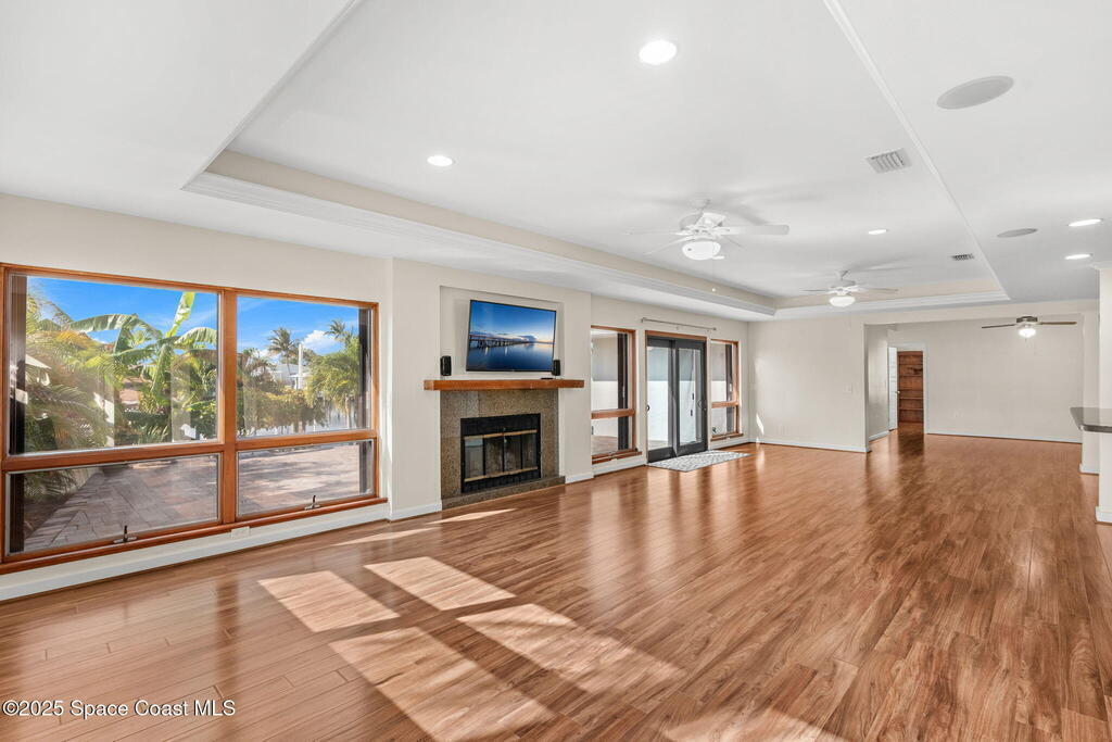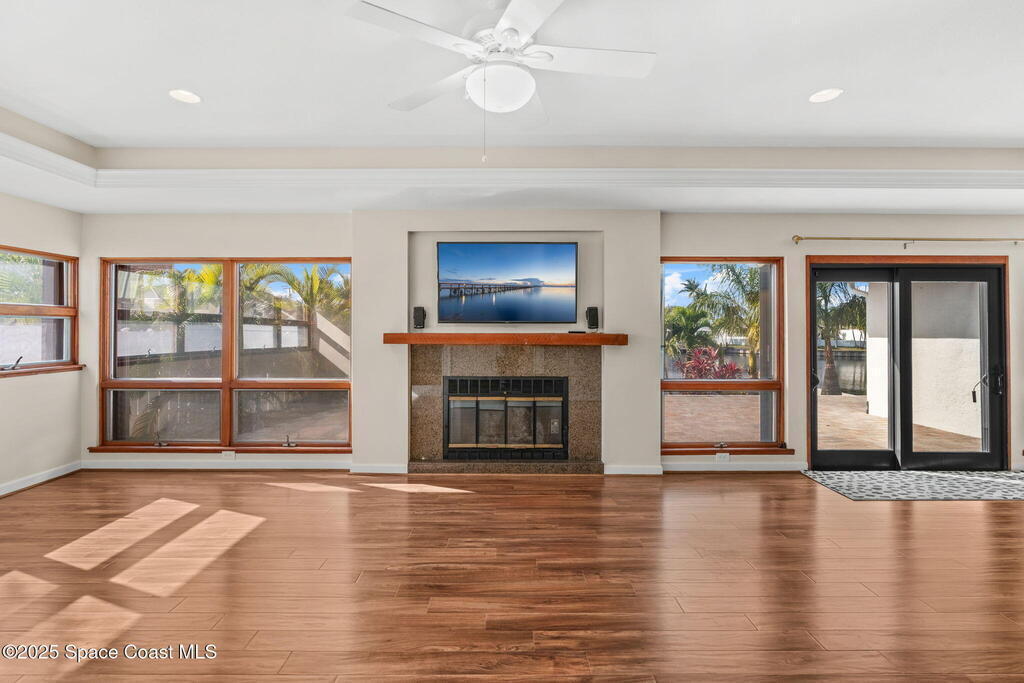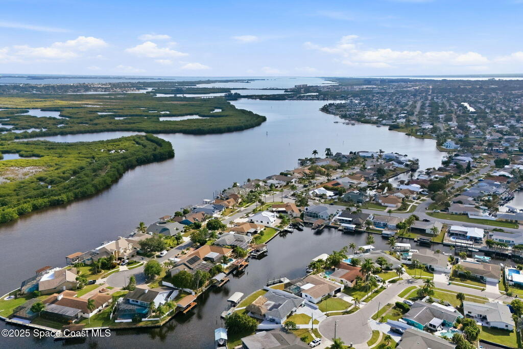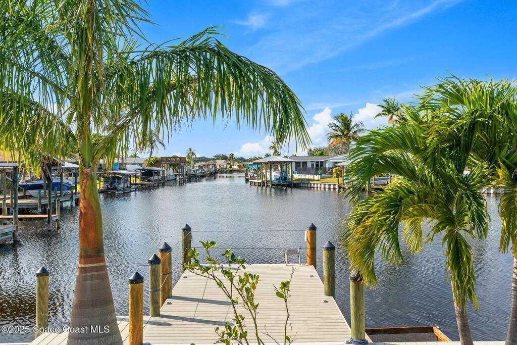 Tucked at the end of a quiet cul-de-sac at the very back of Diana Shores, this canalfront home delivers unbeatable down-the-water views, dreamy sunsets, and direct access to Sykes Creek. Set on one of the widest canals with plenty of room to turn a boat, the home is loaded with upgrades: 8 hurricane-rated windows, whole-house accordion shutters (2022), impact garage door (2023), and an 82' vinyl seawall with composite dock, jet ski lift, and kayak platform (2021). Entertain outdoors on the pavered patio, with a prewired and reinforced middle pad for a hot tub. Inside, enjoy a bright, open split floorplan with travertine and LVP flooring, a remodeled kitchen with gas range, indoor laundry, wood-burning fireplace--and no cast iron plumbing. A metal roof, newer electric panels, tankless gas water heater, privacy fencing, and high-end water filtration system round out the list. Tucked away yet close to 528 and the beach, this is where everyday comfort meets the Space Coast lifestyle.