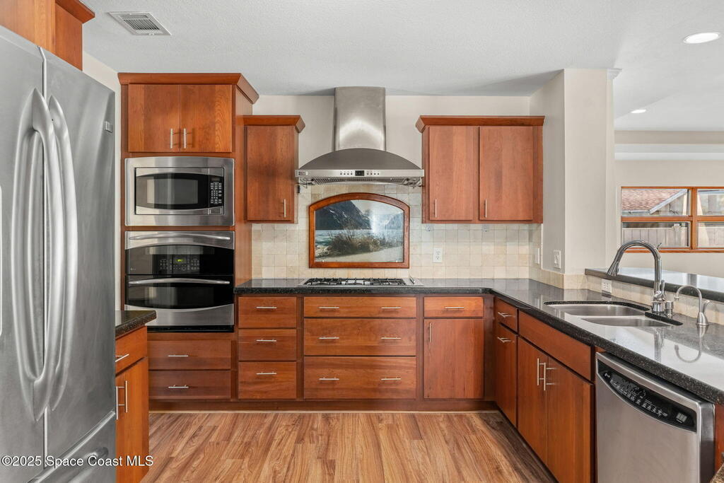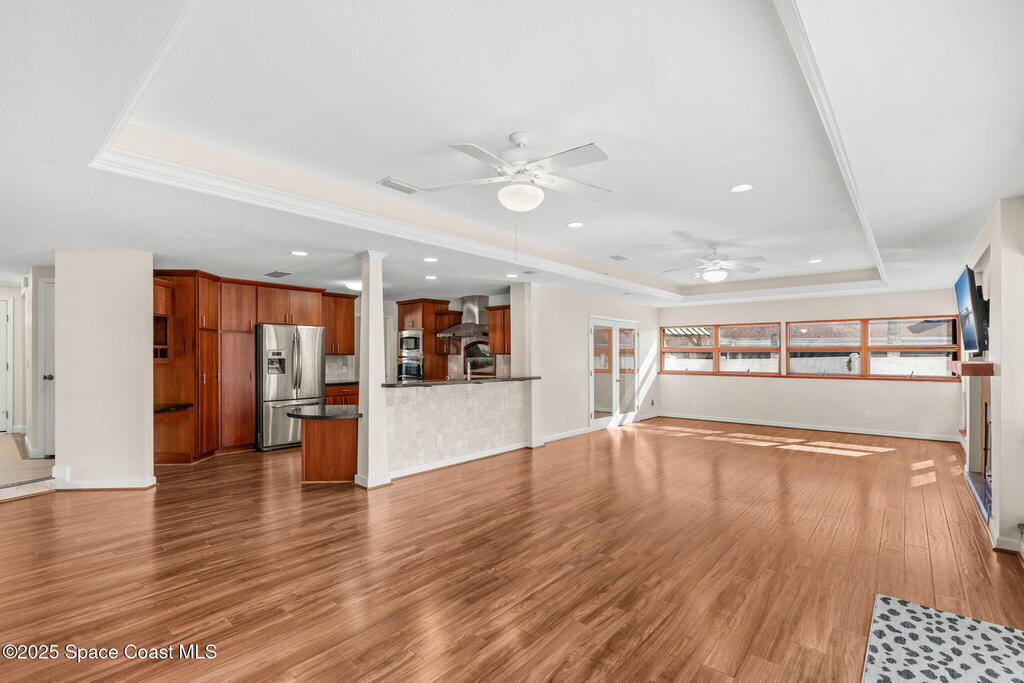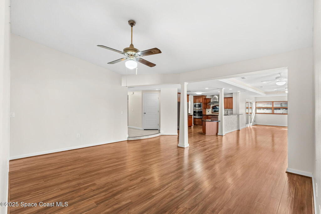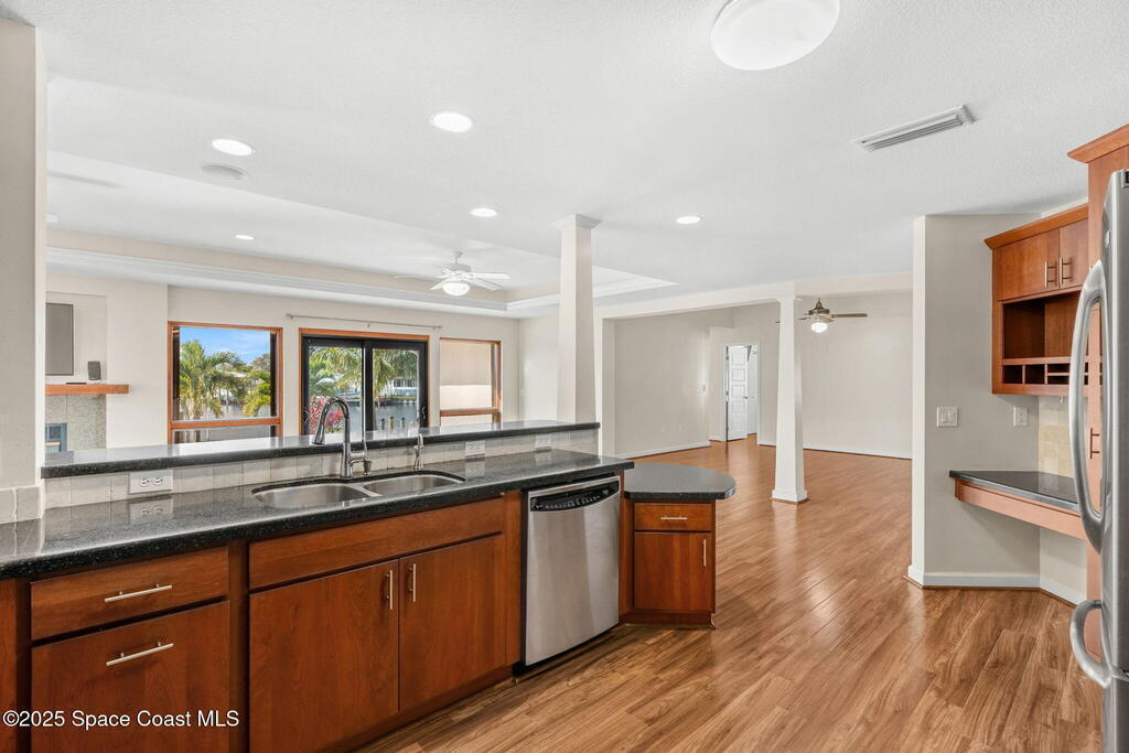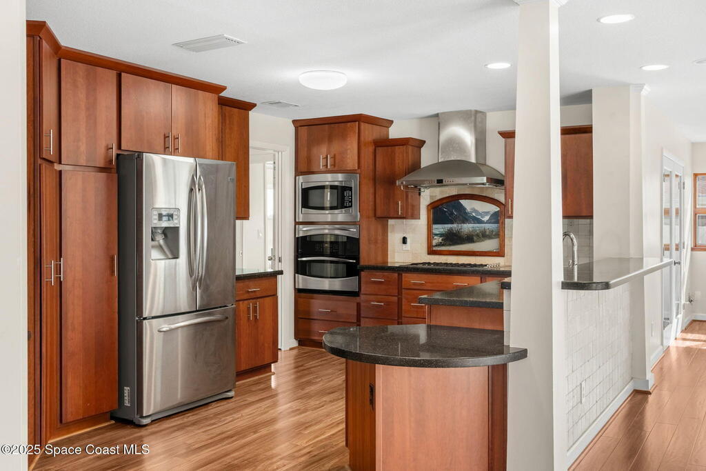 Tucked at the end of a quiet cul-de-sac at the very back of Diana Shores, this canalfront home delivers unbeatable down-the-water views, dreamy sunsets, and direct access to Sykes Creek. Set on one of the widest canals with plenty of room to turn a boat, the home is loaded with upgrades: 8 hurricane-rated windows, whole-house accordion shutters (2022), impact garage door (2023), and an 82' vinyl seawall with composite dock, jet ski lift, and kayak platform (2021). Entertain outdoors on the pavered patio, with a prewired and reinforced middle pad for a hot tub. Inside, enjoy a bright, open split floorplan with travertine and LVP flooring, a remodeled kitchen with gas range, indoor laundry, wood-burning fireplace--and no cast iron plumbing. A metal roof, newer electric panels, tankless gas water heater, privacy fencing, and high-end water filtration system round out the list. Tucked away yet close to 528 and the beach, this is where everyday comfort meets the Space Coast lifestyle.