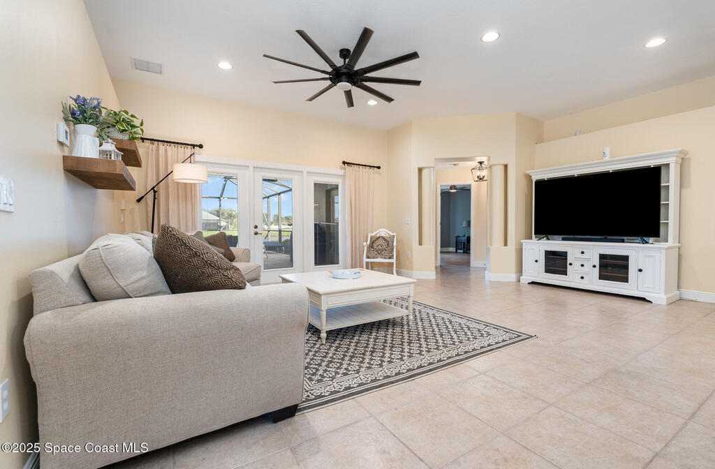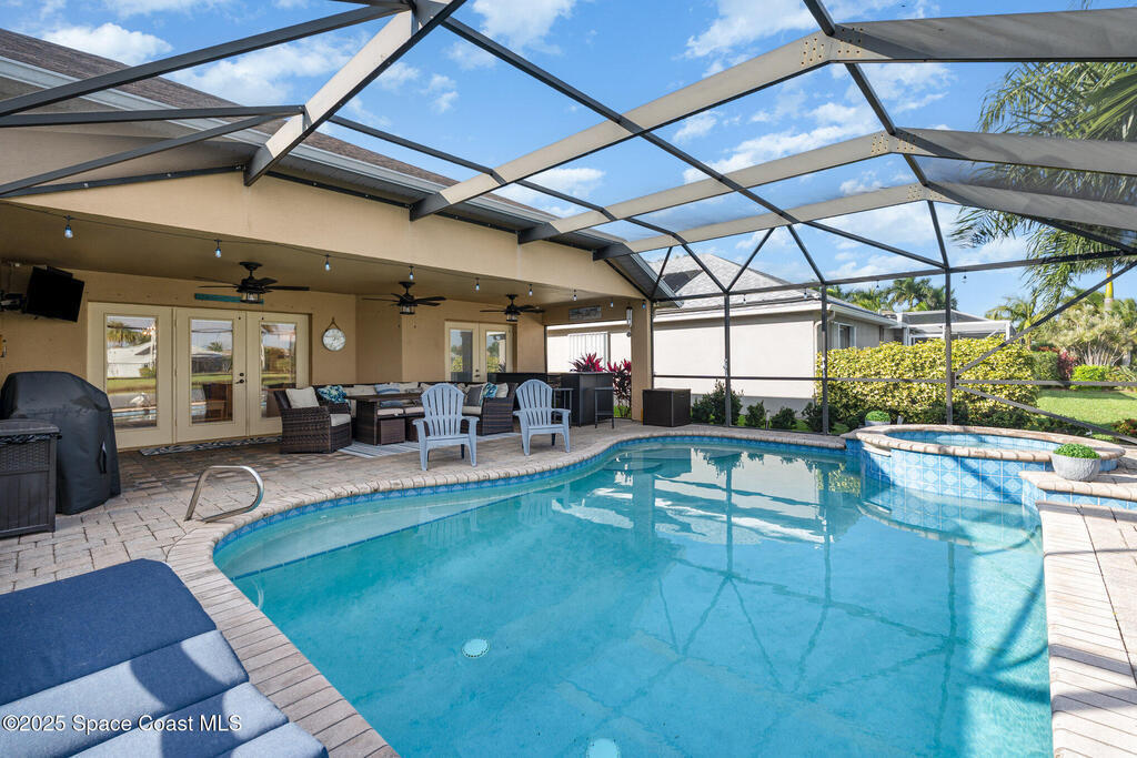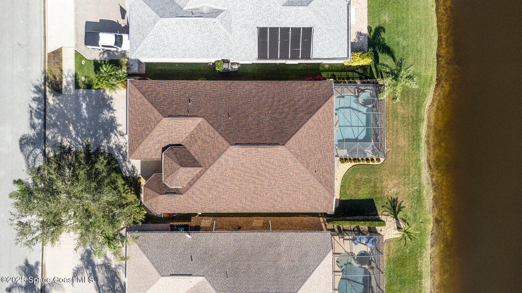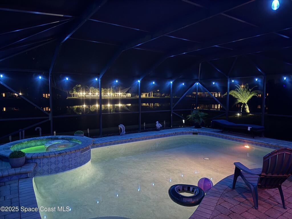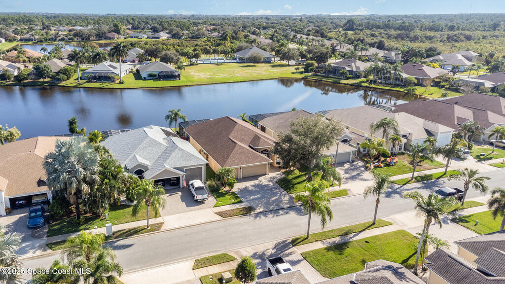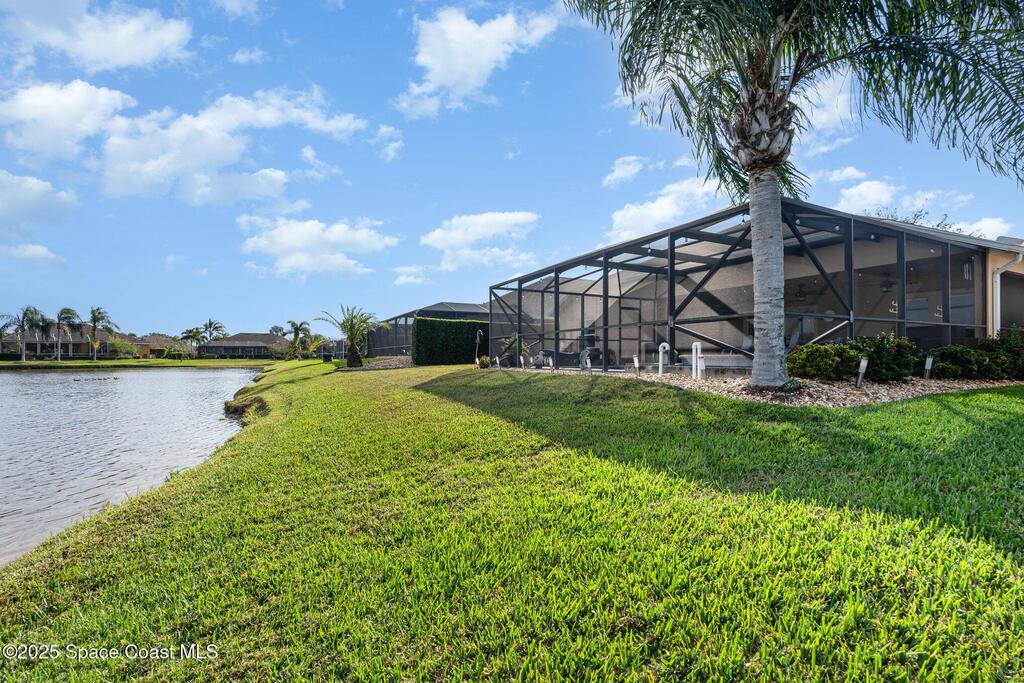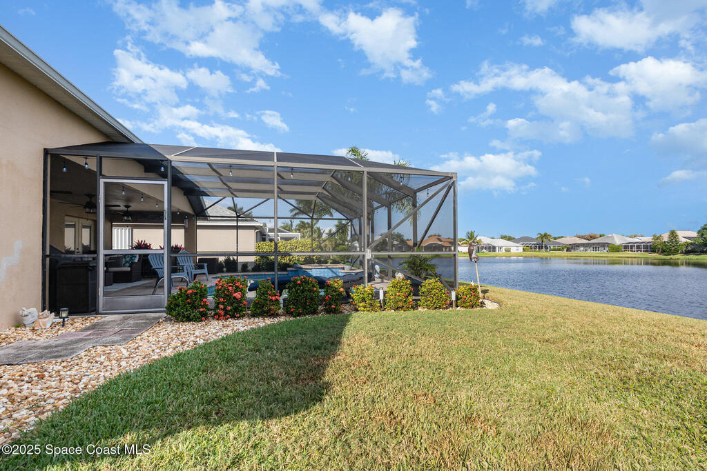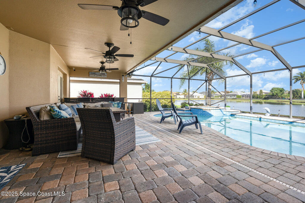 Stunning lakeview pool home offering 4 bedrooms, 3 full baths, and an office/flex room. High ceilings throughout. Laminate flooring in all bedrooms and tile in main living room . The split layout includes two bedrooms with a Jack-and-Jill bath and a separate bedroom with a pool bath. An open floor plan connects the living area to the paver patio through French doors, leading to an upgraded, larger pool with a natural-gas heated spa. The kitchen features stainless steel appliances, including a gas range, plus a walk-in pantry. The primary suite includes two walk-in closets, a double-sink vanity, walk-in shower, and jetted tub. Additional highlights include a separate laundry room, 3-car garage with overhead storage, and Vivint security system. Community amenities include a pool and clubhouse, with nearby Viera East Park offering a playground, pavilion, basketball, volleyball, and tennis courts.