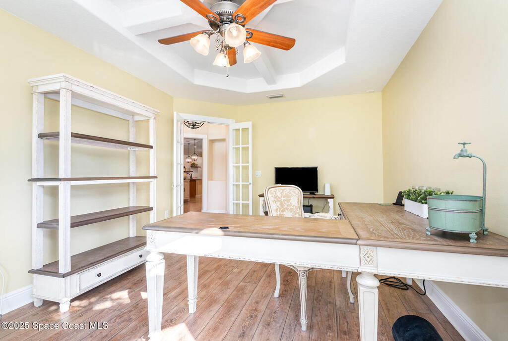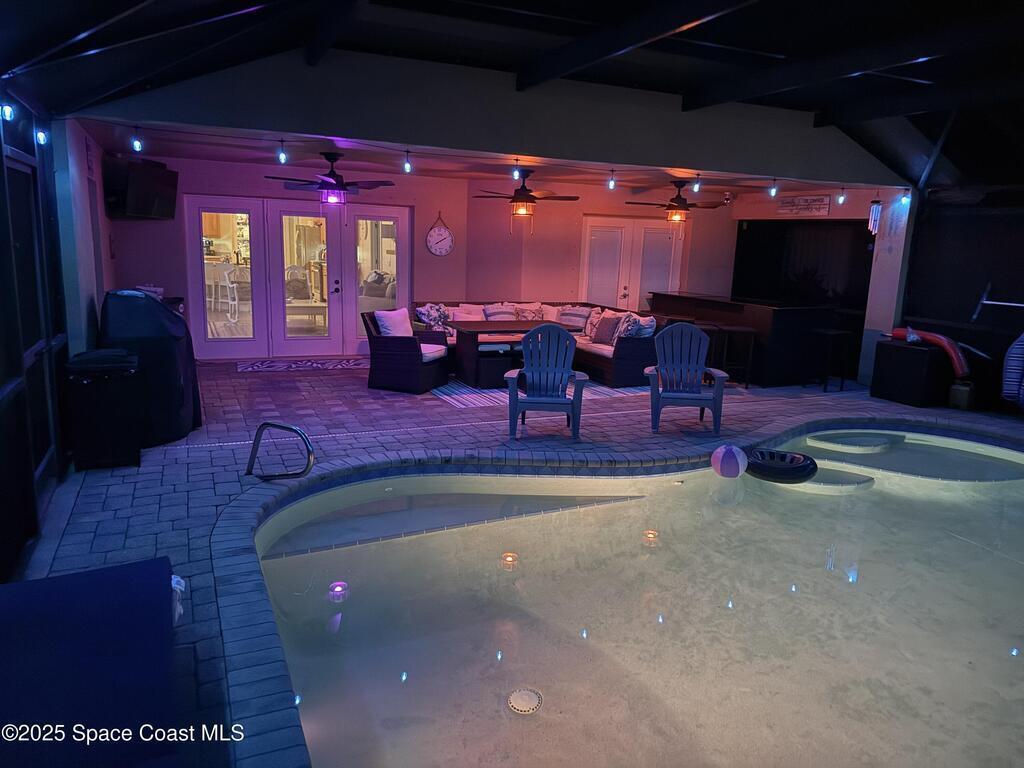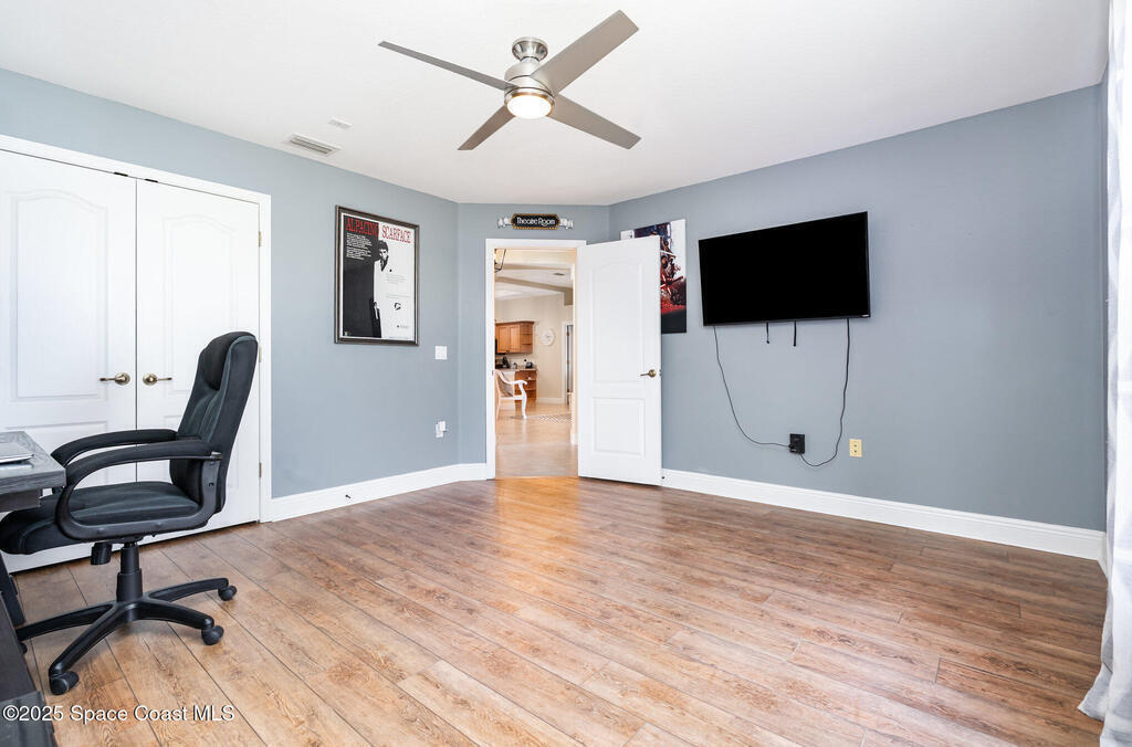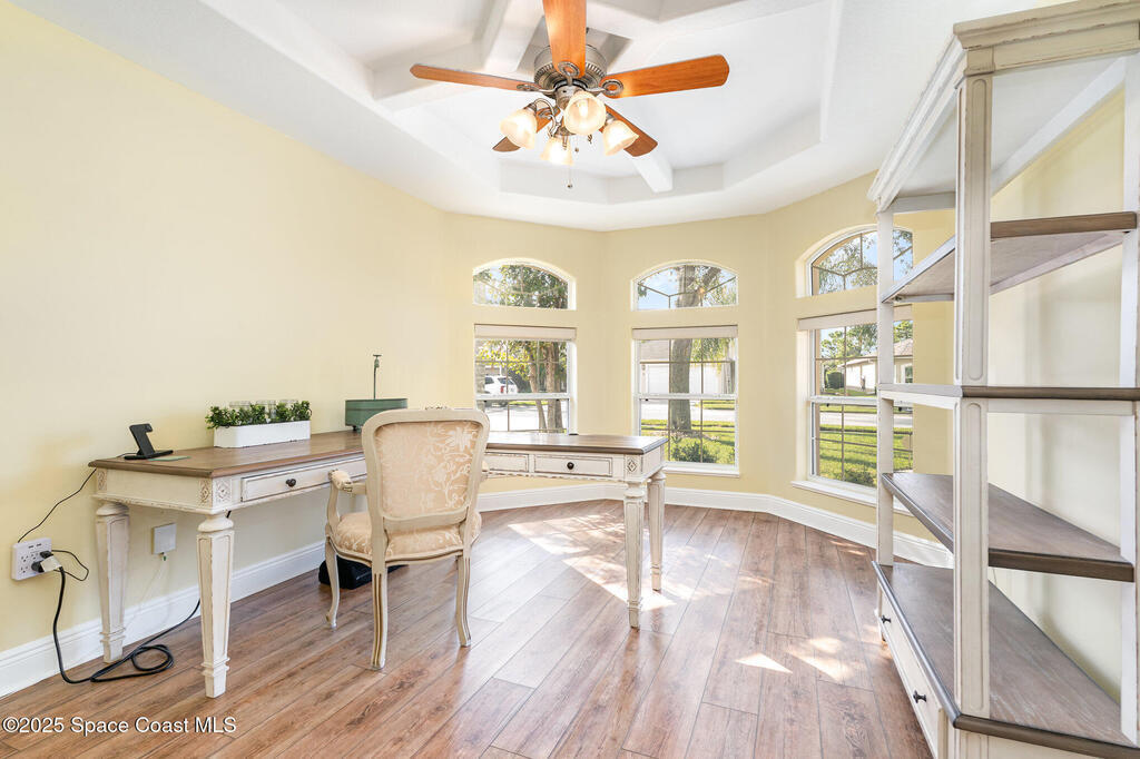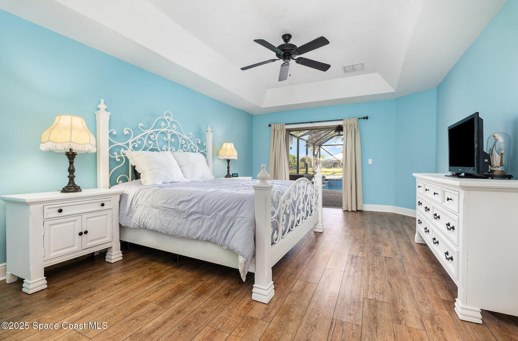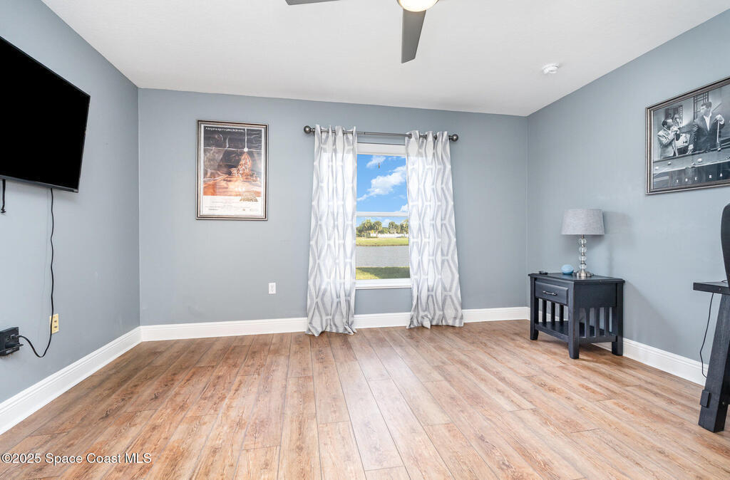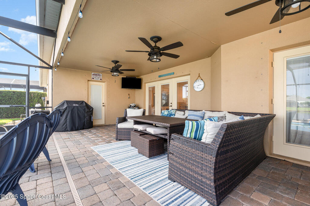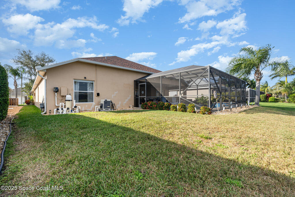 Stunning lakeview pool home offering 4 bedrooms, 3 full baths, and an office/flex room. High ceilings throughout. Laminate flooring in all bedrooms and tile in main living room . The split layout includes two bedrooms with a Jack-and-Jill bath and a separate bedroom with a pool bath. An open floor plan connects the living area to the paver patio through French doors, leading to an upgraded, larger pool with a natural-gas heated spa. The kitchen features stainless steel appliances, including a gas range, plus a walk-in pantry. The primary suite includes two walk-in closets, a double-sink vanity, walk-in shower, and jetted tub. Additional highlights include a separate laundry room, 3-car garage with overhead storage, and Vivint security system. Community amenities include a pool and clubhouse, with nearby Viera East Park offering a playground, pavilion, basketball, volleyball, and tennis courts.