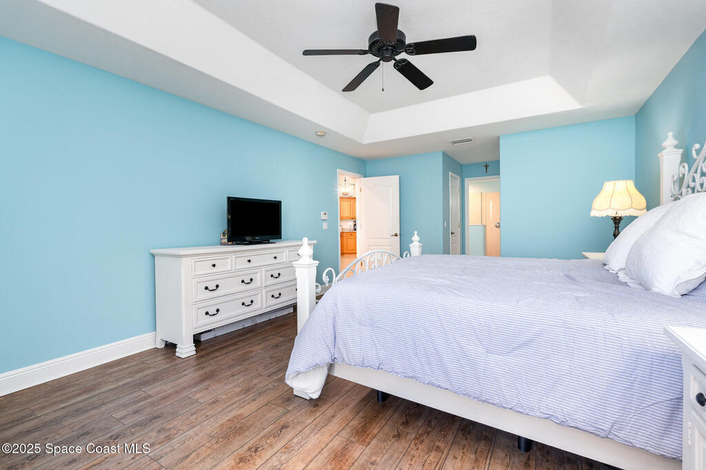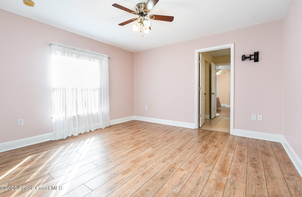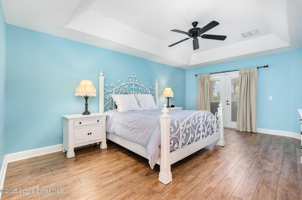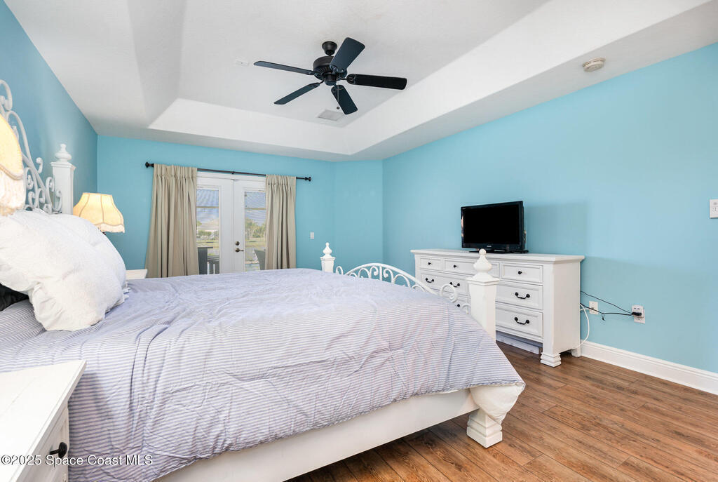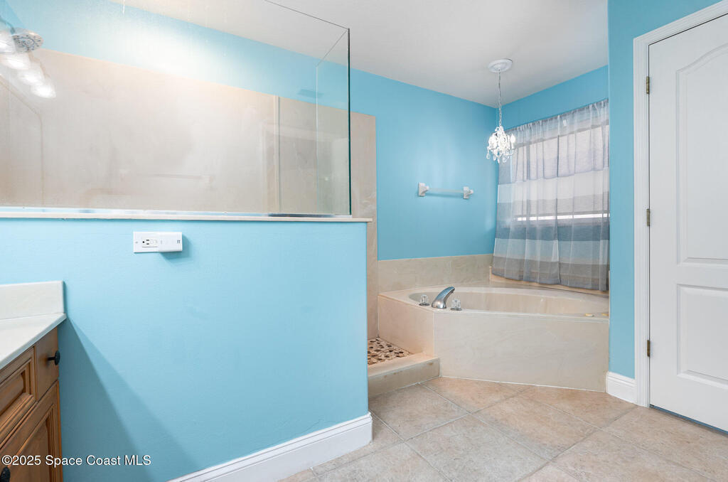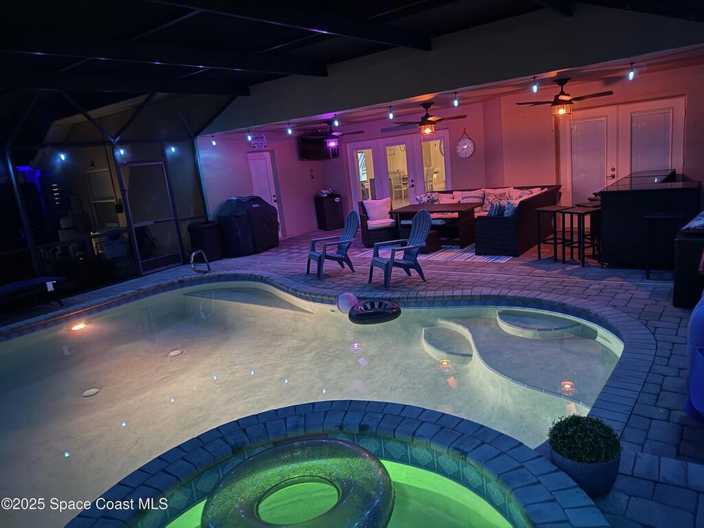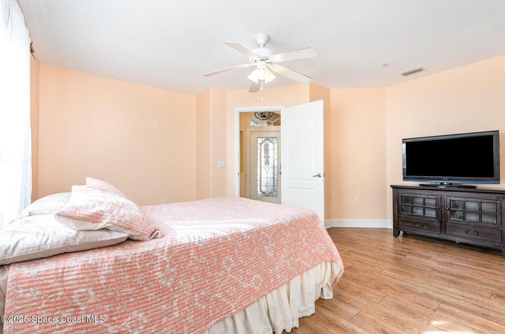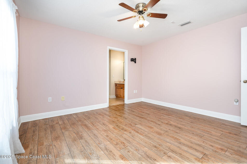 Stunning lakeview pool home offering 4 bedrooms, 3 full baths, and an office/flex room. High ceilings throughout. Laminate flooring in all bedrooms and tile in main living room . The split layout includes two bedrooms with a Jack-and-Jill bath and a separate bedroom with a pool bath. An open floor plan connects the living area to the paver patio through French doors, leading to an upgraded, larger pool with a natural-gas heated spa. The kitchen features stainless steel appliances, including a gas range, plus a walk-in pantry. The primary suite includes two walk-in closets, a double-sink vanity, walk-in shower, and jetted tub. Additional highlights include a separate laundry room, 3-car garage with overhead storage, and Vivint security system. Community amenities include a pool and clubhouse, with nearby Viera East Park offering a playground, pavilion, basketball, volleyball, and tennis courts.
