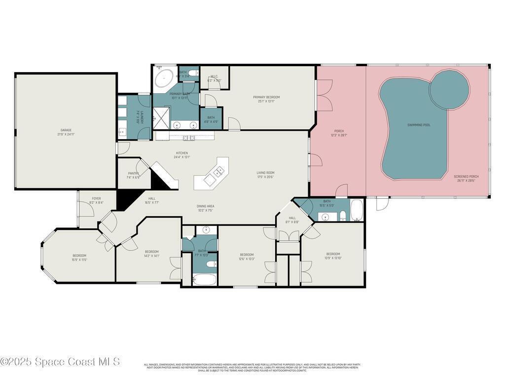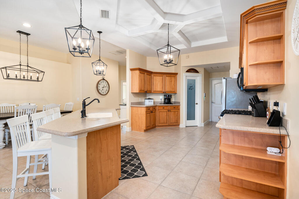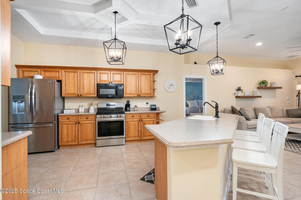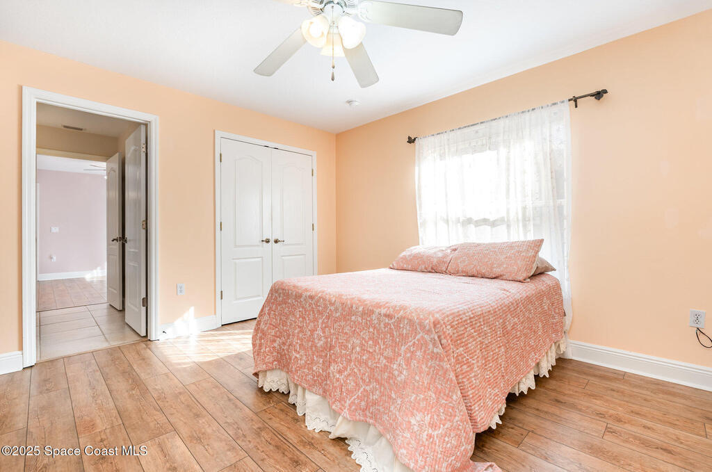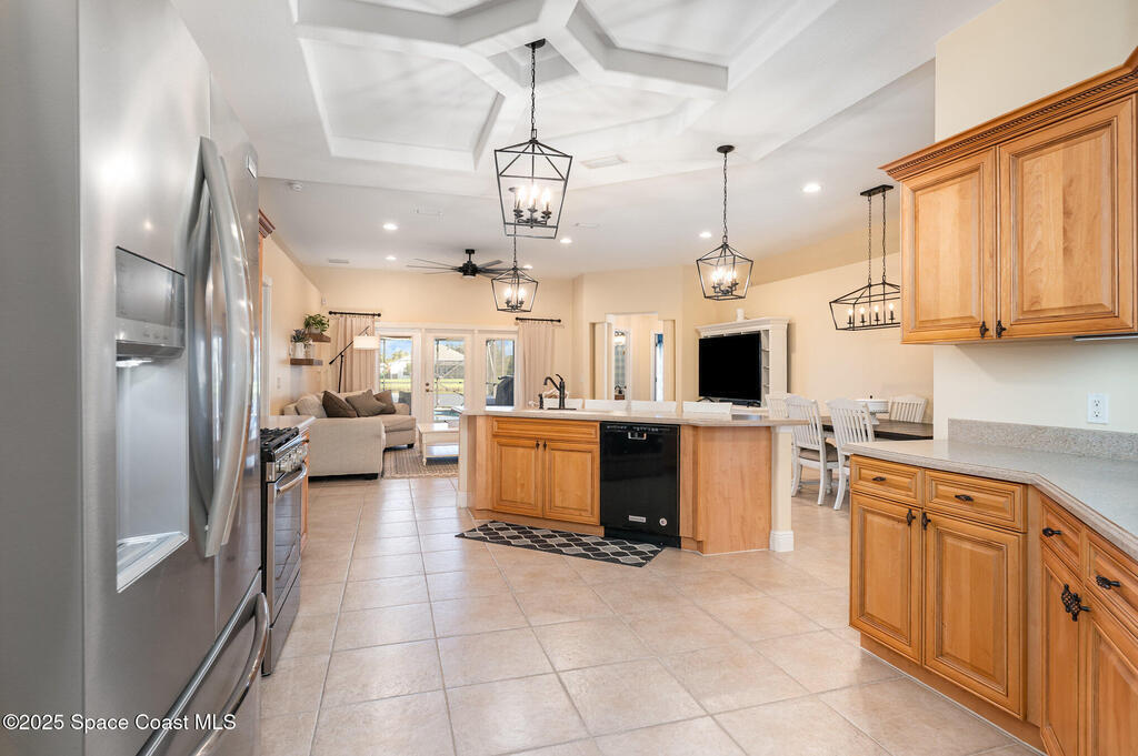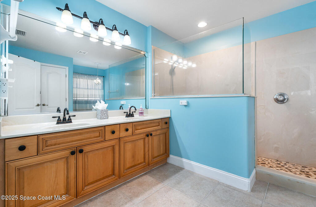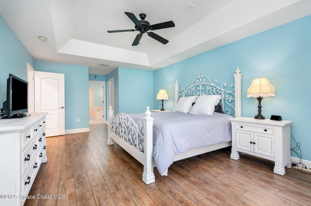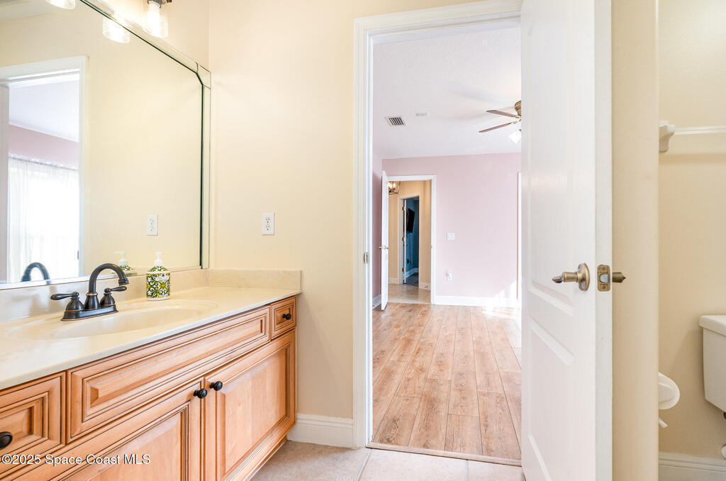 Stunning lakeview pool home offering 4 bedrooms, 3 full baths, and an office/flex room. High ceilings throughout. Laminate flooring in all bedrooms and tile in main living room . The split layout includes two bedrooms with a Jack-and-Jill bath and a separate bedroom with a pool bath. An open floor plan connects the living area to the paver patio through French doors, leading to an upgraded, larger pool with a natural-gas heated spa. The kitchen features stainless steel appliances, including a gas range, plus a walk-in pantry. The primary suite includes two walk-in closets, a double-sink vanity, walk-in shower, and jetted tub. Additional highlights include a separate laundry room, 3-car garage with overhead storage, and Vivint security system. Community amenities include a pool and clubhouse, with nearby Viera East Park offering a playground, pavilion, basketball, volleyball, and tennis courts.