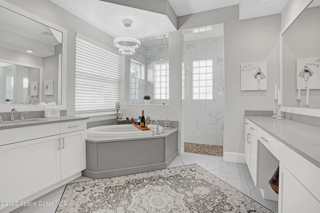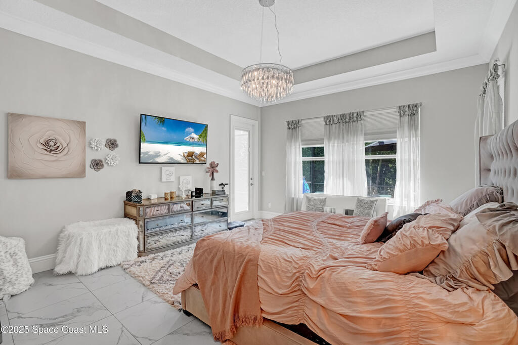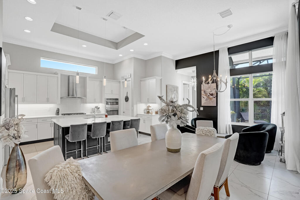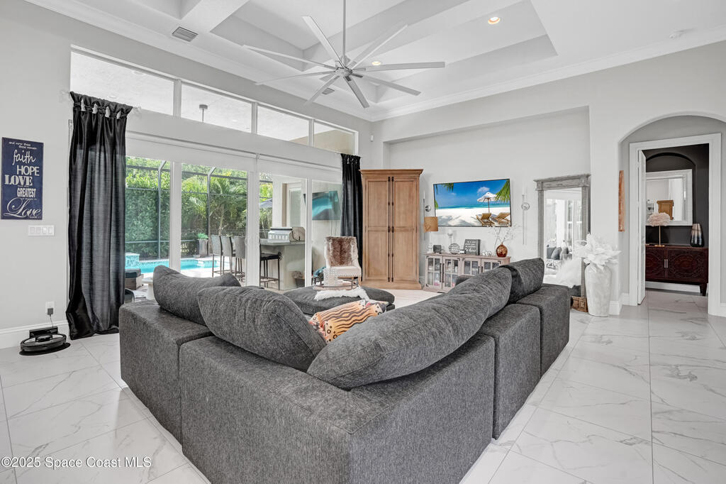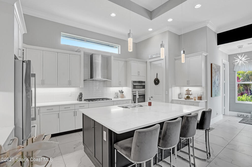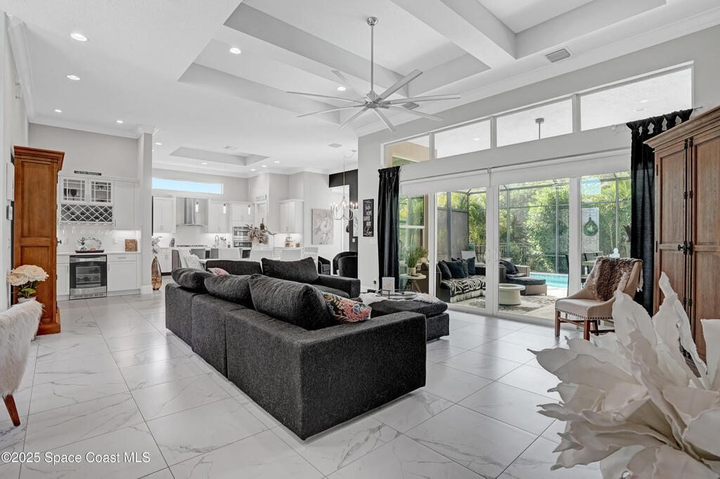 Stunning Tradewinds model. Open floor plan with soaring ceilings, spacious layout features split bedrooms, a large walk-in pantry, and a cabana bath with direct access to the pool area. Primary suite includes patio door leading to the beautifully designed outdoor space. Enjoy the saltwater pool with waterfall feature, pool heater, screened enclosure, and travertine pavers extending across the patio and pool deck. Highlights include a bar with a beverage refrigerator, porcelain tile flooring, quartz countertops, and a 36-inch gas cooktop, whole-home generator, fenced yard, and so much more!