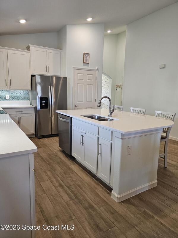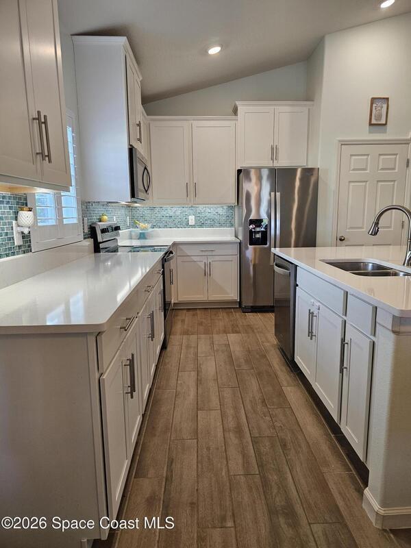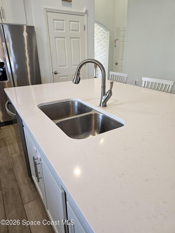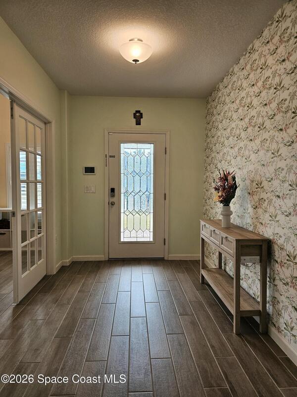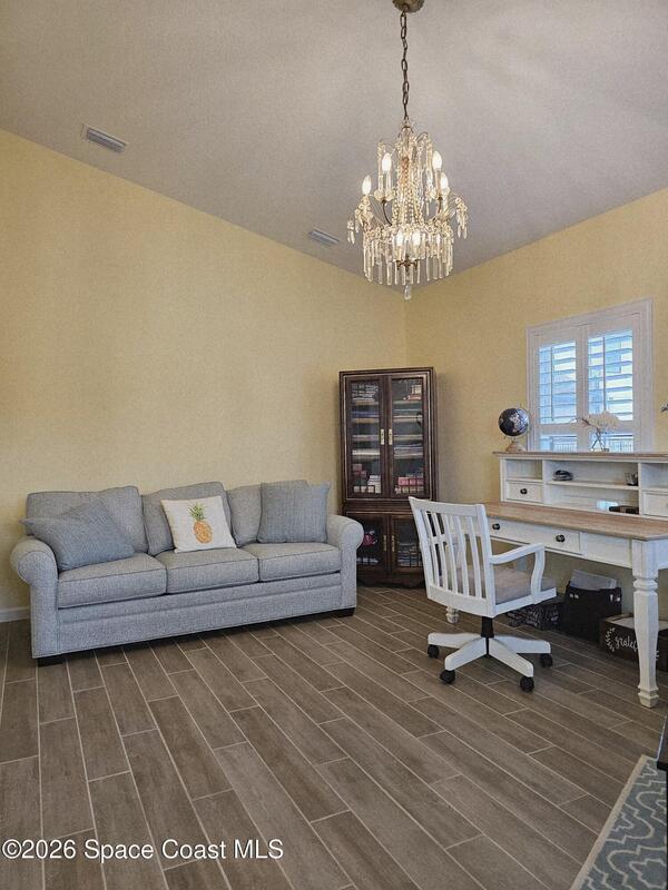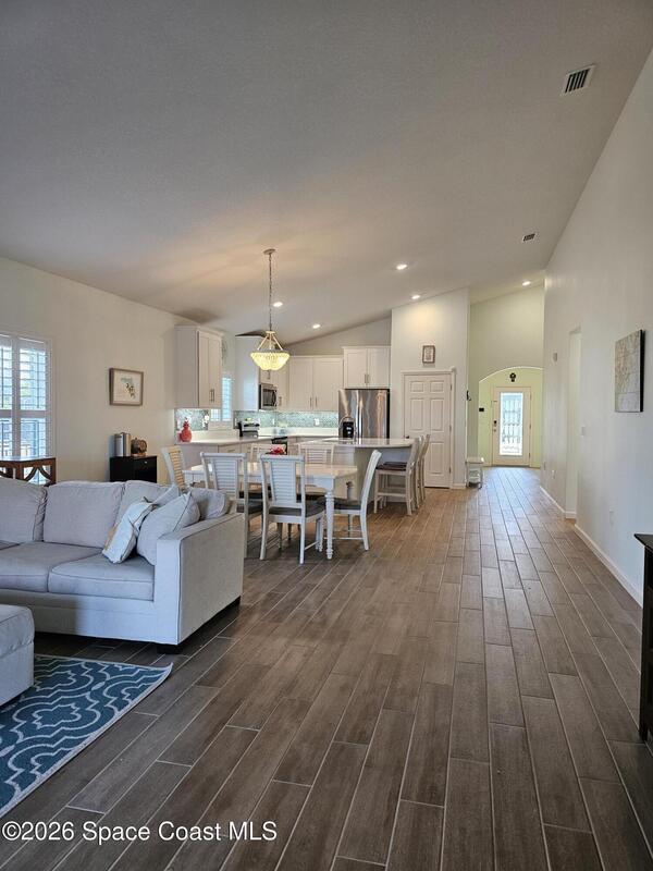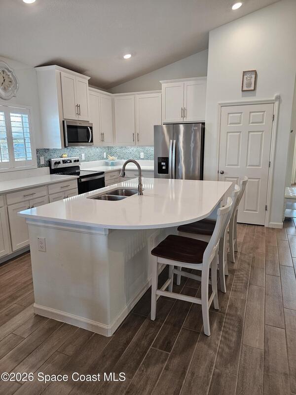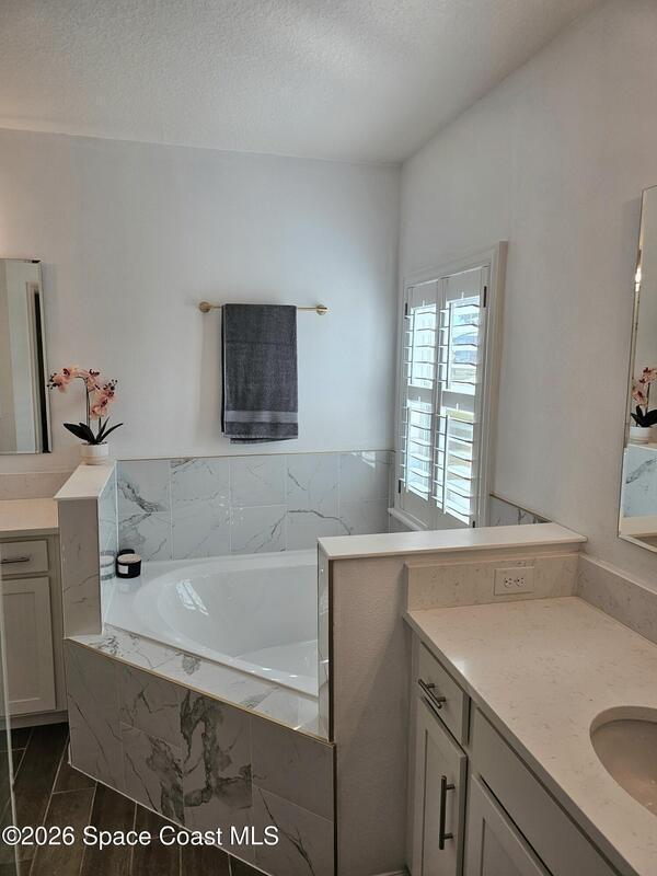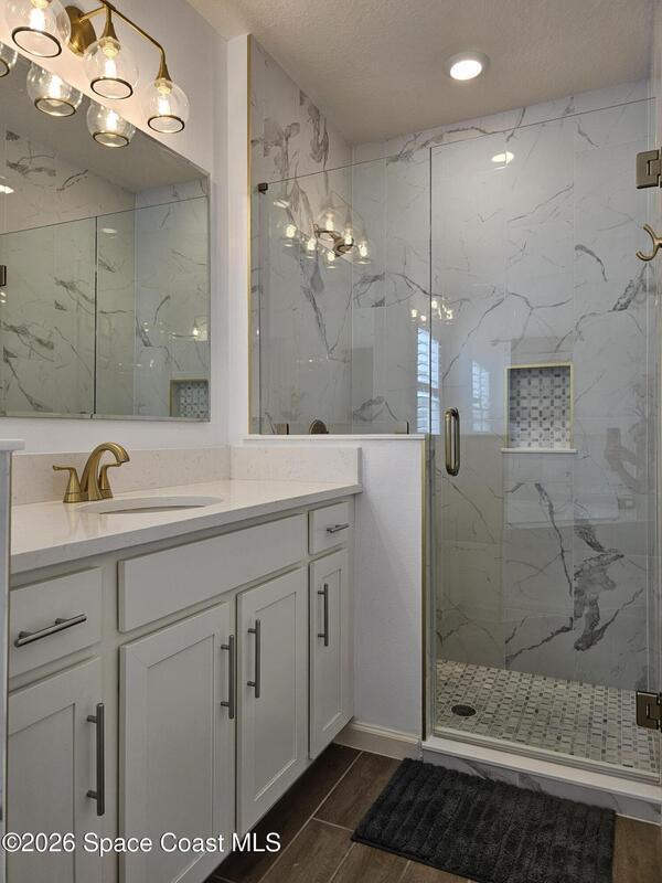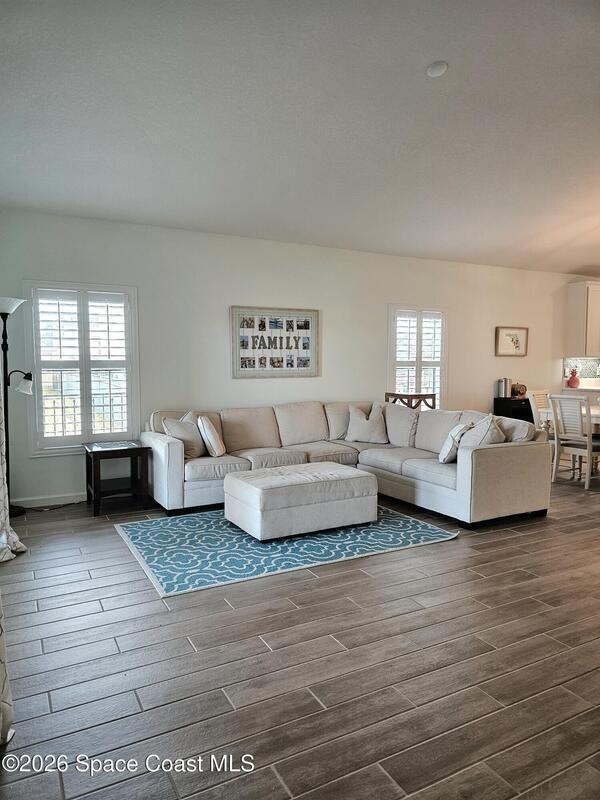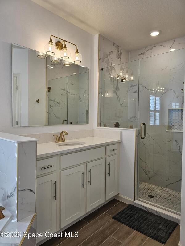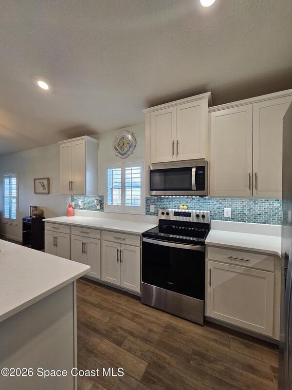 Solar panels/low electric bill. Immaculately maintained & modern flair. Versatile floor plan w/ 3 bedrooms + a flex room w/ French doors, ideal as home office or 4th bedroom. Freshly painted interior, complemented by plantation shutters. Kitchen features white shaker cabinets, quartz countertops, a center island, glass tile backsplash, & a pantry w/ wood shelving & motion lighting. Primary suite w/ double closets & French doors leading to the lanai. Remodeled en-suite bath boasts gold fixtures & accessories, upgraded floor-to-ceiling tile in the shower w/ a recessed shelf, marble floor tiles, a frameless glass shower door, & matching tile surrounding the soaking tub. Centralized smart hub, Wi-Fi switches, keyless entry, & Ring doorbell, offering efficiency & peace of mind. Enjoy water views from the lanai, a fully fenced backyard, & added privacy alongside w/ adjacent community lot. Paver driveway & front pad, front-load washer & dryer w/ pedestals. 2025 HWH, 2020 Roof, 2020 A/C.