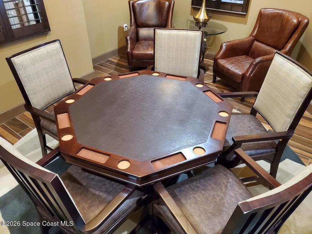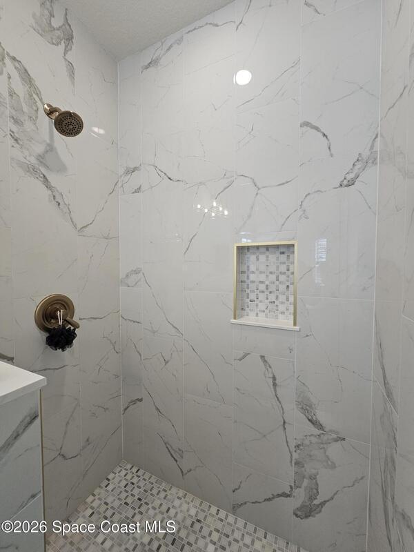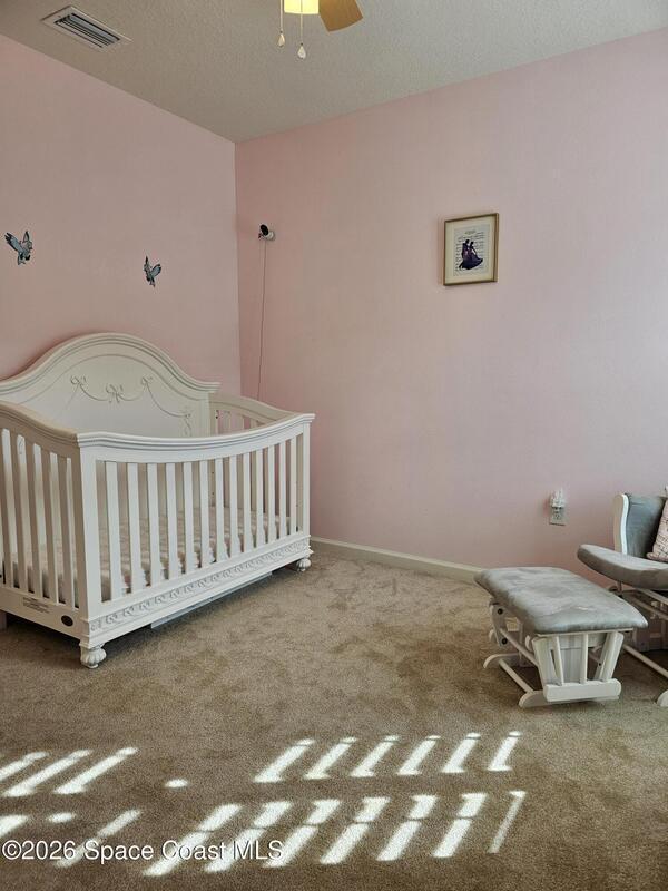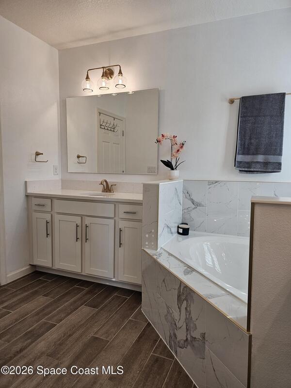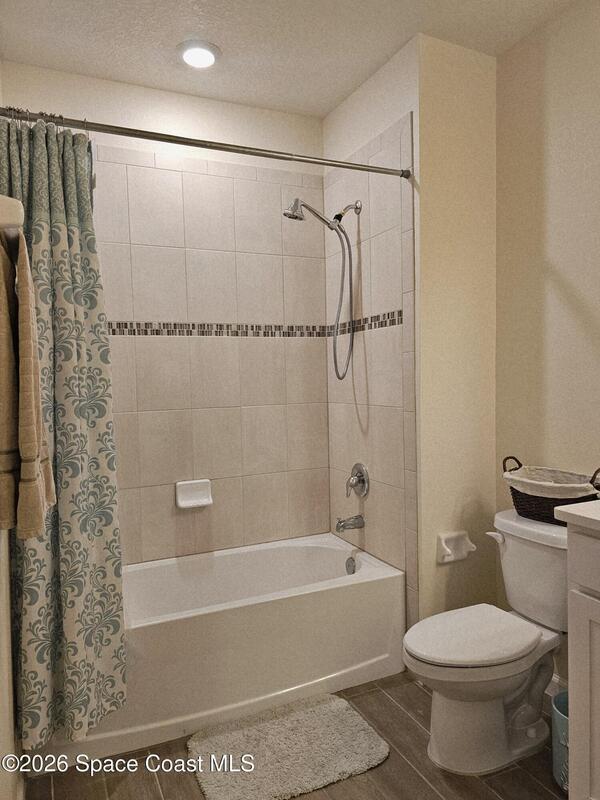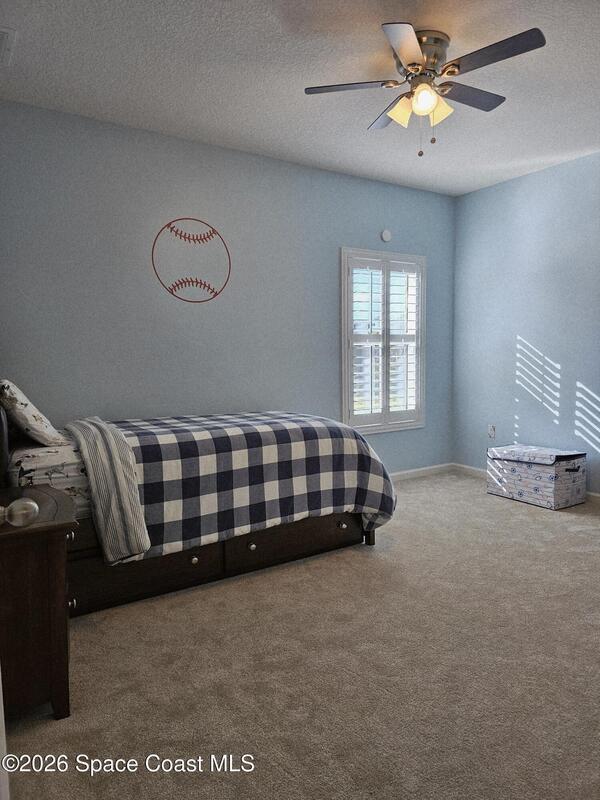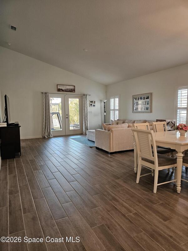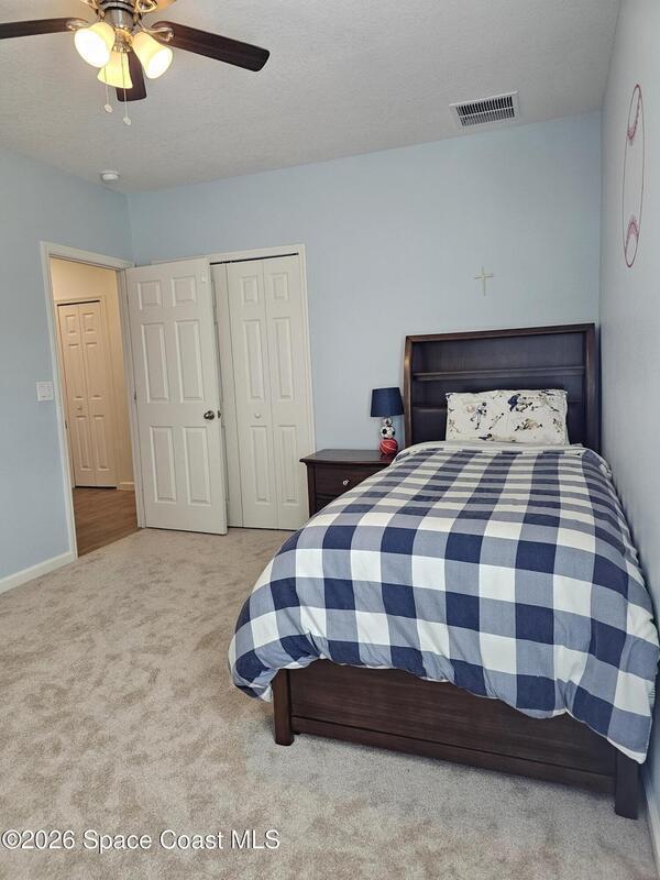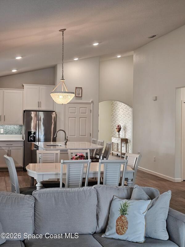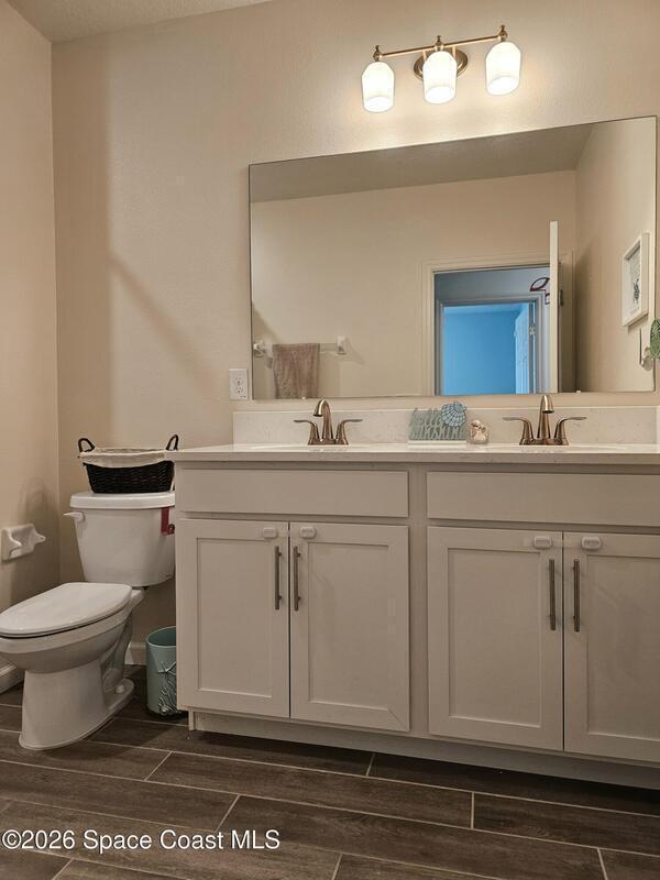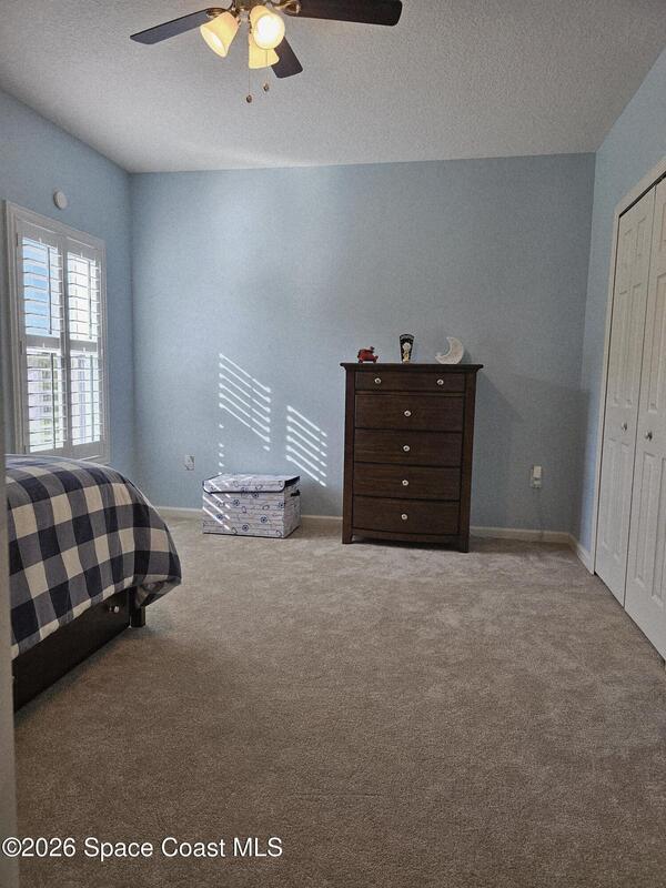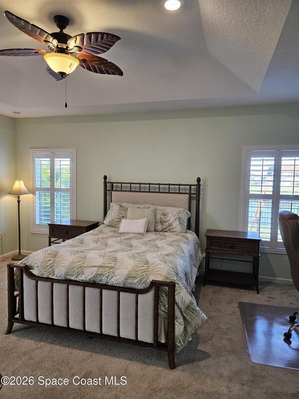 Solar panels/low electric bill. Immaculately maintained & modern flair. Versatile floor plan w/ 3 bedrooms + a flex room w/ French doors, ideal as home office or 4th bedroom. Freshly painted interior, complemented by plantation shutters. Kitchen features white shaker cabinets, quartz countertops, a center island, glass tile backsplash, & a pantry w/ wood shelving & motion lighting. Primary suite w/ double closets & French doors leading to the lanai. Remodeled en-suite bath boasts gold fixtures & accessories, upgraded floor-to-ceiling tile in the shower w/ a recessed shelf, marble floor tiles, a frameless glass shower door, & matching tile surrounding the soaking tub. Centralized smart hub, Wi-Fi switches, keyless entry, & Ring doorbell, offering efficiency & peace of mind. Enjoy water views from the lanai, a fully fenced backyard, & added privacy alongside w/ adjacent community lot. Paver driveway & front pad, front-load washer & dryer w/ pedestals. 2025 HWH, 2020 Roof, 2020 A/C.