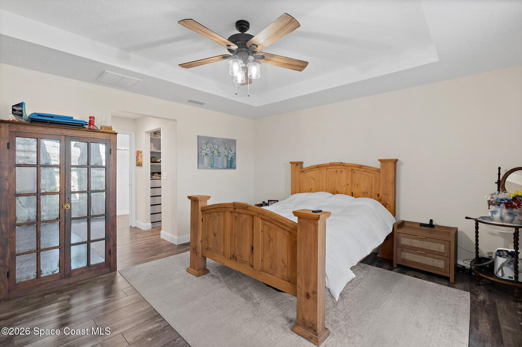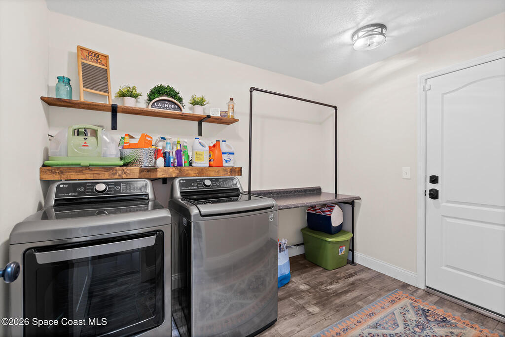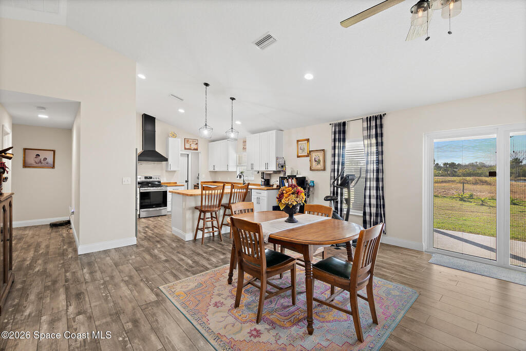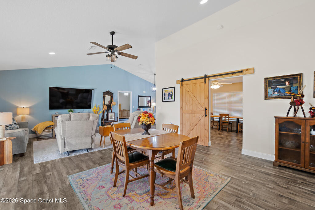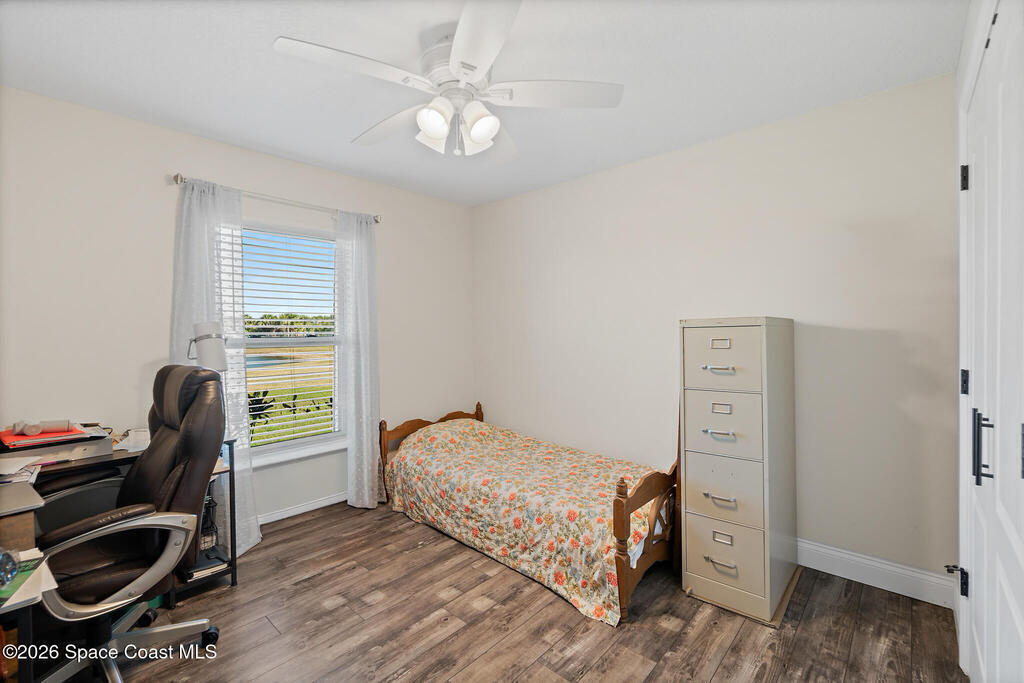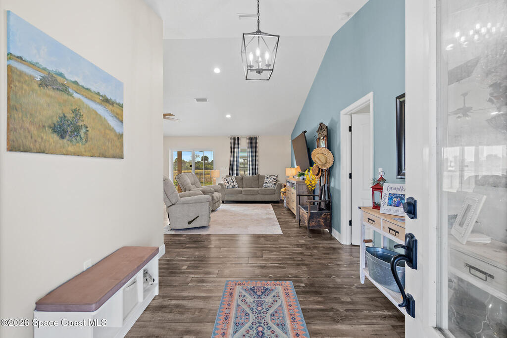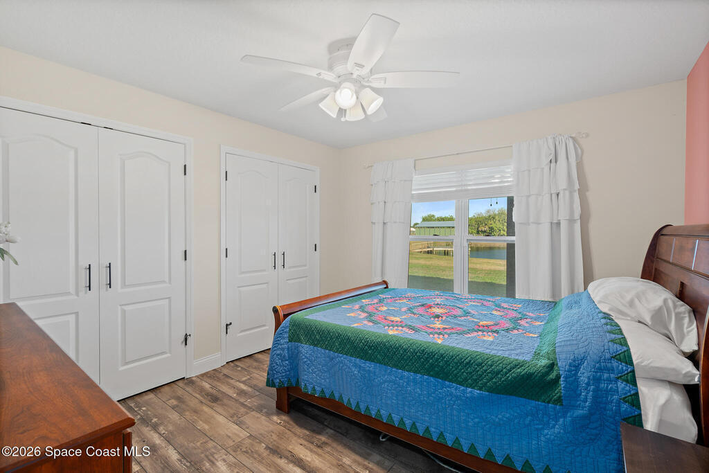 This 2020-built, 4-bed, 2-bath home sits on 3.18 tranquil acres! Enter through the automatic gate into your fully-fenced paradise featuring luxury vinyl plank flooring and an open floor plan. The chef's kitchen showcases an island with built-in microwave drawer, pantry, coffee bar, and dual reverse osmosis systems for purified water. The flex room includes built-in shelving and Murphy bed--perfect for guests or a home office. The primary offers his and hers walk-in closets, dual vanities, and an oversized shower. A metal roof and energy-efficient impact-resistant doors and windows ensure lasting comfort and peace of mind. Outside, enjoy painted porches overlooking your stocked fishing pond with dock. Separate irrigation for year-round gardening, and a utility shed with internal water system enable true homestead living. A 2-car epoxy-floored garage and a carport provides plenty of covered parking for your RV or boat. Don't miss out on your dream retreat!
