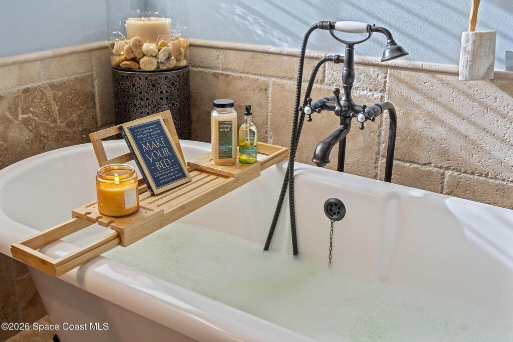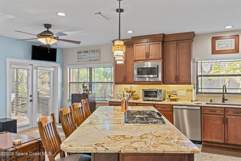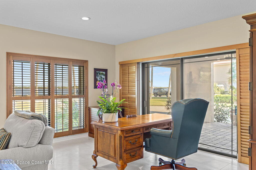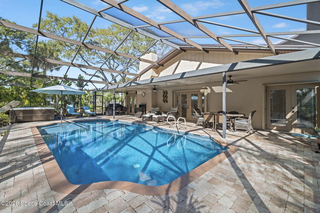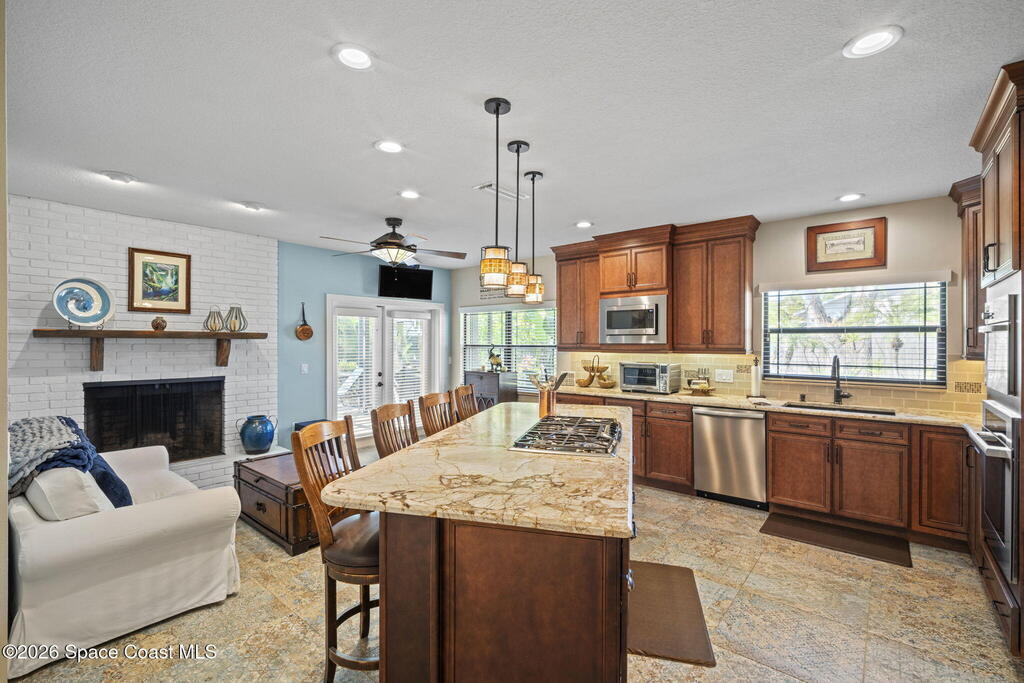 Located on Rockledge Drive, this exceptional riverfront home offers 149 feet of direct Indian River frontage. The oversized .74-acre lot provides rare privacy. The CBS home features two wood-burning fireplaces and dual primary suites, including an upper-level primary retreat with river views, private balcony, kitchenette, custom closets, and engineered hardwood flooring throughout the upper level. A main-level primary suite offers flexibility for guests or multigenerational living.The gourmet kitchen showcases custom Hickory cabinetry, Quartzite countertops, designer tile from Spain, and premium appliances. Recent upgrades include a new AC and tankless water heater (2025), updated windows and doors, renovated baths, Italian porcelain tile, and a custom Oak staircase.Outdoor living features a screened saltwater pool and hot tub, irrigation, and extra garage spaces.