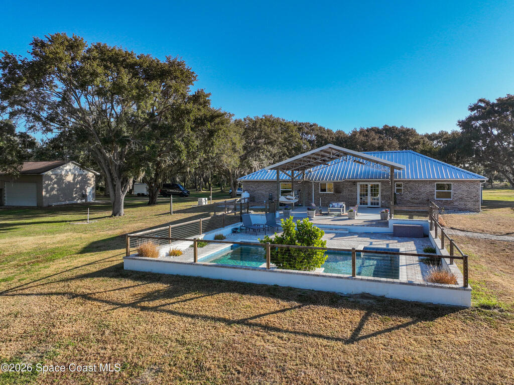 Private retreat set on 5 SCENIC ACRES adorned with majestic oak trees, this beautifully UPDATED 3-bedroom, 2-bath home with a split floor plan offers refined comfort and relaxed rural living. The kitchen features custom cabinetry, a large island, granite countertops, and new appliances, ideal for entertaining or everyday enjoyment. The residence is thoughtfully upgraded with a METAL ROOF, IMPACT WINDOWS, and a WHOLE HOME GENERATOR with Propane Tank for peace of mind. Outdoor living is exceptional with a POOL surrounded by pavers, expansive 24x24 COVERED PATIO, and an inviting FIRE PIT perfect for evening gatherings. The grounds are designed for beauty and function, including a fully fenced GARDEN with irrigation, raised beds, mature fruit trees, pond, and a CHICKEN COOP. Additional features include a DETACHED GARAGE/WORKSHOP with roll-down doors, ample space for hobbies or storage, and unmatched privacy. This rare property delivers the luxury country lifestyle you've been waiting for