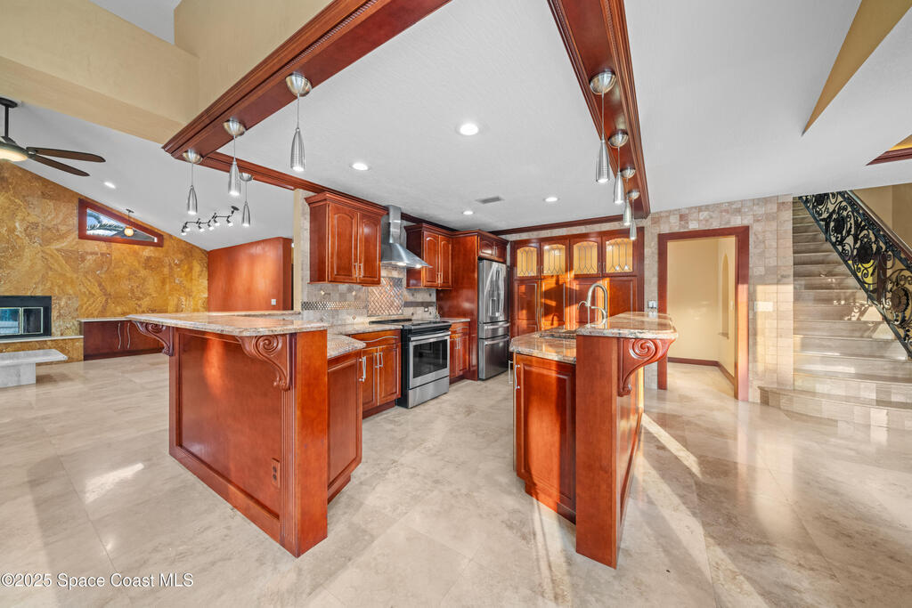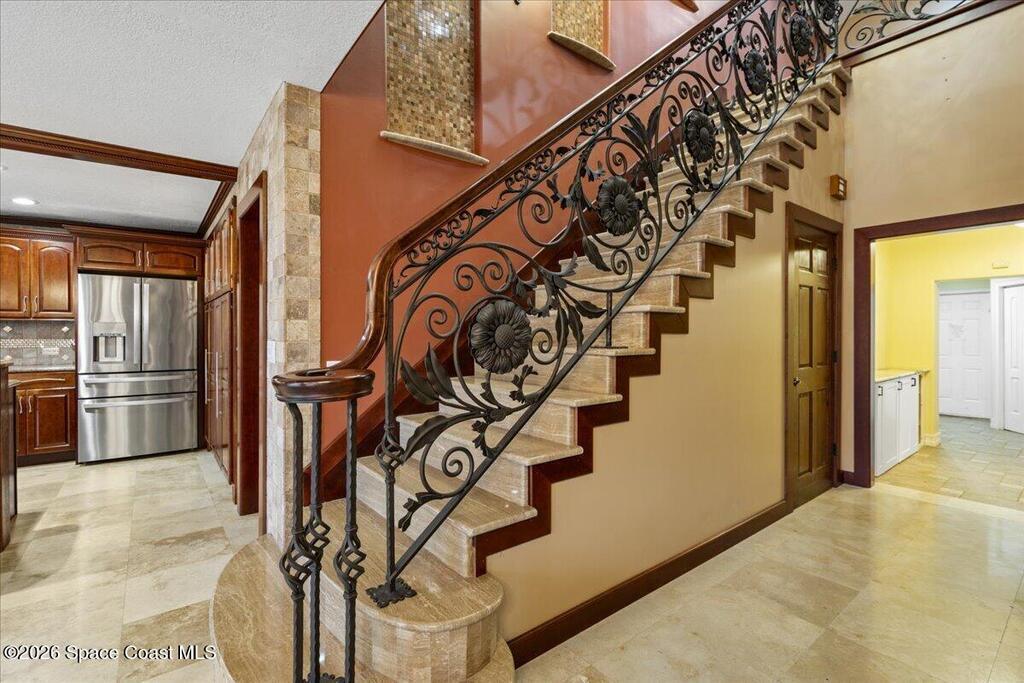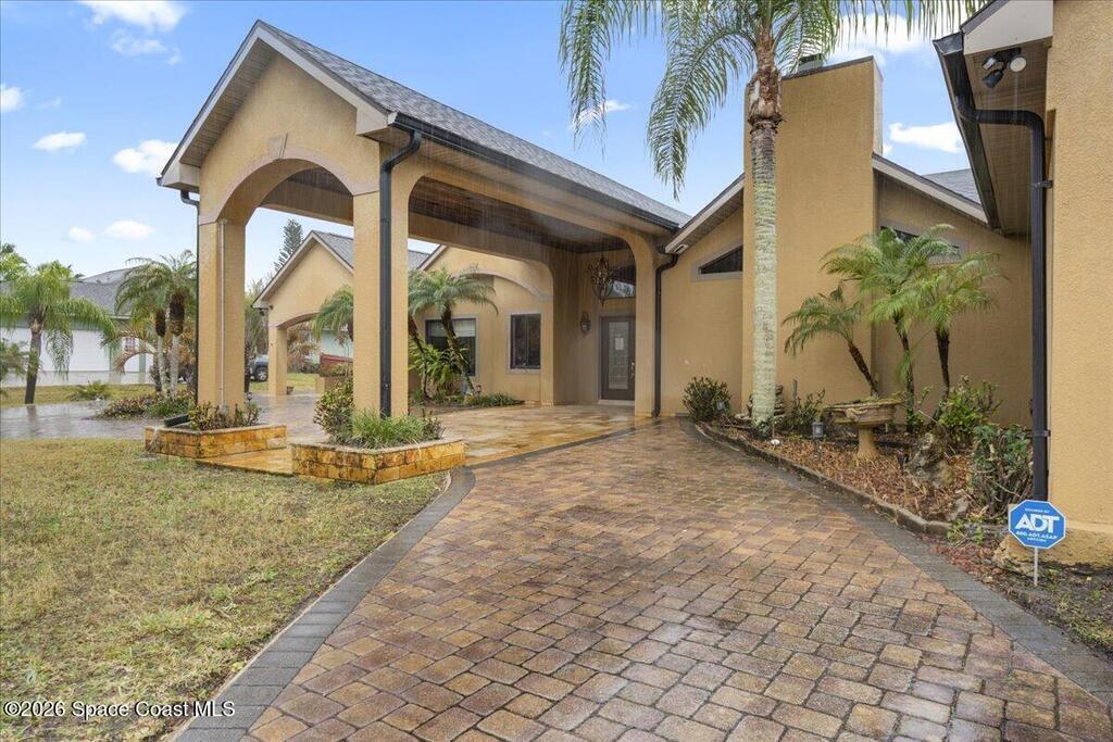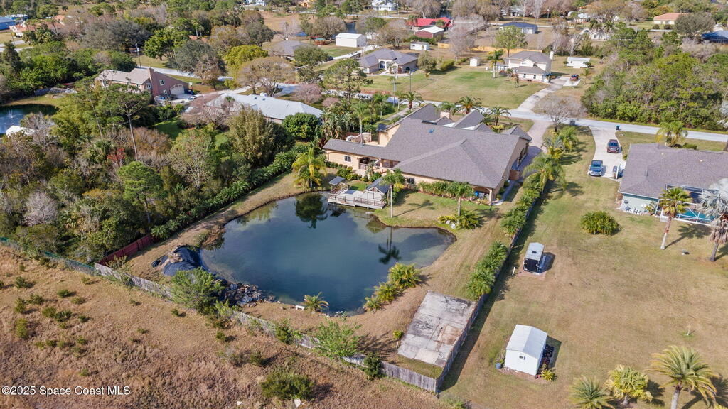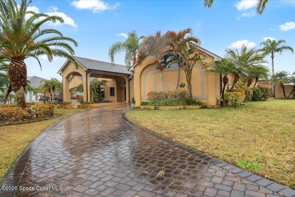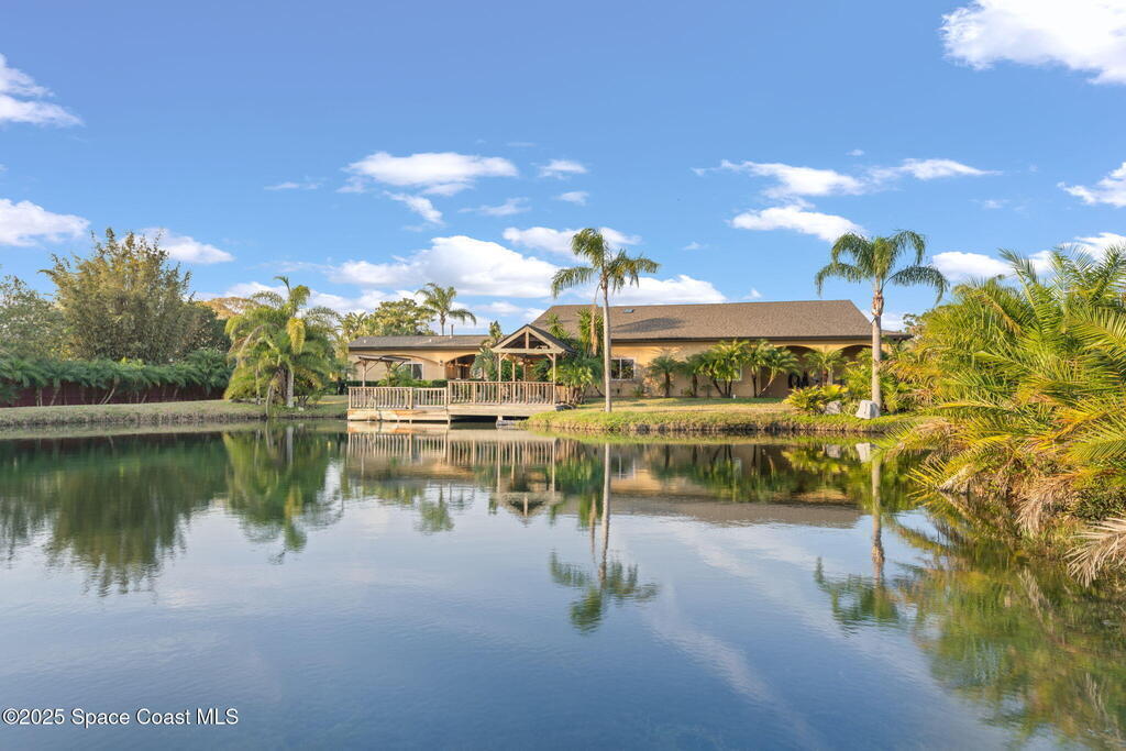 A rare opportunity to own a stunning Mediterranean-inspired estate offering over 6,000 square feet of refined living with 6 bedrooms and 6.5 baths. Architectural features include a grand marble staircase, soaring ceilings, an indoor waterfall, rich stone accents, and multiple entertainment areas. Designed for everyday comfort and entertaining, this home features expansive open living areas, private wings, and a home theater- with all equipment included. A separate 1/1 in-law suite, complete with a kitchenette and an oversized shower featuring multiple shower heads is ideal for guests, extended family, or a private living space. The backyard is a retreat with a large pool, outdoor kitchen, pool bath, and a serene pond with a dock and built-in seating, perfect for enjoying peaceful sunsets. Situated in a quiet no-HOA neighborhood, just minutes from I-95, the new Publix, and a growing selection of shopping and dining, this property delivers luxury, privacy, and convenience all in one!