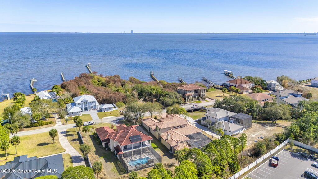 Custom-designed luxury pool home featuring a saltwater pool and spa with waterfall, fire bowls, and color-changing LED lighting. Equipped with PGT impact-rated windows, soaring tray and coffered ceilings, summer kitchen, and energy-efficient spray foam insulation. Expansive 90-degree pocket sliders create a seamless indoor-outdoor living space, ideal for entertaining. Spacious family room with fireplace. The chef's kitchen offers a large center island, granite counters, solid wood cabinetry, premium appliances, and a butler's pantry. Travertine and Brazilian cherry floors run throughout. Four private bedroom suites, each with its own bath. First-floor primary suite includes an elegant bath with dual vanities. Upstairs features a theater/entertainment room with kitchenette. Enjoy private access to a 200' dock across the street. Exceptional curb appeal and meticulous craftsmanship throughout. Located in the gated Hidden Creek community on the Space Coast, just steps from the Indian River
