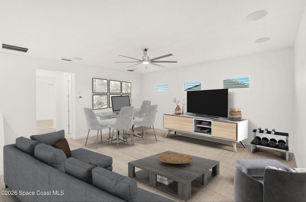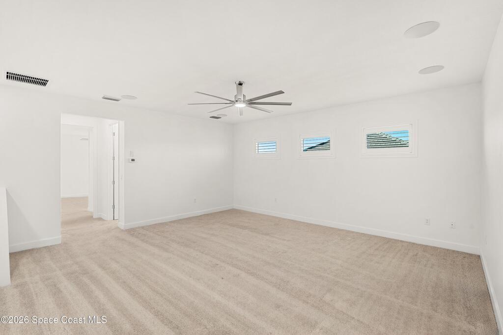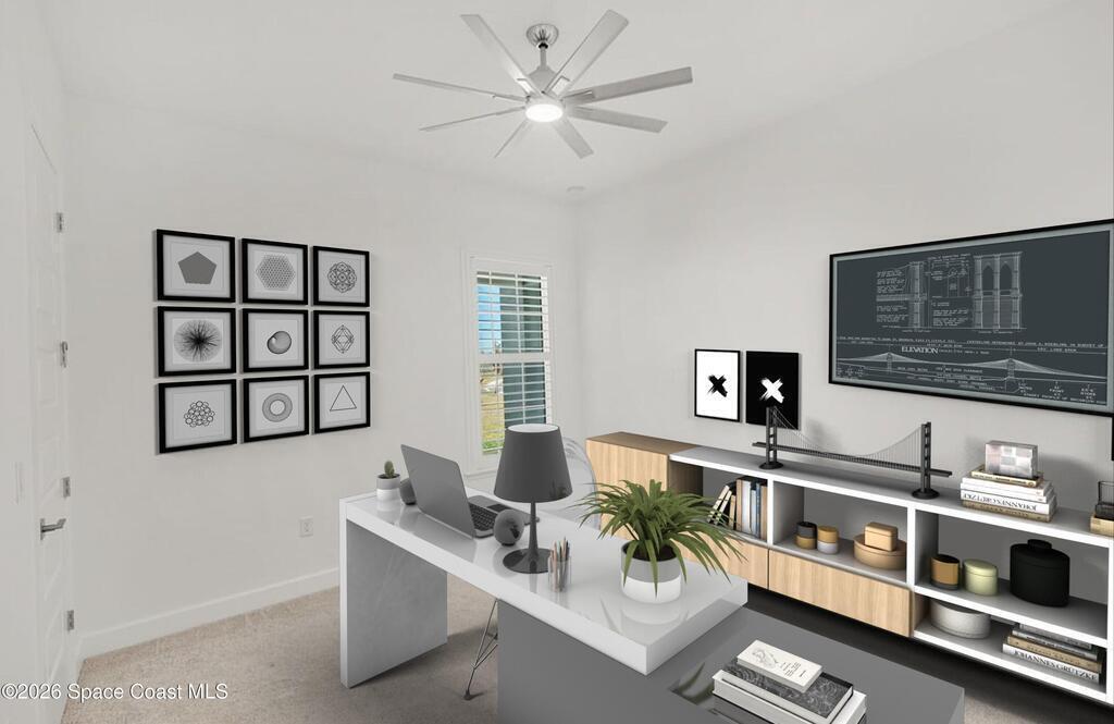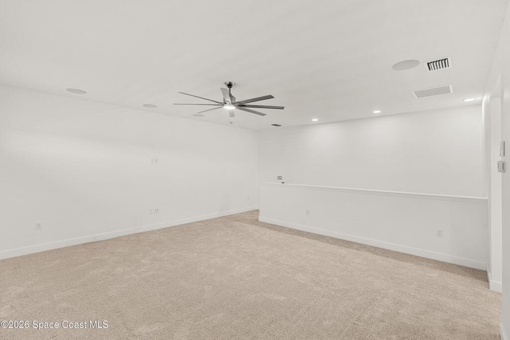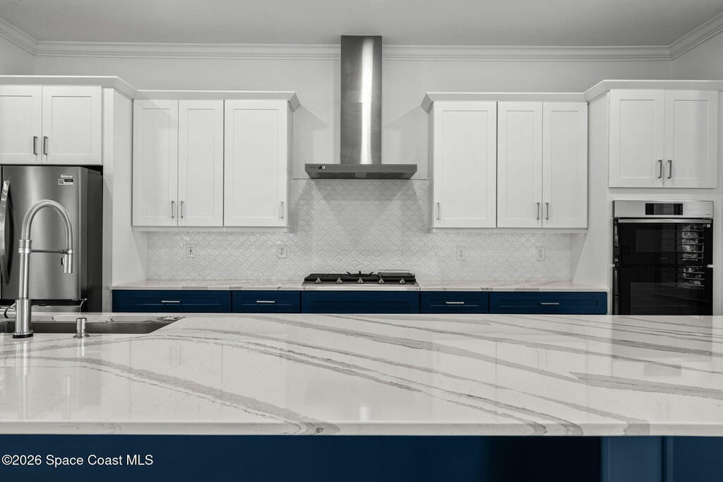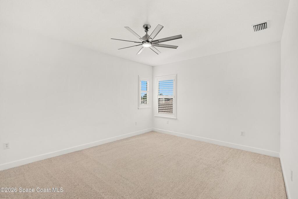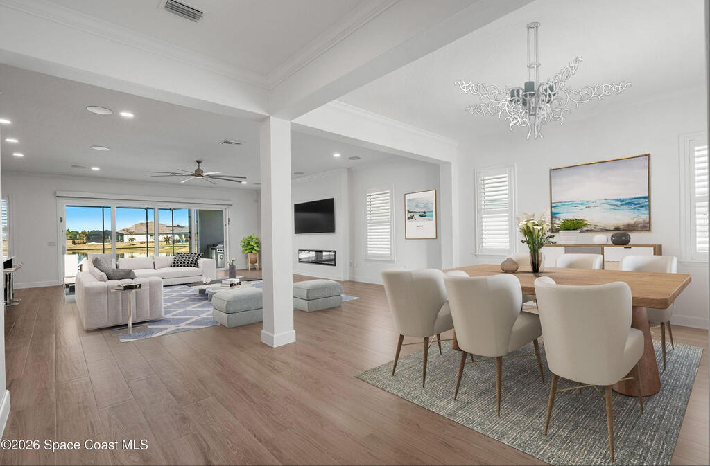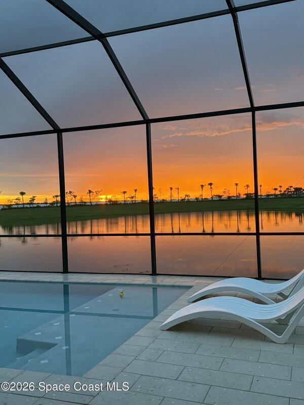 Beautiful,luxury home in Laurasia Viera's newest upscale community. Spectacular water views from this very open floor plan: heated salt water pool surrounded by spacious paver deck,covered lanai,summer kitchen,granite counters & grill. Upgrades:impact windows & sliders,plantation shutters,electric blinds for sliders,ceiling fans, surround sound inside & out,designer ceramic tile flooring. Gourmet kitchen:breathtaking 14 ft Cambria island & countertops,tons of cabinets,tile backsplashes,stainless steel appliances,opens to a huge living room with electric fireplace,TV hookup & spacious dining room. Dreamy primary bedroom; custom closet,bath in clean white: ample cabinets,double sink counter,luxurious tiled walk-in shower with glass panels. Just off the main area 2nd bedroom/office & bathroom.3rd bedroom,bath & custom closets. Downstairs laundry. UPSTAIRS:oversized bonus room, bedroom, full bath, closet,storage space. Too many upgrades to list, Come live the dream.