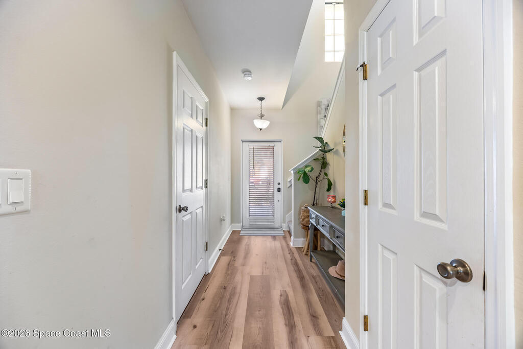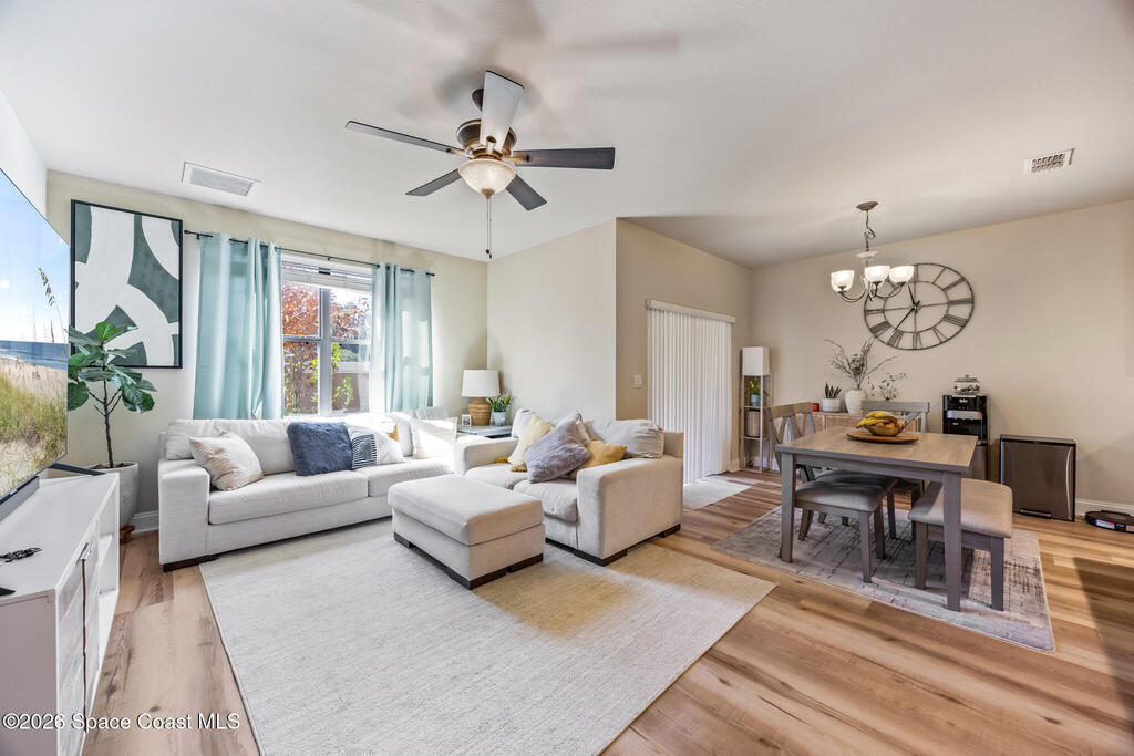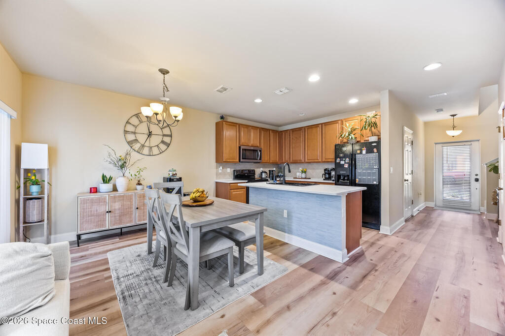 Move-in ready 3-bedroom, 2.5-bathroom townhouse in the highly desirable Meadow Pointe community. Roof 2023 and AC 2018. This townhome offers just under 1,500 square feet of living space. The kitchen features a large island, solid wood cabinets, and ample storage, seamlessly flowing into the dining and living areas. Laminate flooring runs throughout the lower level, while the upstairs features carpet with tile in the bathrooms and laundry room.The spacious primary suite includes two large walk-in closets and an en-suite bathroom with a double sink. The laundry room is conveniently located upstairs, and the washer and dryer are included! Additional features include an attached one-car garage and storm shutters for added protection.The community offers a sparkling pool, and the HOA covers cable, internet, lawn care, exterior building maintenance, roof replacement, common area insurance, and pest control. Located just minutes from shopping, restaurants and other local amenities.