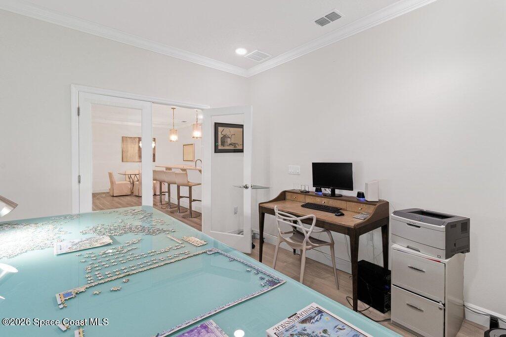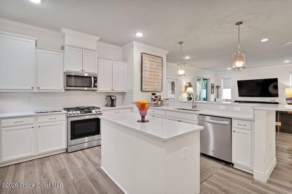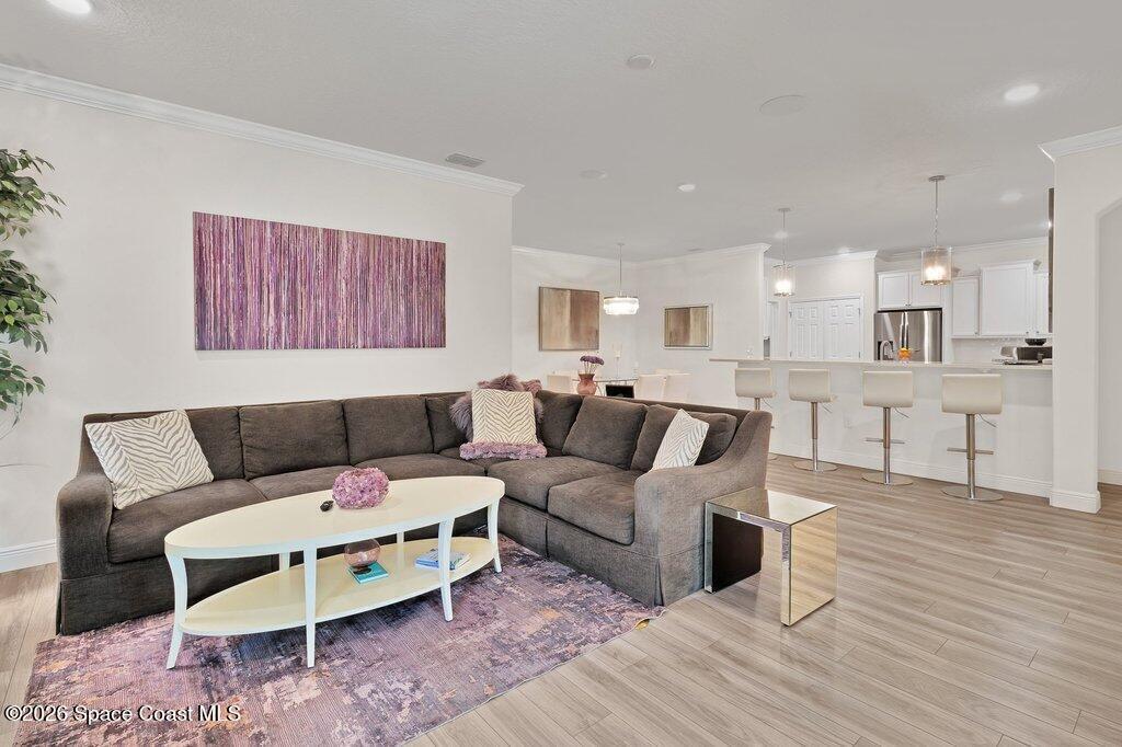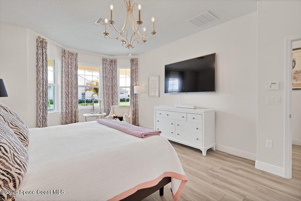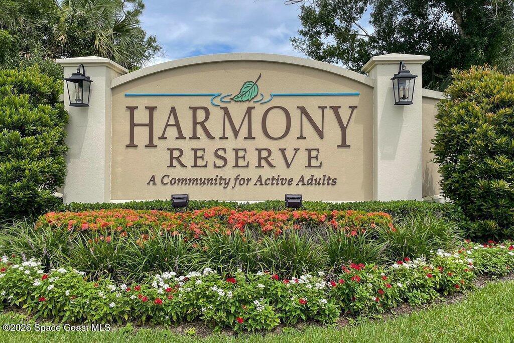 Experience resort-style active adult living in Harmony Reserve's premier 55+ community in this 3-bed, 2-bath plus flex home, spanning a spacious 2,043 SQ FT, this thoughtfully designed single-family home maximizes every inch w/elegant Florida-inspired details. Step into the entry foyer & discover an oversized kitchen featuring dual islands, abundant cabinetry, premium SS appliances, under-cabinet lighting, sleek quartz countertops & generous walk-in pantry. Bedrooms 2 & 3 are privately tucked away at the rear of the home, offering guests their own peaceful retreat. The owner's suite boasts a bay window that floods the space w/natural light & incl a cozy seating area. Enjoy luxury vinyl plank flooring, impact windows, nat gas cooking, custom window treatments, a dedicated irrigation system w/ private well and more. The clubhouse incl heated pool & hot tub, fitness center, vibrant social calendar, game rooms, 8 pickleball courts, bocce ball and plenty of lush green space and scenic lakes