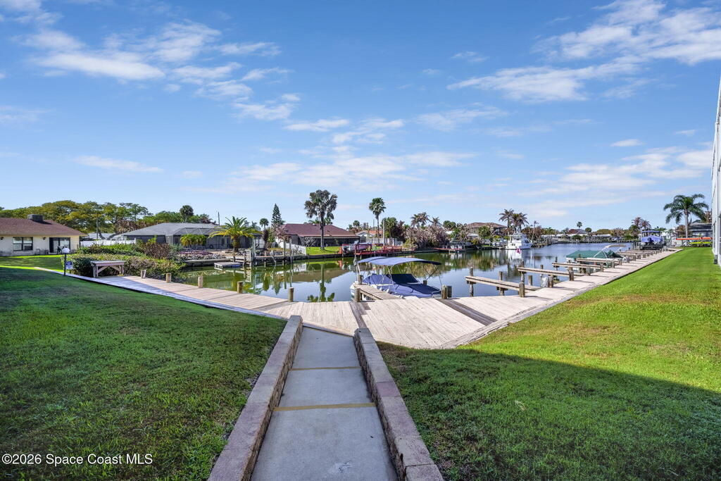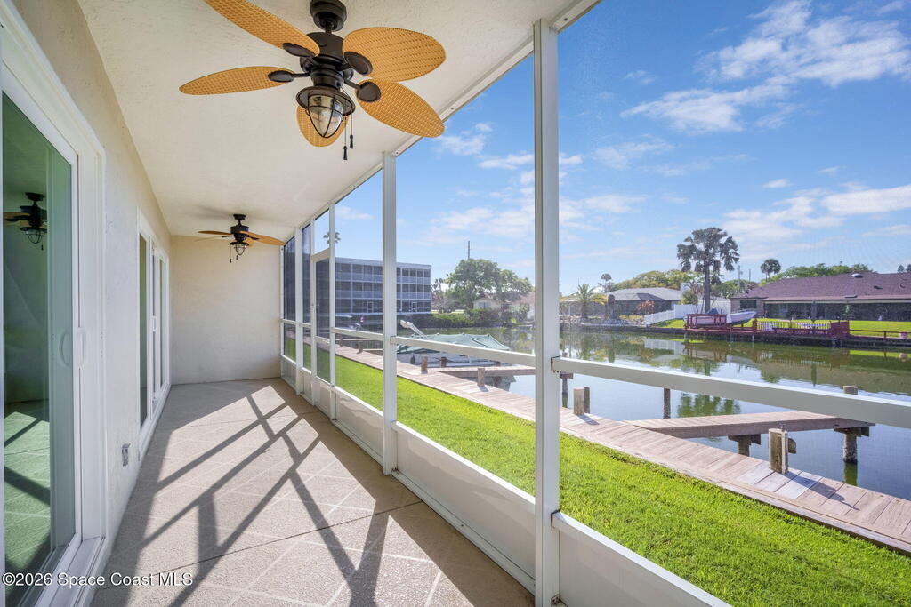 Wake up to dolphins and manatees just outside your door. This direct canal-front first-floor 2BR/2BA at Jamaica Cove offers walk-out access from your screened patio to the waterfront and community docks. Renovated to the studs in 2004 for private owner use and never rented, the home has been carefully maintained. New impact windows and sliding glass doors in 2024 showcase wide canal views from the living area and primary suite. A/C 2022. Tile throughout. Enjoy the solar-heated pool, fishing dock, and clubhouse. Navigable canal with boat access to the Banana River and ocean. No deeded slip, but slips may be available for rent after ownership, subject to availability. Milestone and SIRS completed with no current assessments. Shared 2-car garage. Close to beach, dining, and shopping.